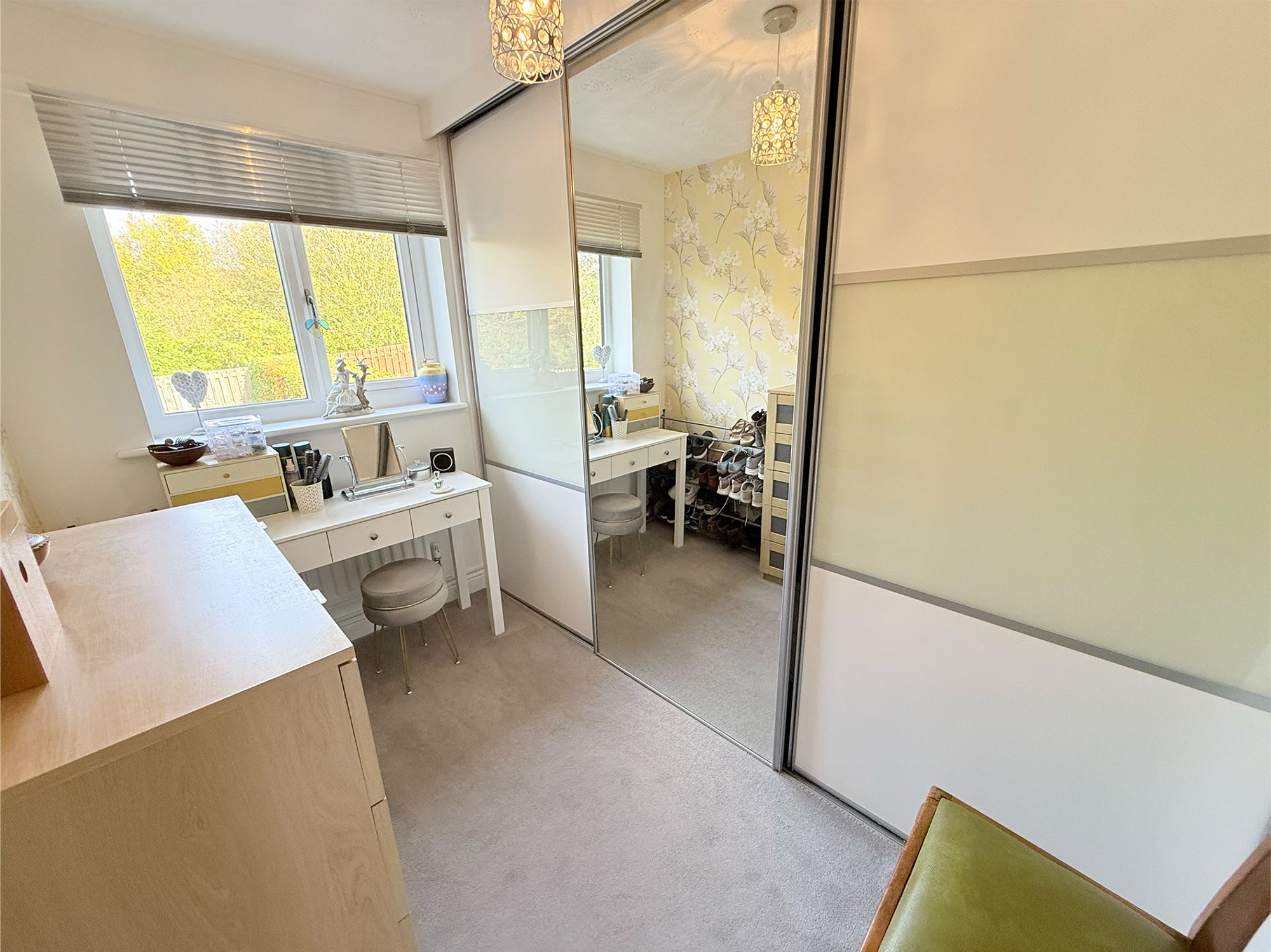 A versatile single bedroom currently used as a dressing room, fitted with floor-to-ceiling sliding wardrobes offering excellent storage. The wardrobes can be removed to create a more flexible bedroom space, ideal for use as a home office, nursery, or dressing room. Decorated in soft neutral tones with a stylish wallpapered feature wall and plush fitted carpet, this room provides both comfort and adaptability.