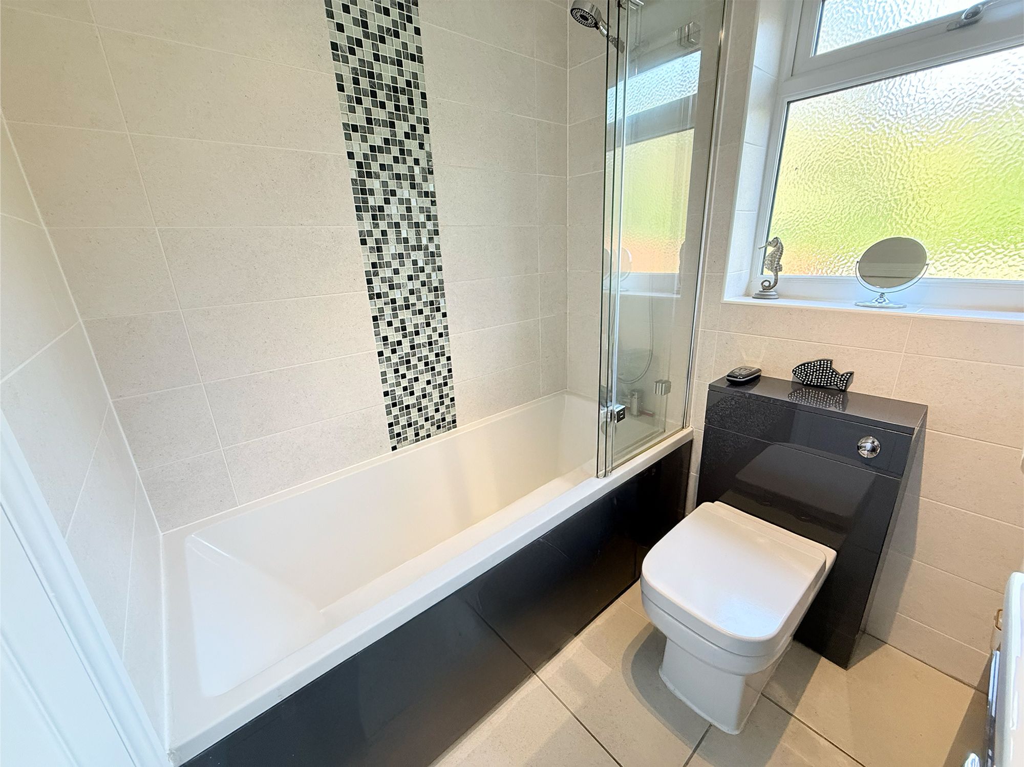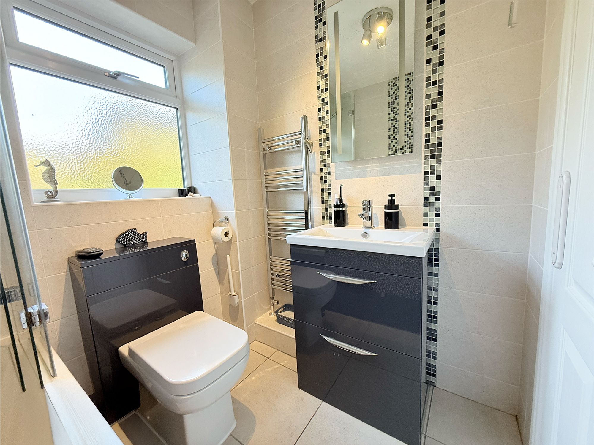 A contemporary family bathroom fitted with a full-sized bath featuring a chrome mixer tap and handheld shower attachment. The suite also includes a modern vanity sink unit, WC, chrome heated towel rail, and an LED illuminated mirror. Finished in elegant neutral tiling with stylish mosaic accent detailing, this space combines functionality with a sleek, modern design.