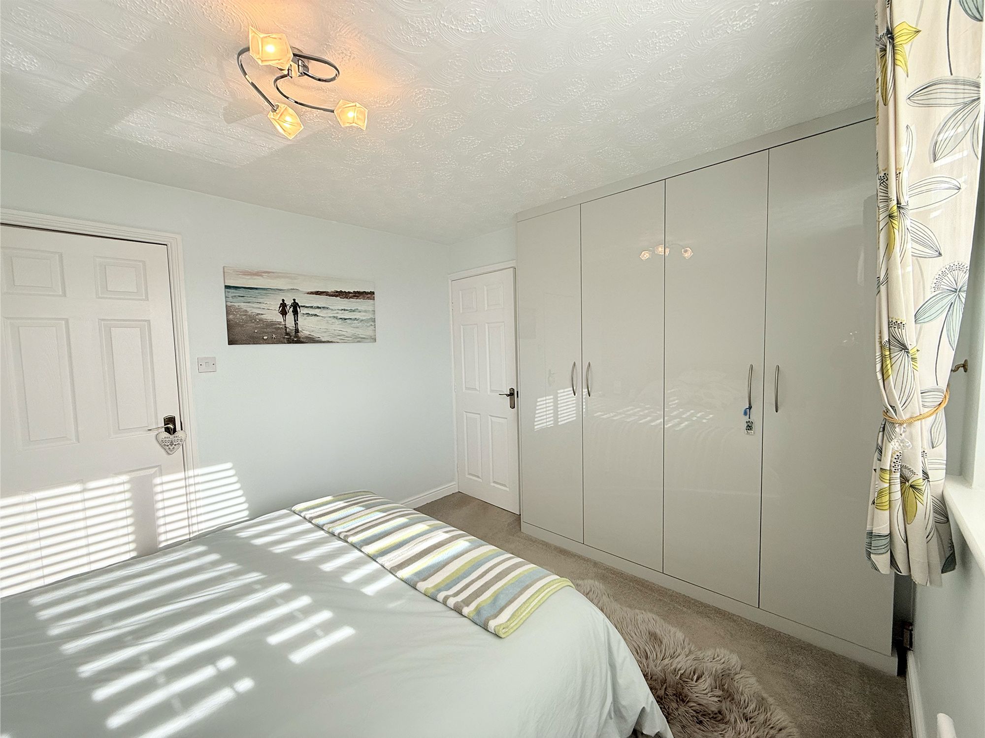 A generously sized double bedroom positioned to the front of the property. This well-proportioned room offers ample space for freestanding furniture and also benefits from a built-in storage cupboard. Tastefully decorated in neutral tones and finished with attractive wood-effect laminate flooring, the room provides a bright and welcoming atmosphere.