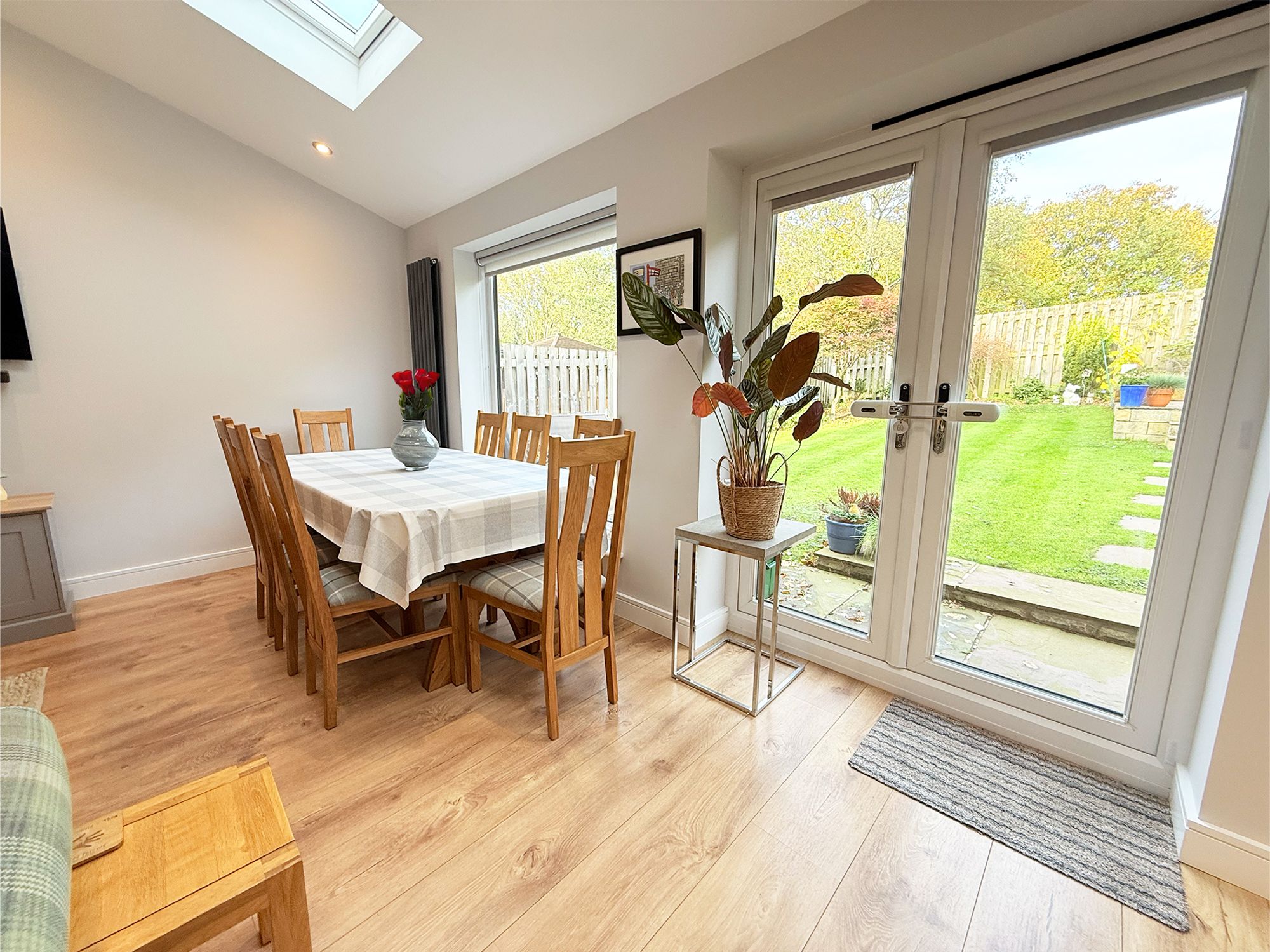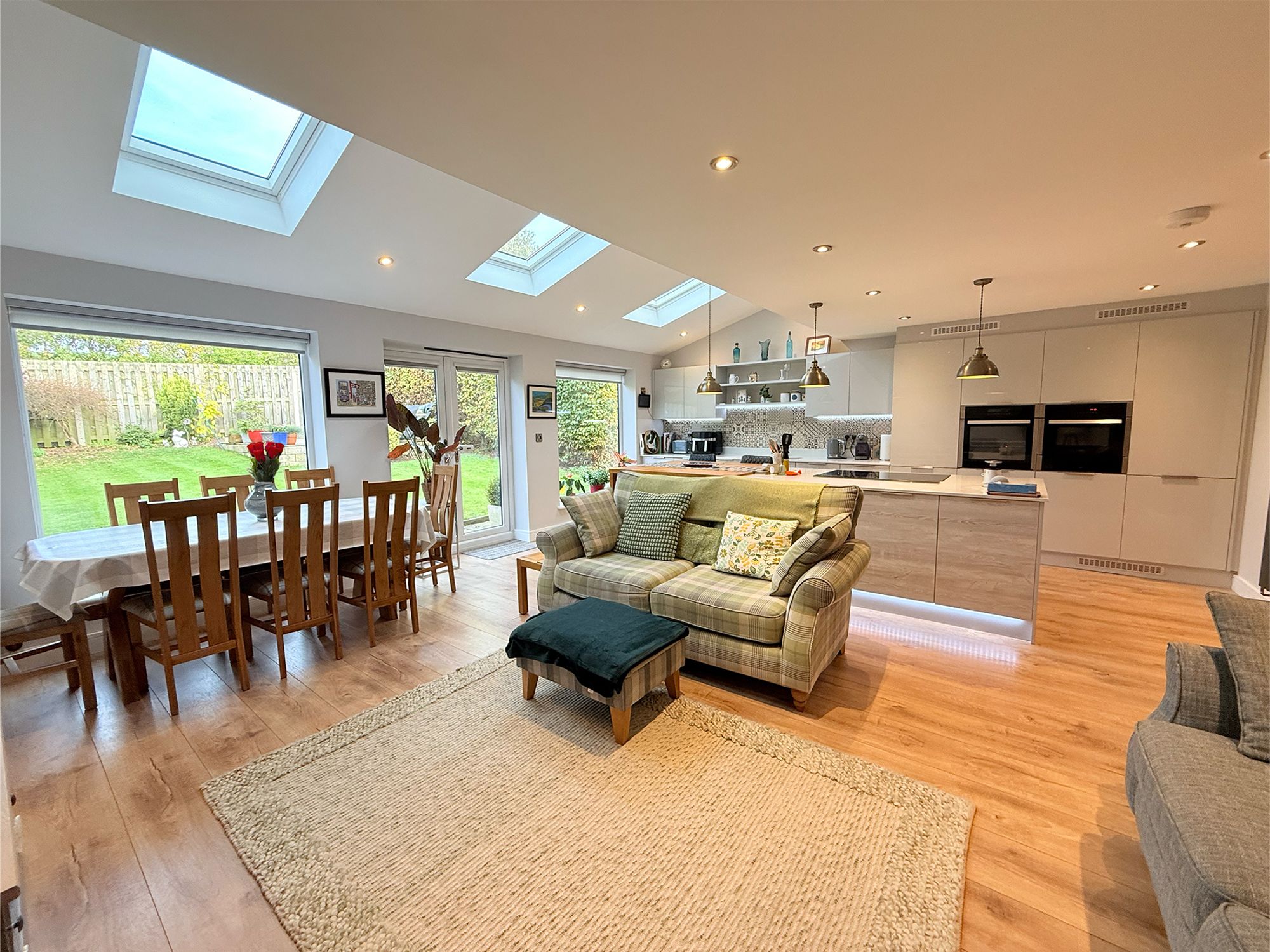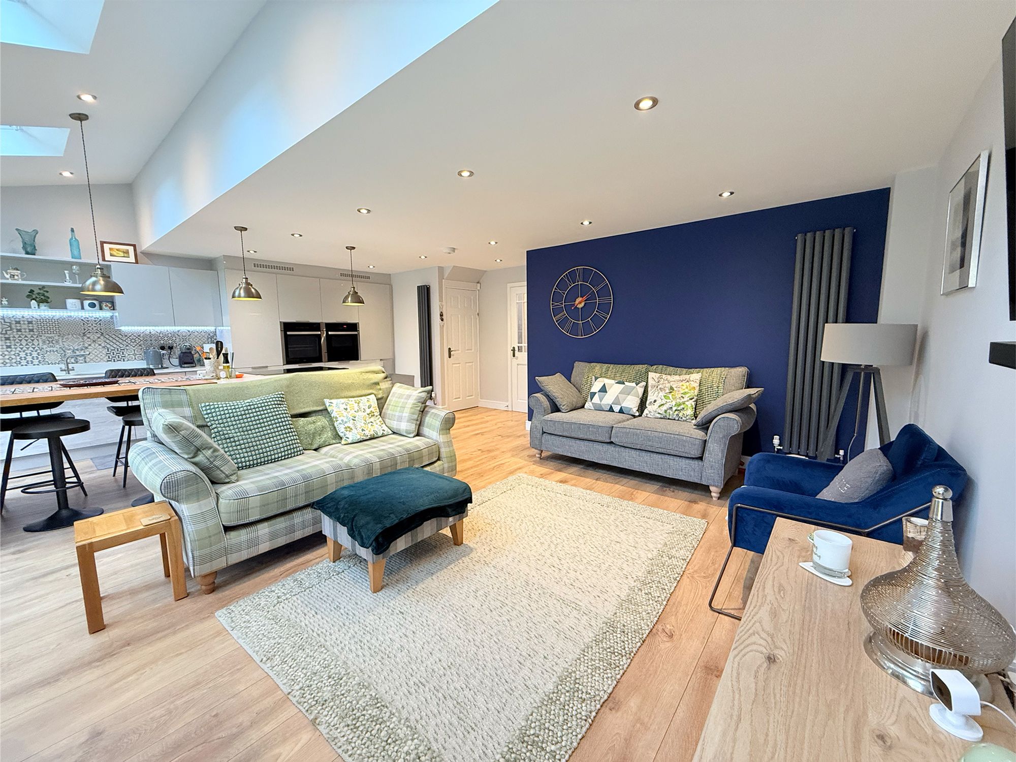 Flowing seamlessly from the kitchen, this spacious open-plan lounge and dining area features the same stylish wood-effect flooring, creating a cohesive and contemporary feel. The flexible layout easily accommodates a full-sized family dining suite along with comfortable seating arrangements. Decorated in neutral tones with a striking feature wall, the space is filled with natural light from Velux windows and French doors that open directly onto the garden. The result is a bright, airy, and inviting setting, perfect for both everyday family living and entertaining.