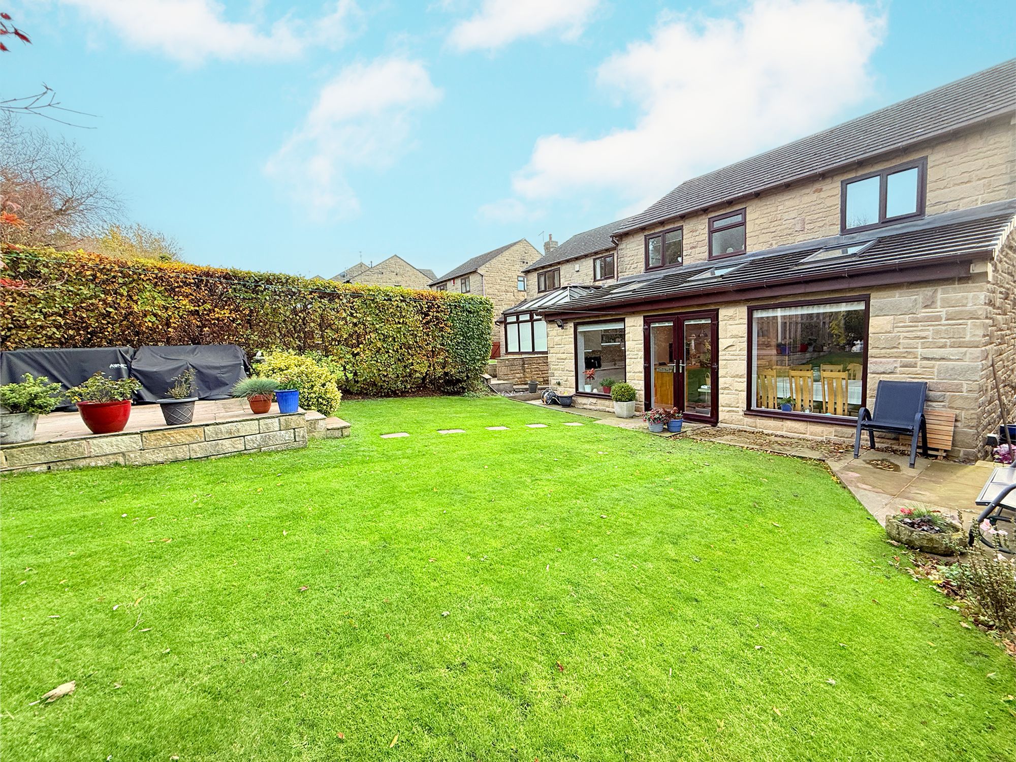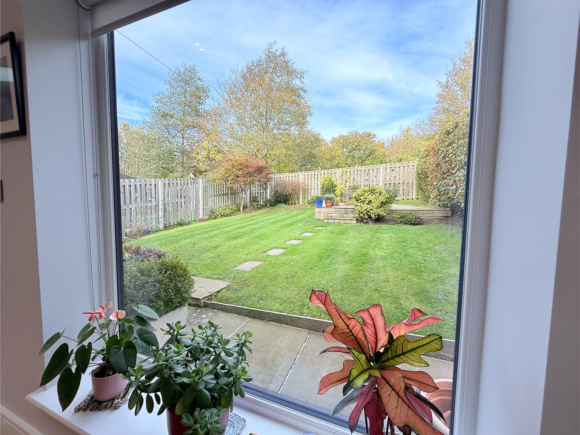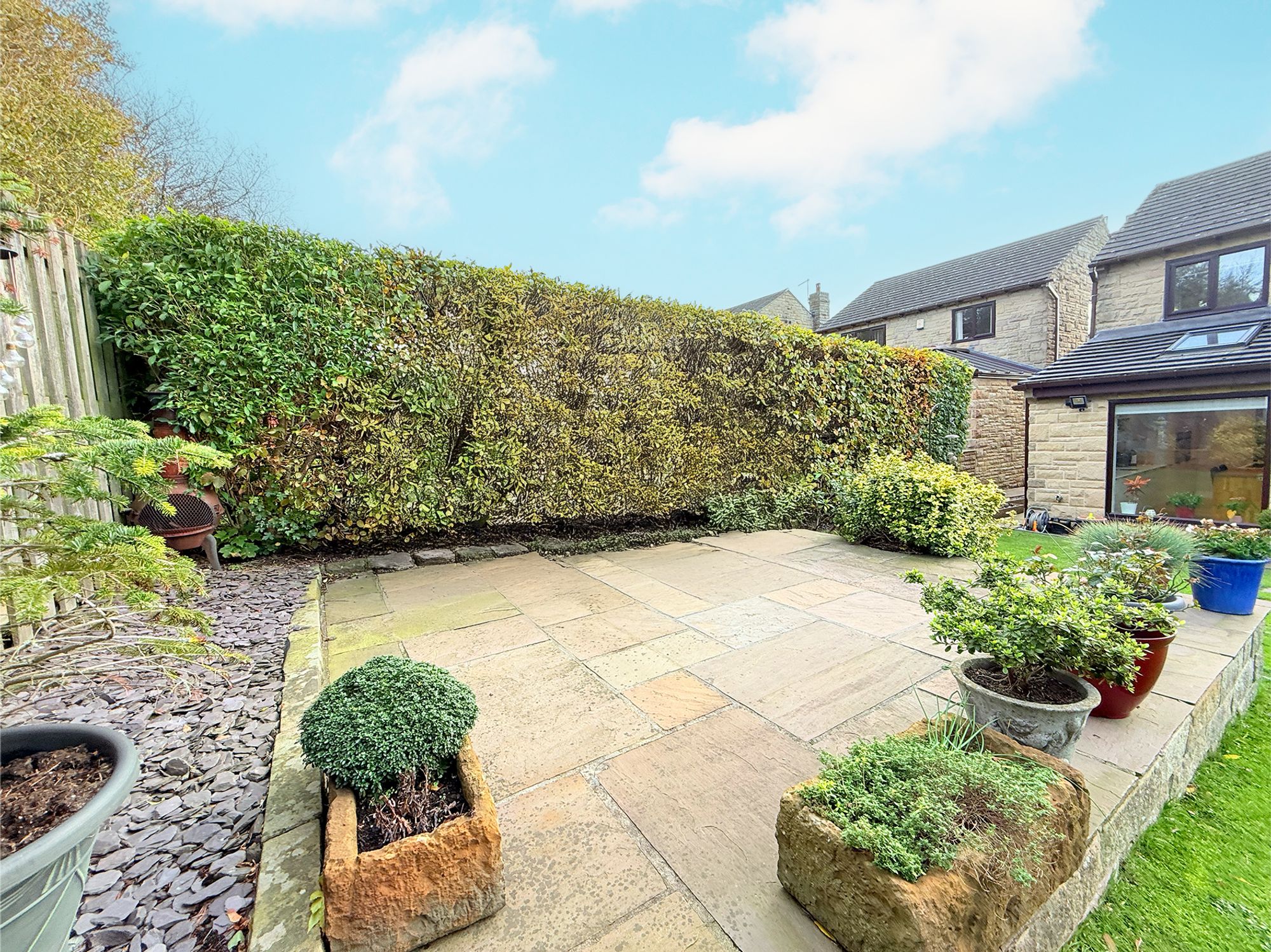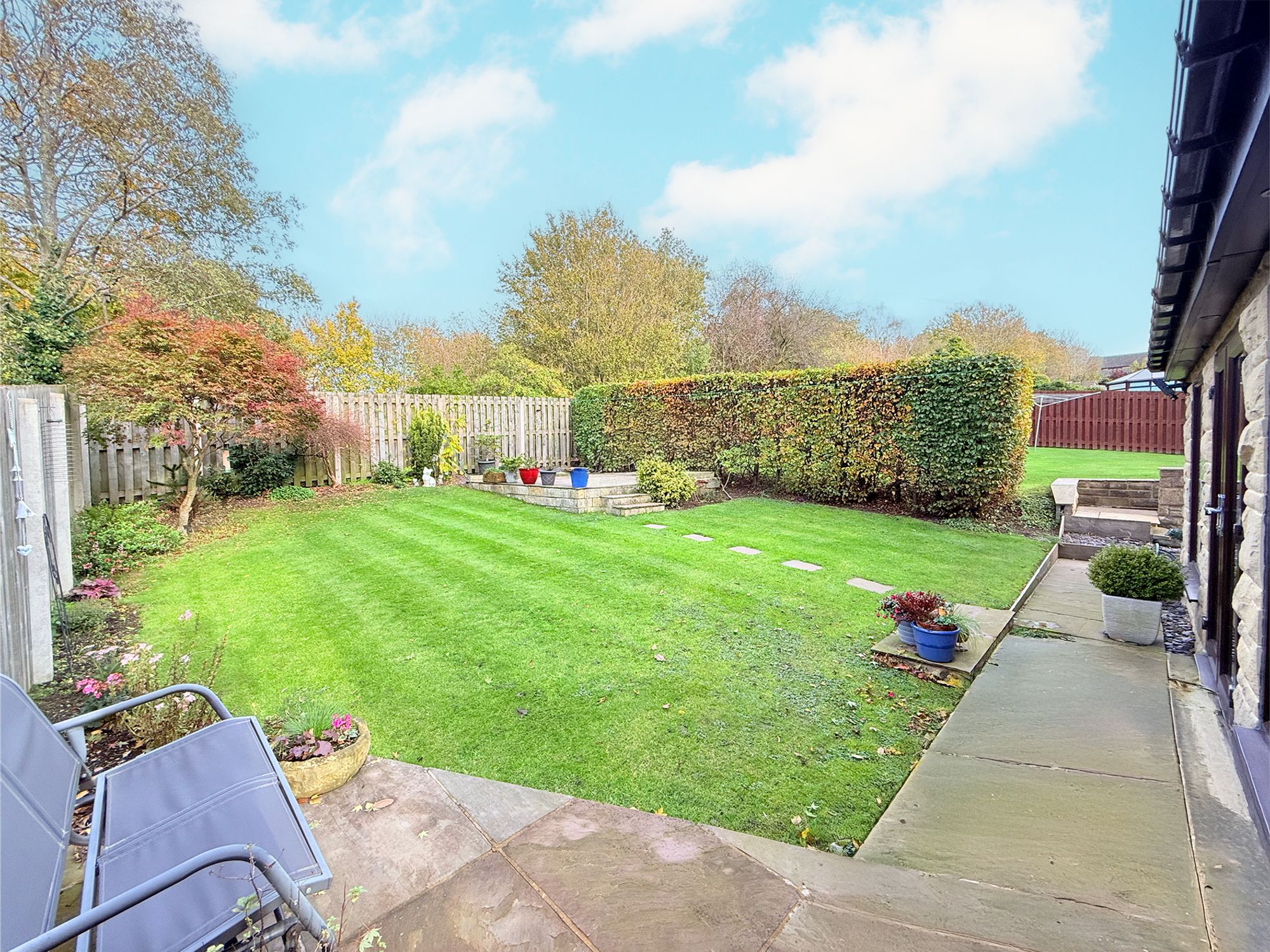 Accessed directly from the open-plan kitchen diner, this generous and private rear garden enjoys a tranquil backdrop of mature woodland. A stone-flagged patio provides the perfect spot for outdoor dining, with stepping stones leading across a manicured lawn to a raised seating area ideal for alfresco dining and entertaining. Gated pathways on both sides of the property provide convenient access to the driveway.