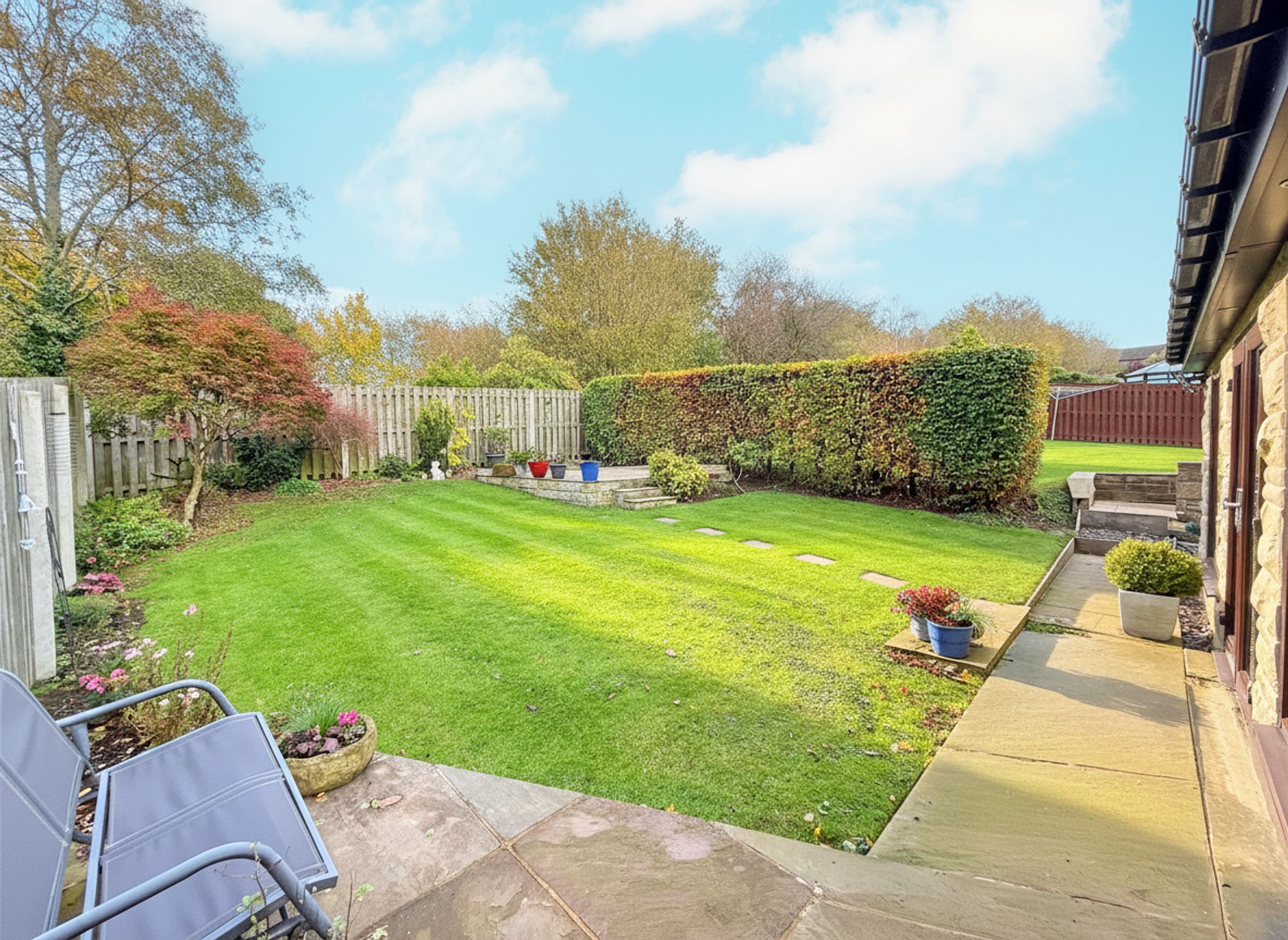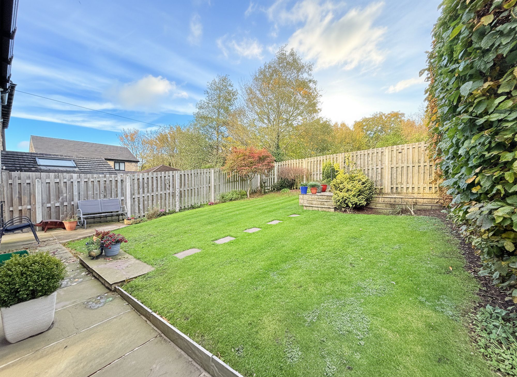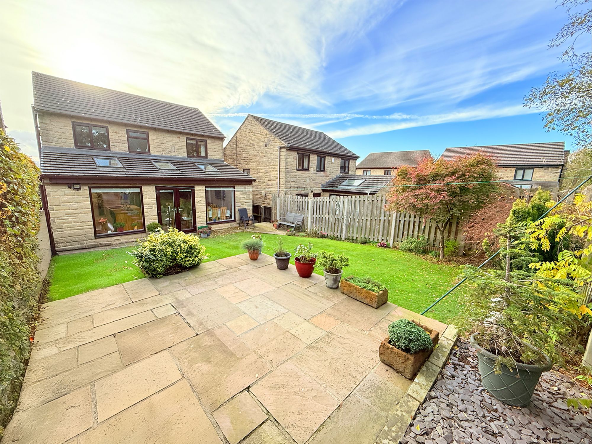 Accessed directly from the open-plan kitchen diner, this generous and private rear garden enjoys a tranquil backdrop of mature woodland. A stone-flagged patio provides the perfect spot for outdoor dining, with stepping stones leading across a manicured lawn to a raised seating area ideal for alfresco dining and entertaining. Gated pathways on both sides of the property provide convenient access to the driveway.