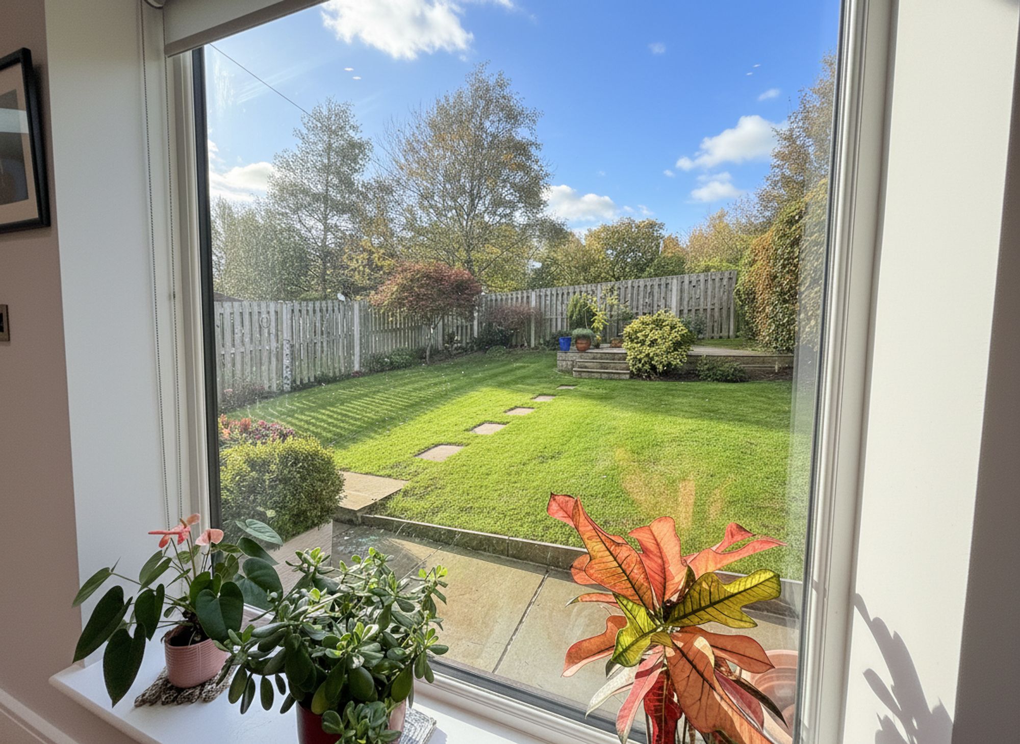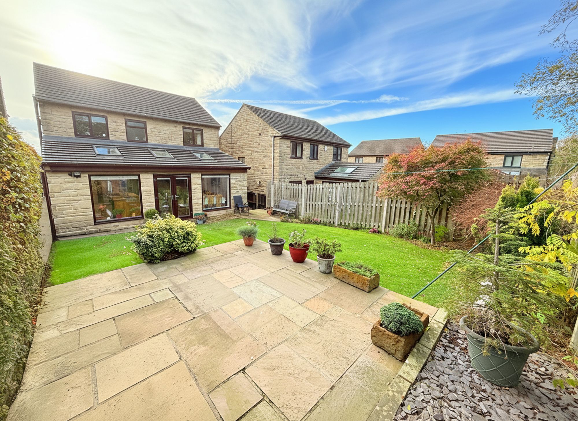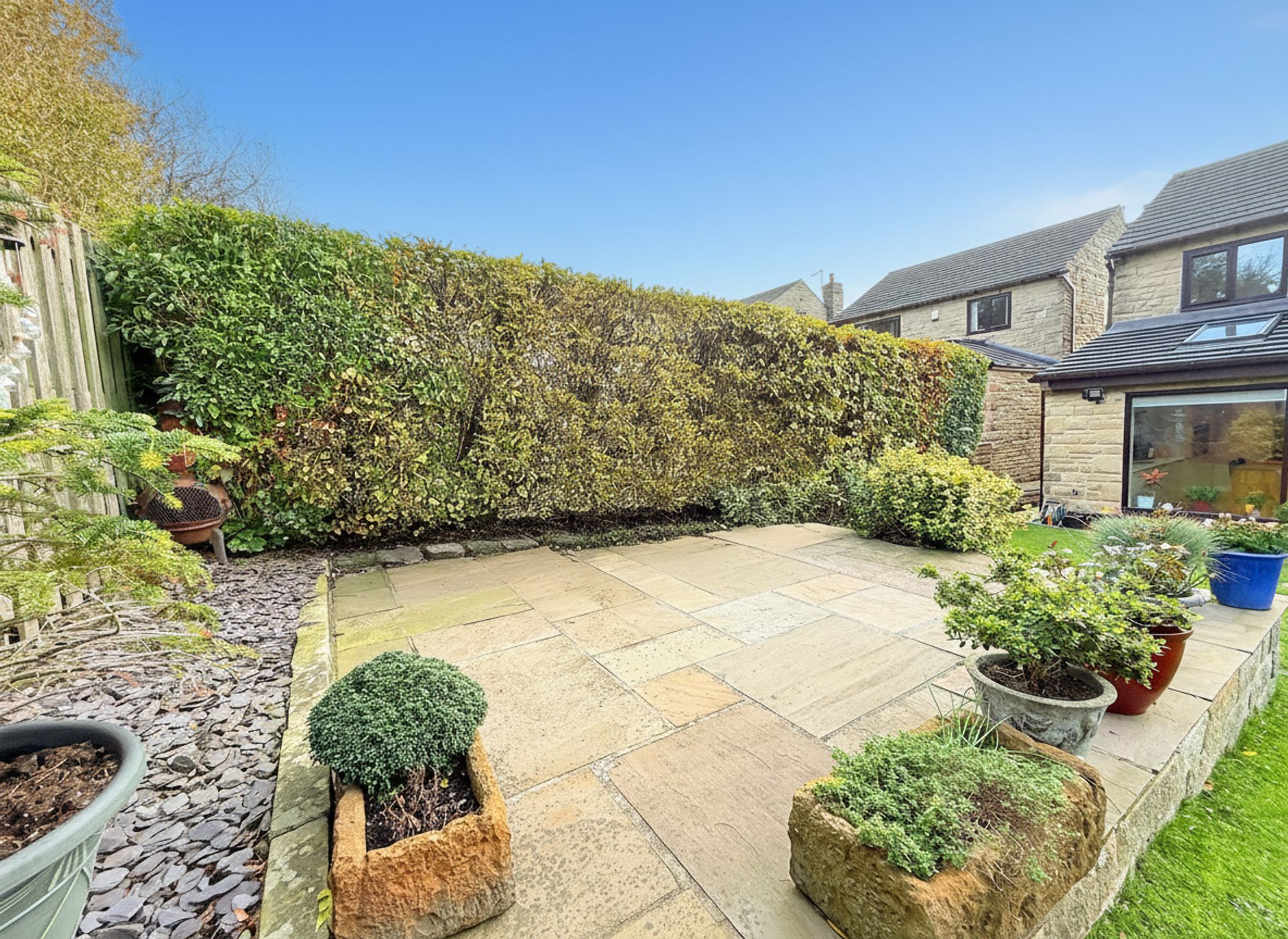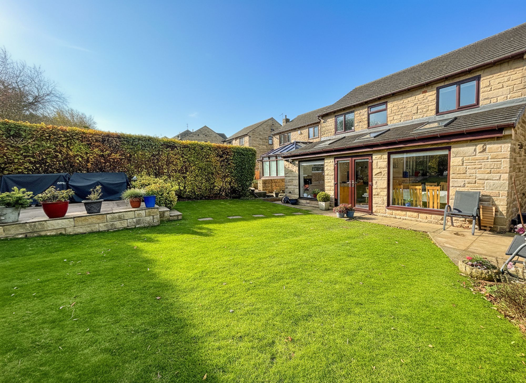 Accessed directly from the open-plan kitchen diner, this generous and private rear garden enjoys a tranquil backdrop of mature woodland. A stone-flagged patio provides the perfect spot for outdoor dining, with stepping stones leading across a manicured lawn to a raised seating area ideal for alfresco dining and entertaining. Gated pathways on both sides of the property provide convenient access to the driveway.