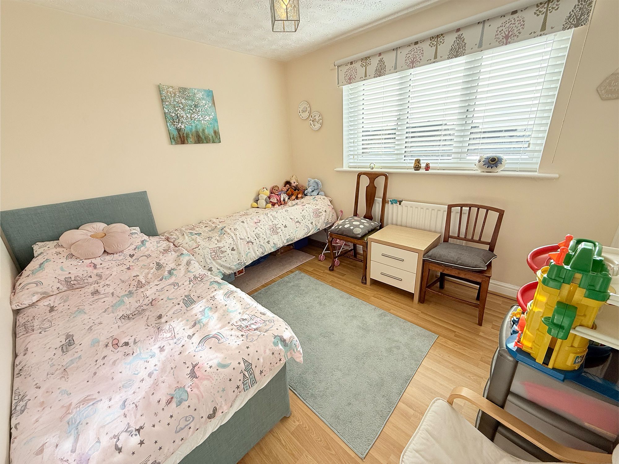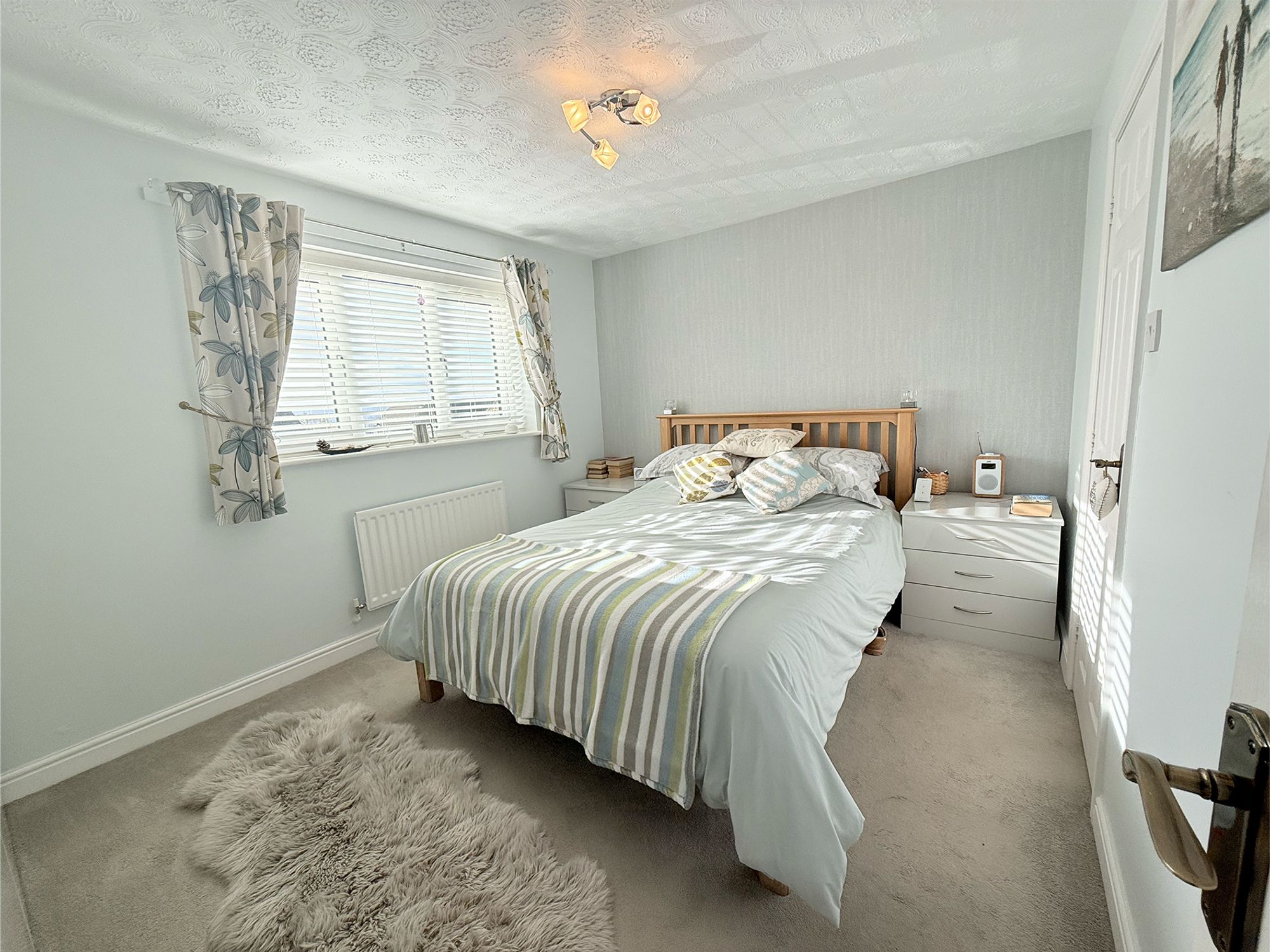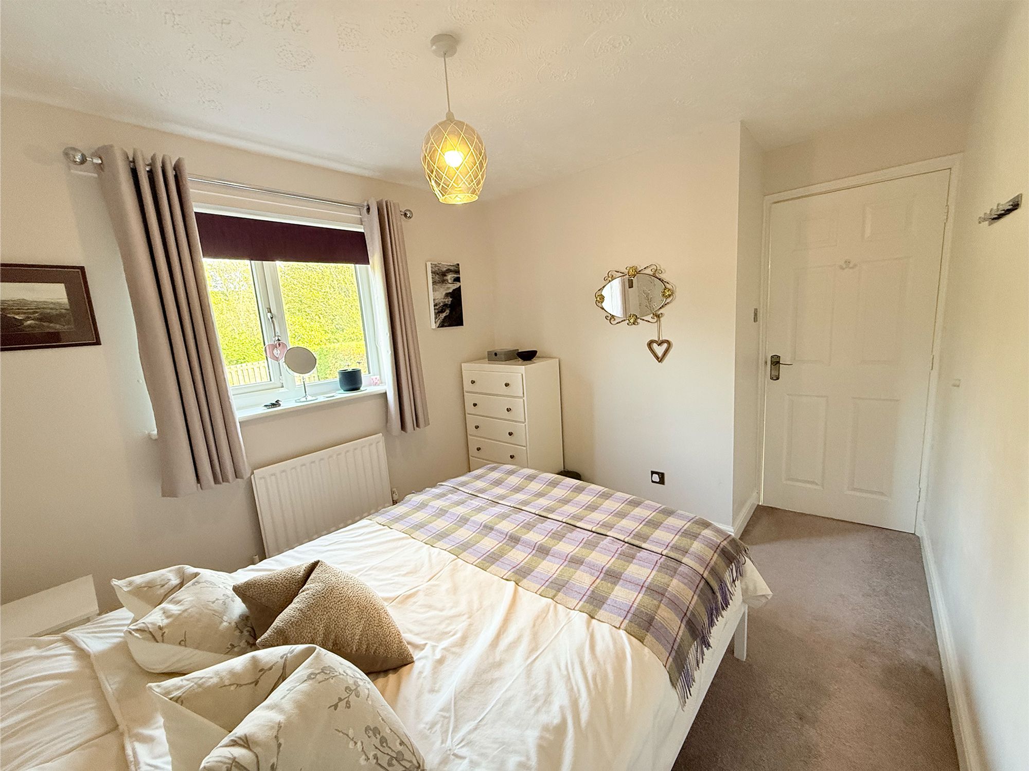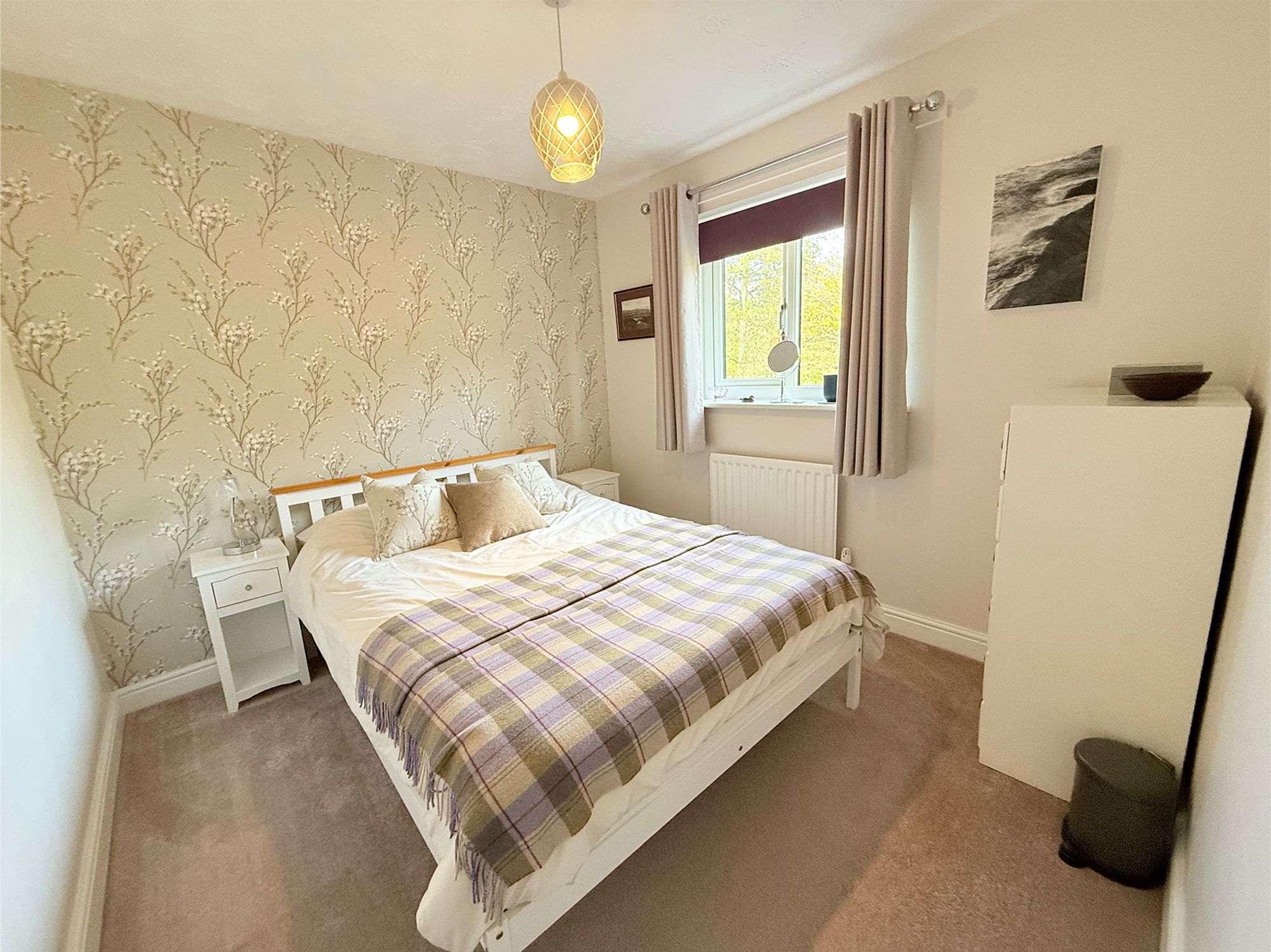 A well-proportioned double bedroom located to the rear of the property, enjoying pleasant views over the garden. Decorated in soft, neutral tones with a complementary wallpapered feature wall, this peaceful space offers ample room for freestanding furniture and provides a calm, relaxing atmosphere.