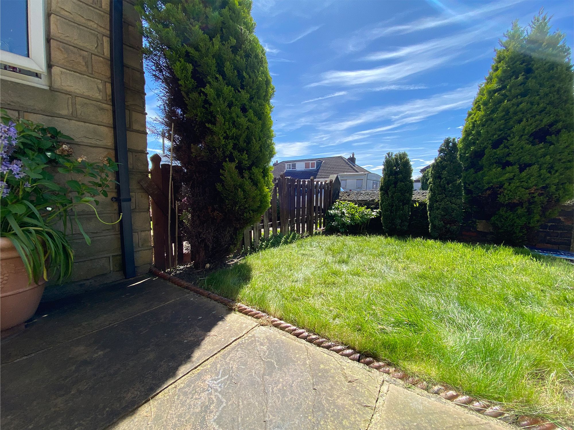 Accessed via a wooden gate, this delightful front garden is mainly laid to lawn and complemented by a charming patio area, perfect for enjoying a morning coffee or relaxing outdoors.
