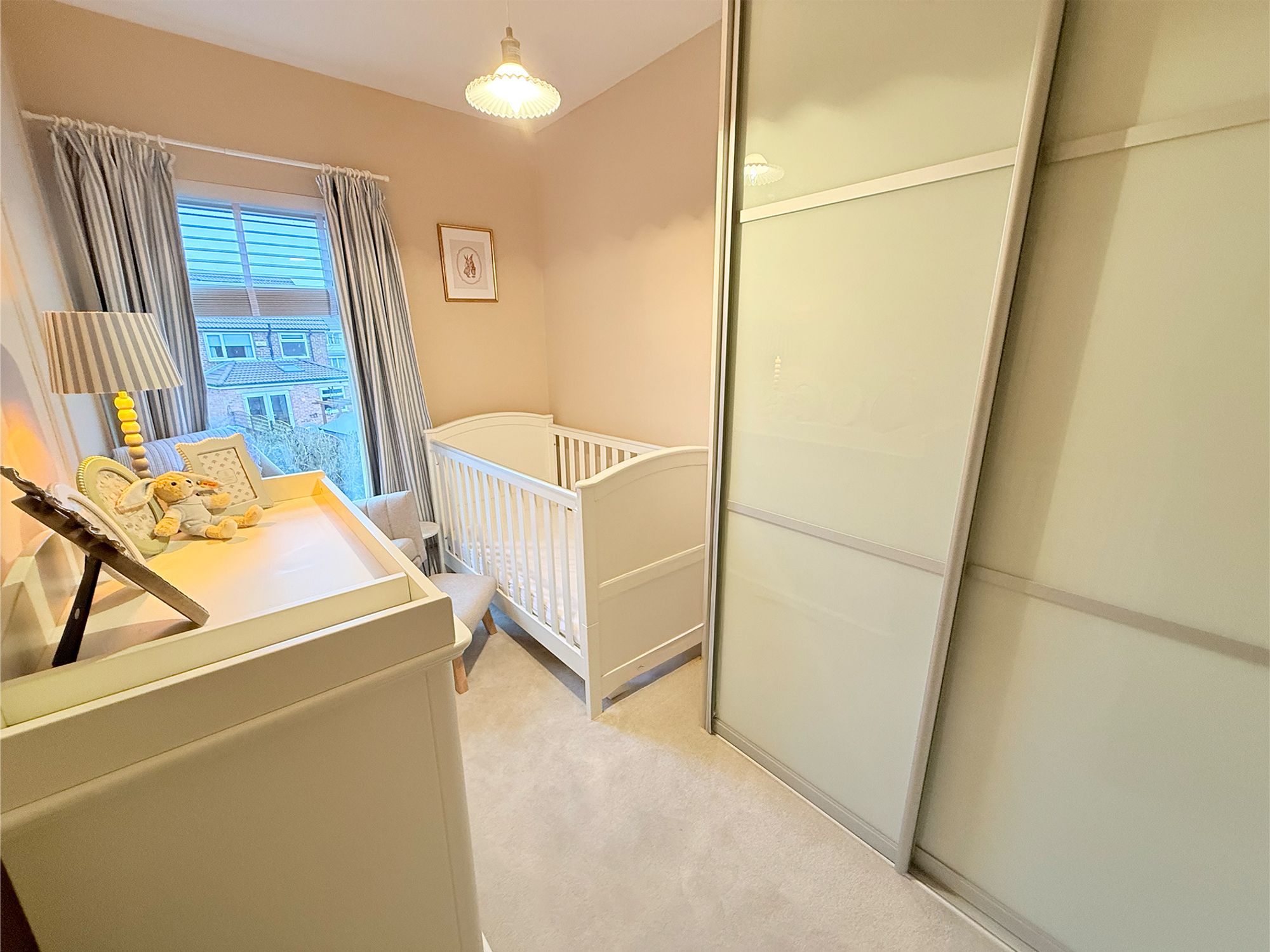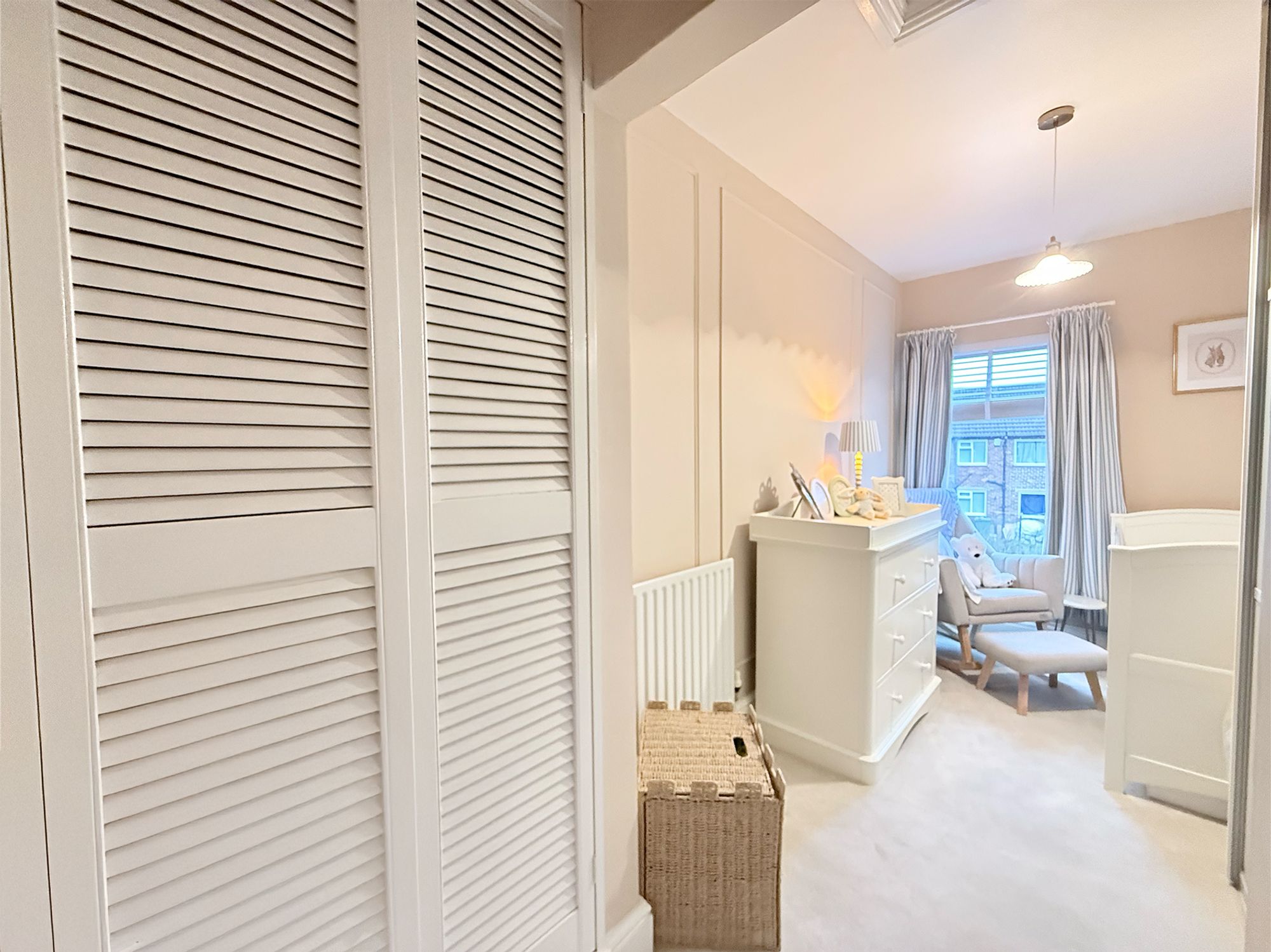 Located to the rear of the property and currently used as a nursery, this well-proportioned bedroom offers ample space for freestanding furniture and has the flexibility to accommodate a double bed if desired. The room is fitted with floor-to-ceiling sliding wardrobes along with additional built-in storage, while still allowing further space for freestanding furniture. Finished in soft, neutral tones with plush carpeting, the room also provides access to the loft via a convenient loft hatch.