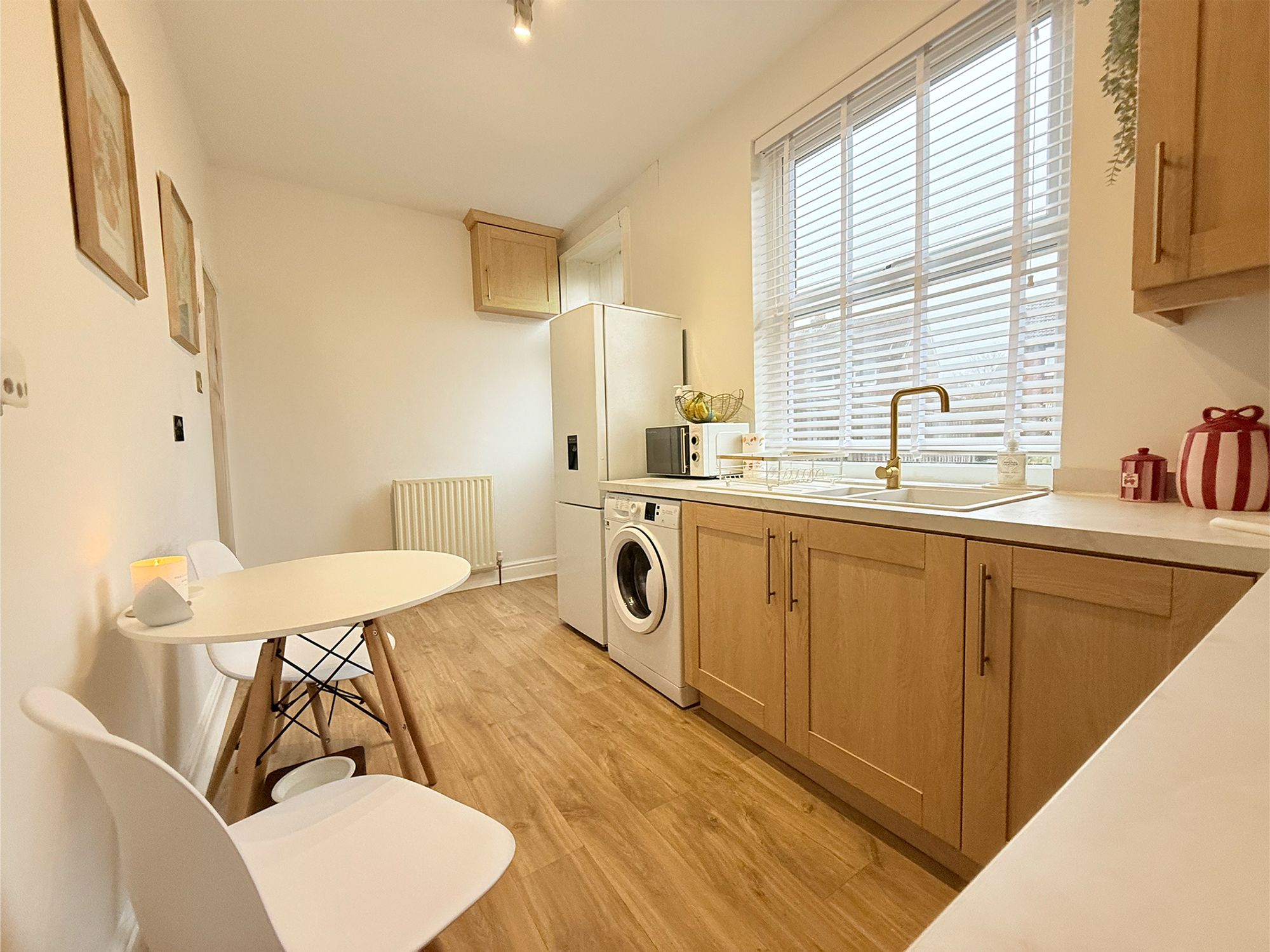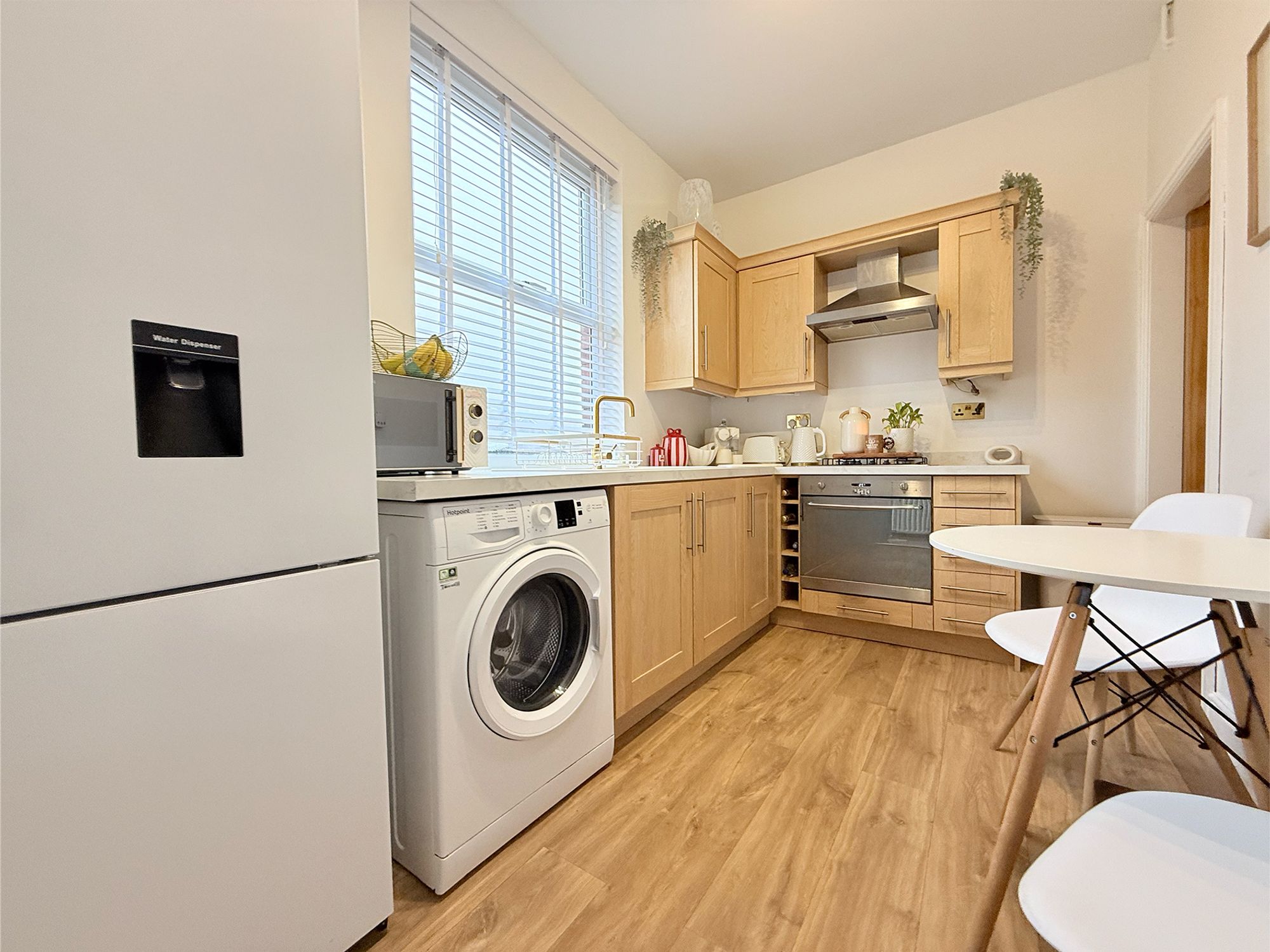 Located to the rear of the property and spanning the full width of the home, this spacious kitchen offers ample room for a dining table, making it ideal for everyday family living. The kitchen is fitted with wood-effect cabinetry and newly fitted marble-effect worktops and sink, and is equipped with an electric oven and four-ring gas hob. There is dedicated space for a washer/dryer and a freestanding fridge freezer. Finished in neutral tones with wood-effect laminate flooring, the kitchen also benefits from built-in wine storage, access to the cellar, and an external door providing convenient access to the rear of the property.