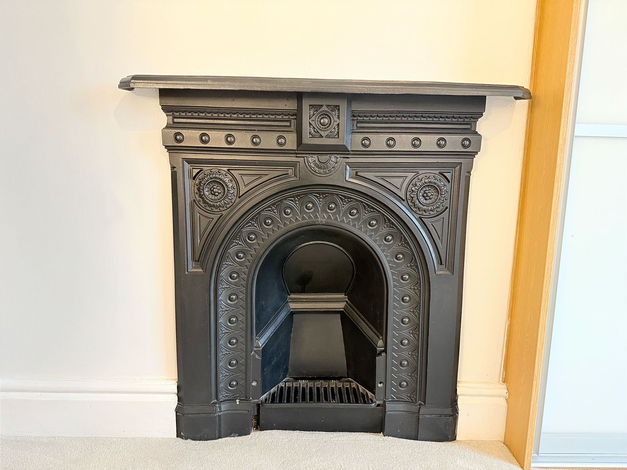 Located to the front of the property and spanning the full width of the home, this extremely spacious double bedroom benefits from dual-aspect windows, allowing for an abundance of natural light. Finished in neutral tones with plush carpeting, the room features floor-to-ceiling sliding wardrobes and an original decorative fireplace. There is ample space for a king-size bed along with additional freestanding furniture.