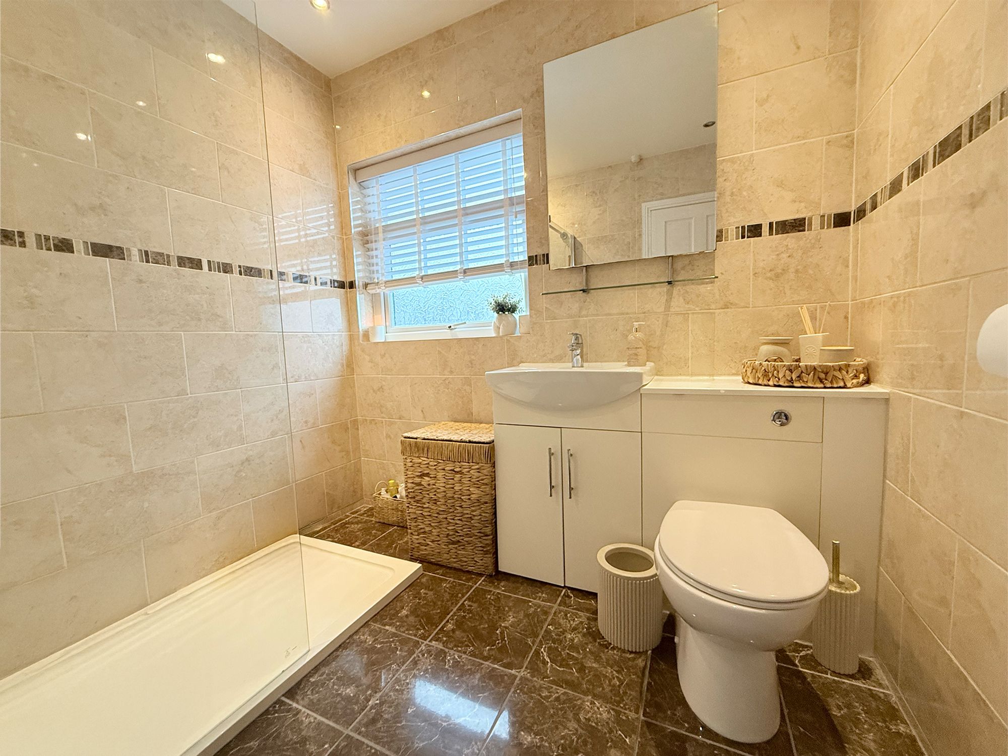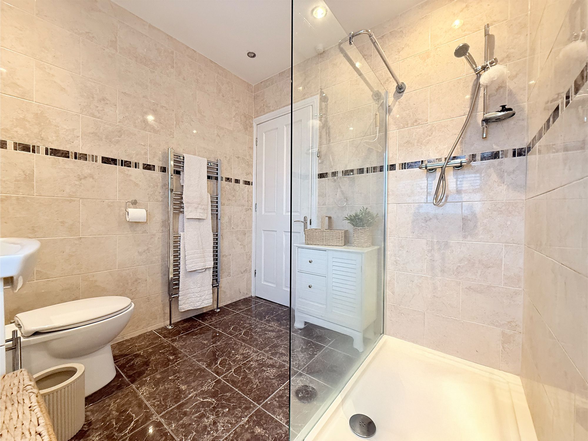 Located to the rear of the property, this stunning modern shower room is finished in neutral wall tiling with contrasting tiled flooring. The room is fitted with a walk-in shower featuring a handheld shower attachment, along with a sleek vanity sink unit with chrome mixer tap and WC, both providing useful storage. Additional features include a chrome heated towel rail and ample space for further freestanding storage.