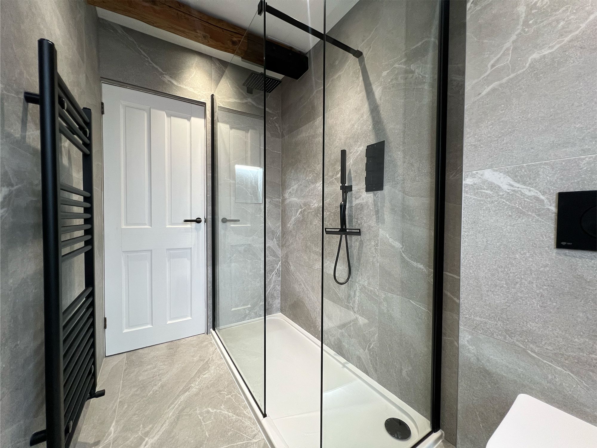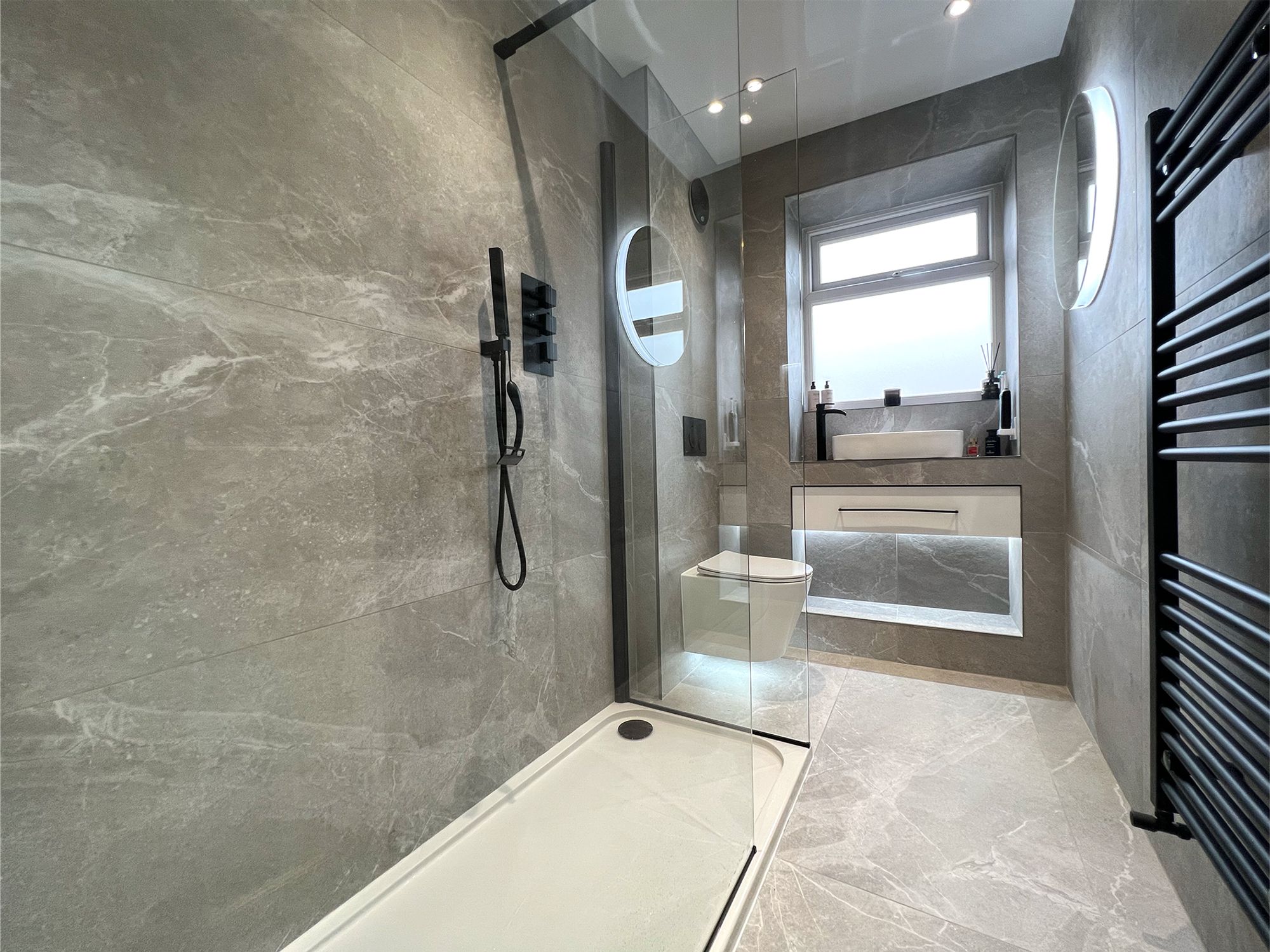 A beautifully designed contemporary shower room, fitted just two years ago, offers a perfect blend of modern luxury and serene style. The spacious walk-in shower, complete with a soothing rainhead fitting and separate hand-held attachment, is softly illuminated by an inset shelf that casts a gentle glow, highlighting sleek surfaces and offering practical storage for daily essentials. The modern wash basin is paired with illuminated cabinetry beneath, while the WC and black heated towel rail complement the room’s refined aesthetic. Fully tiled in elegant grey tones and accented with sophisticated black fixtures and fittings, the space feels effortlessly chic. A built-in speaker adds an indulgent finishing touch, allowing you to enjoy music or mellow tones as part of your daily ritual (available by separate negotiation).