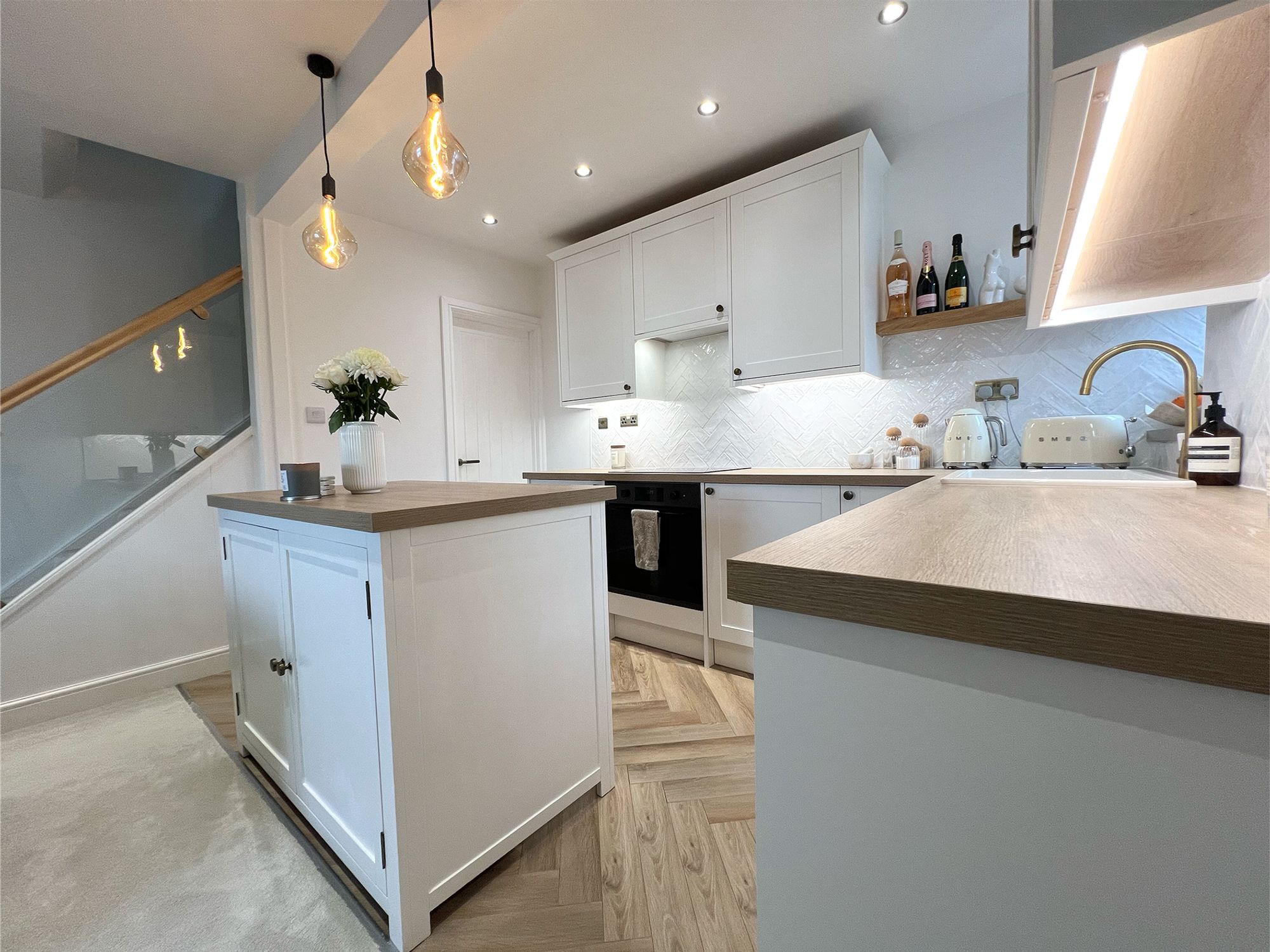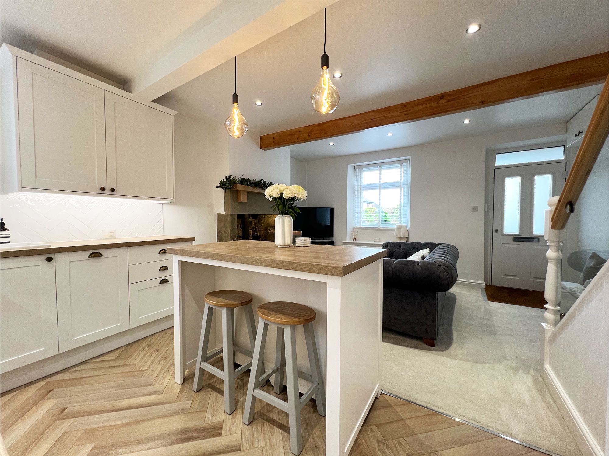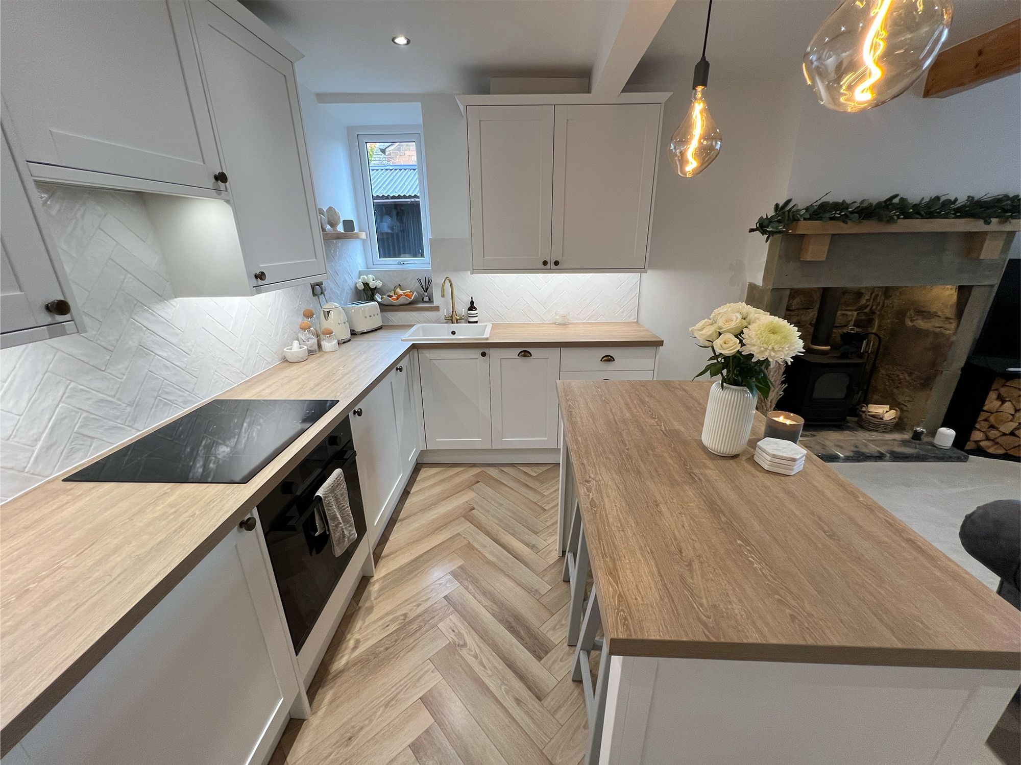 The kitchen, newly fitted just two years ago, combines classic charm with contemporary practicality. It features elegant white shaker-style units finished with antique brass accessories, wood-effect work surfaces, and a stylish herringbone tiled splashback. Integrated appliances include an electric oven, induction hob with extractor above, pot sink with mixer tap, slimline dishwasher, and fridge. A central island offers the perfect setting for casual dining or social gatherings, with additional storage cleverly incorporated beneath.