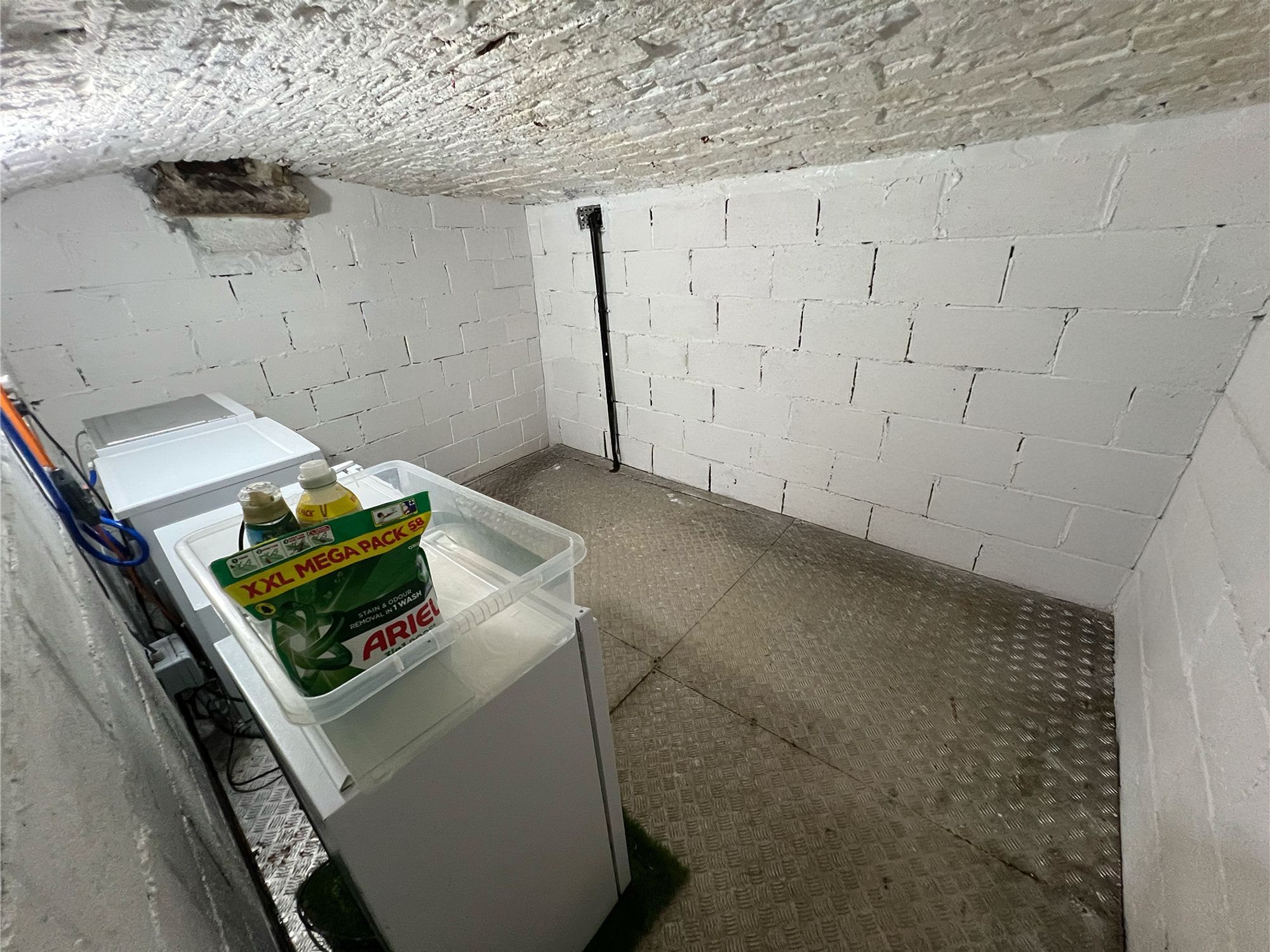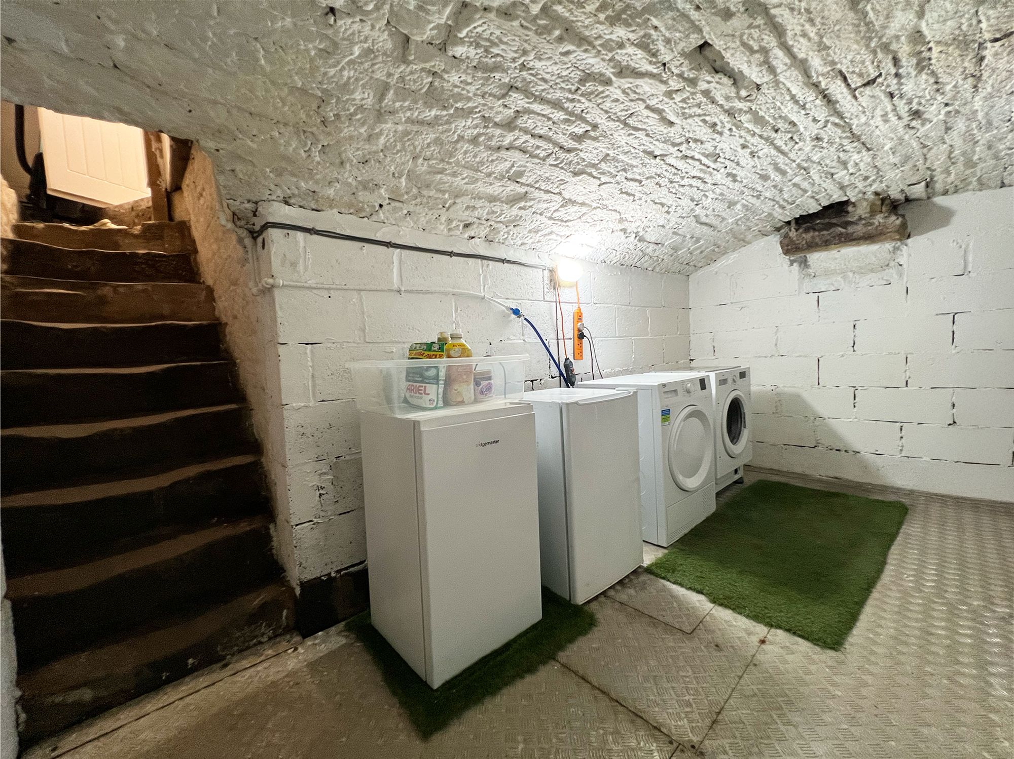 Stone steps lead down to the cellar, which benefits from a power supply and plumbing for a washing machine. This versatile vaulted space is currently utilised as a utility area and features a raised metal floor with drainage, a practical and well-considered addition that enhances functionality while retaining the cellar’s characterful charm.