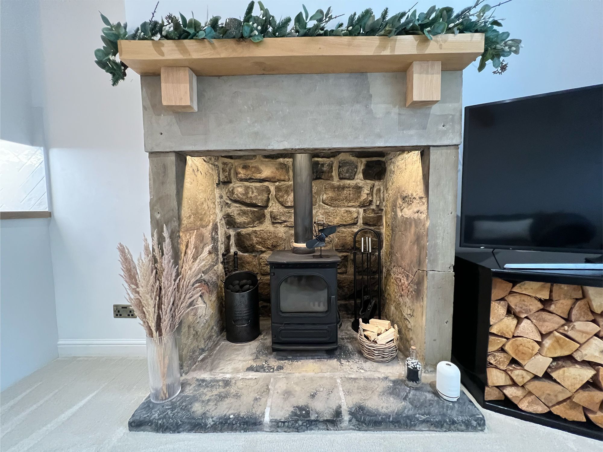Upon entering the property, you are greeted by a stunning open-plan living, dining, and kitchen space that immediately envelops you in the cottage’s distinctive sense of style and comfort. Decorated in soft, neutral tones, the room exudes warmth and serenity, creating a welcoming atmosphere for both relaxation and entertaining. At the heart of the space sits a beautiful inglenook fireplace with an exposed stone surround, housing a charming log-burning stove, an inviting focal point for cosy evenings.