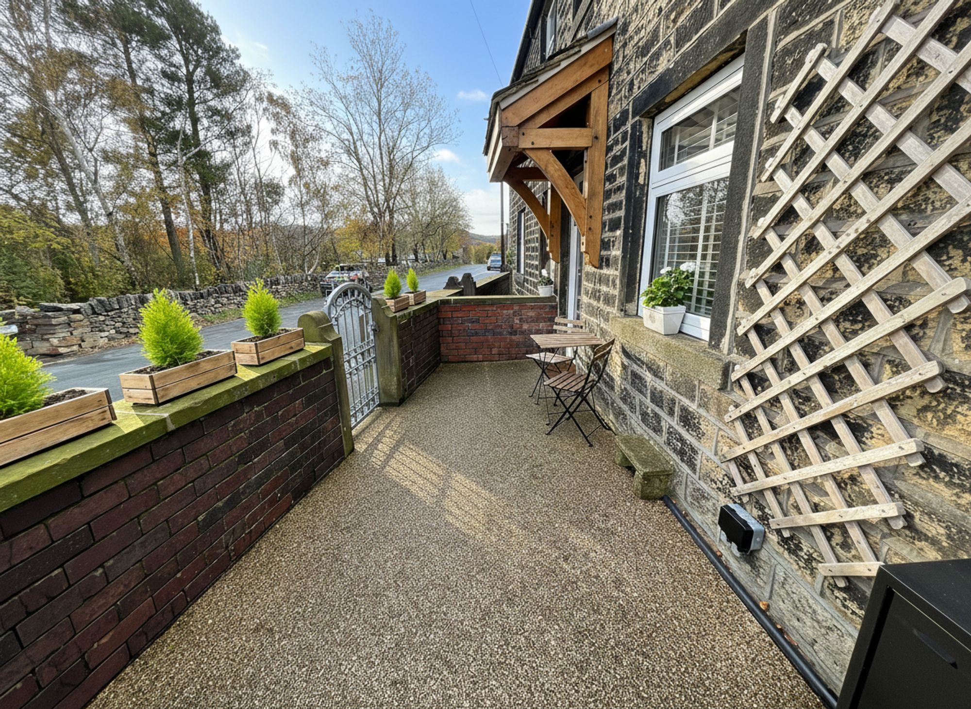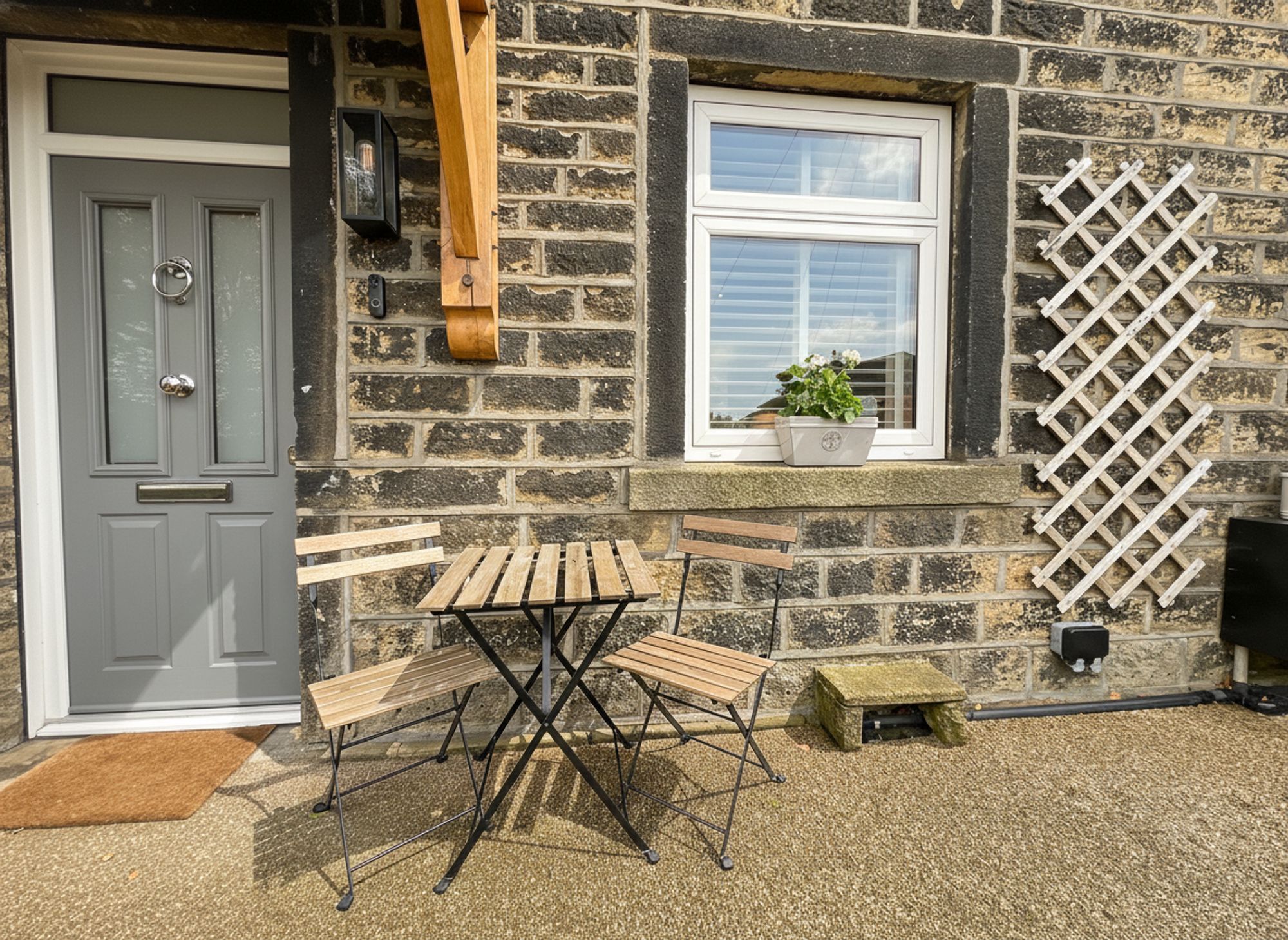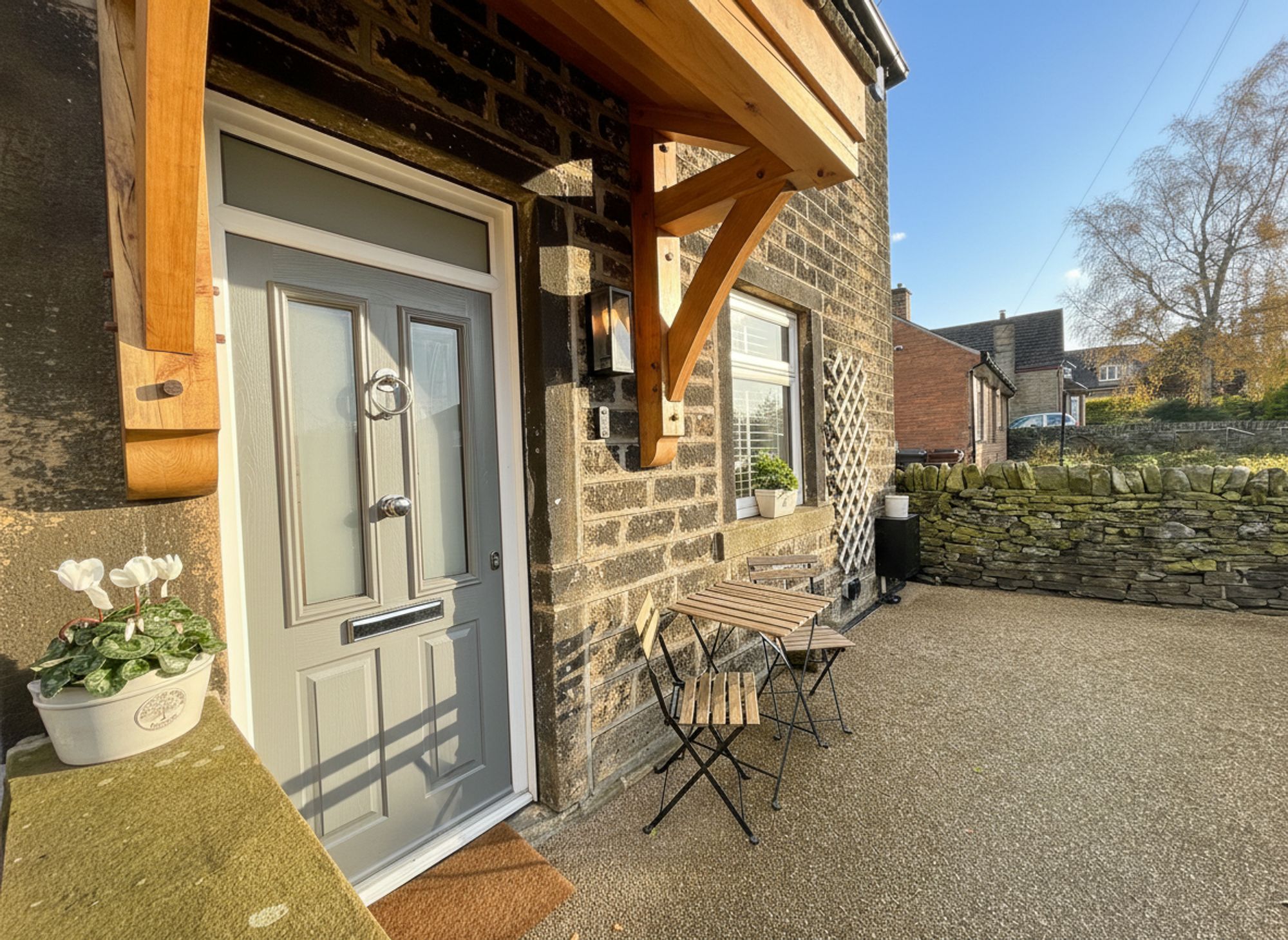 To the front of the property is an enclosed patio area, ideal for planters or a barbecue, and spacious enough to comfortably accommodate a bistro table and chairs, perfect for enjoying a morning coffee or evening drink outdoors.