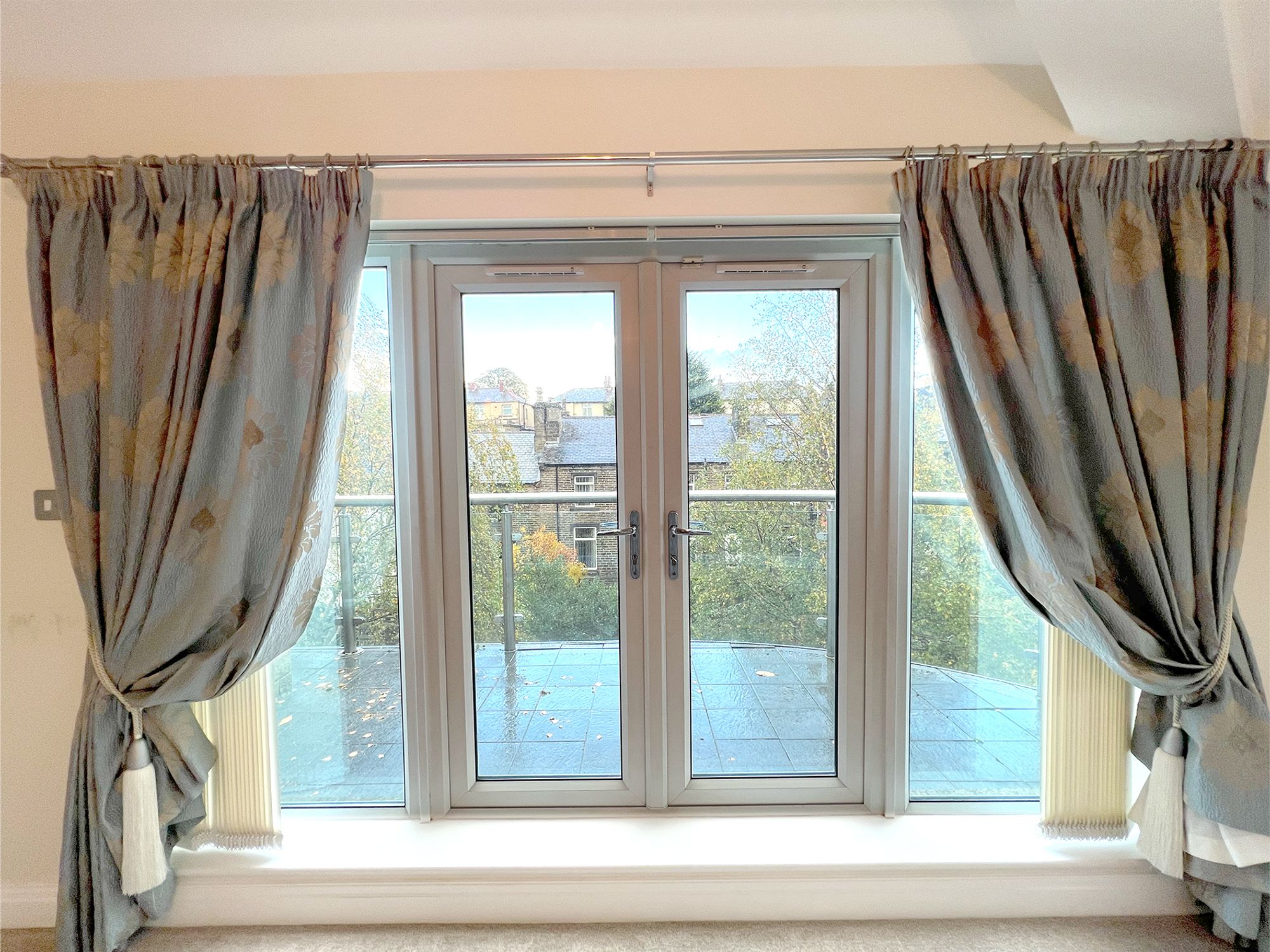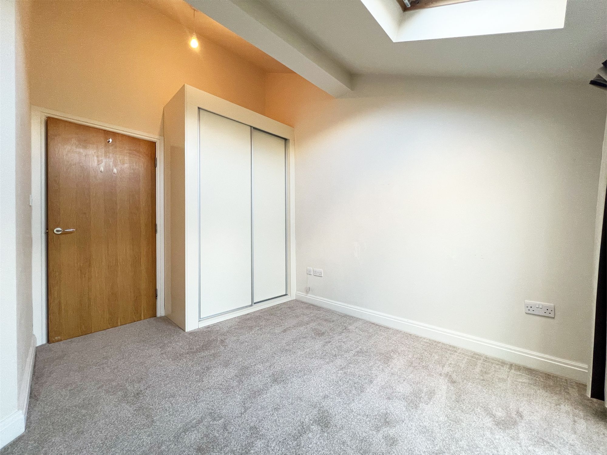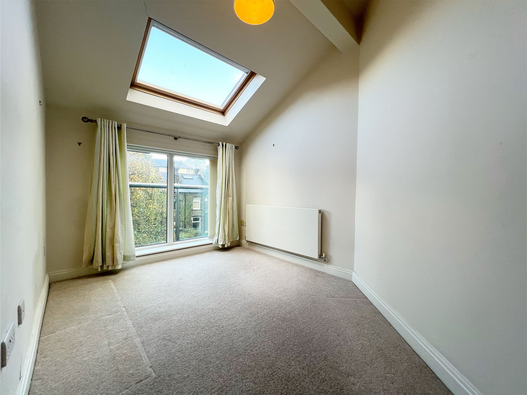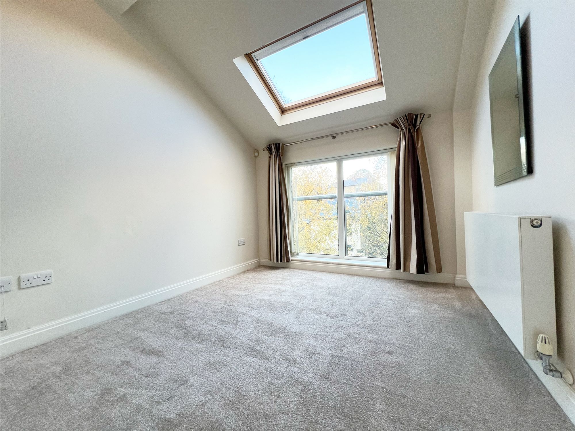 Flooded with natural light courtesy of the large Velux window and additional windows framing delightful views of the balcony, this generously sized room is beautifully presented in neutral tones. Offering ample space for a variety of freestanding furniture, it provides a calm and versatile setting.