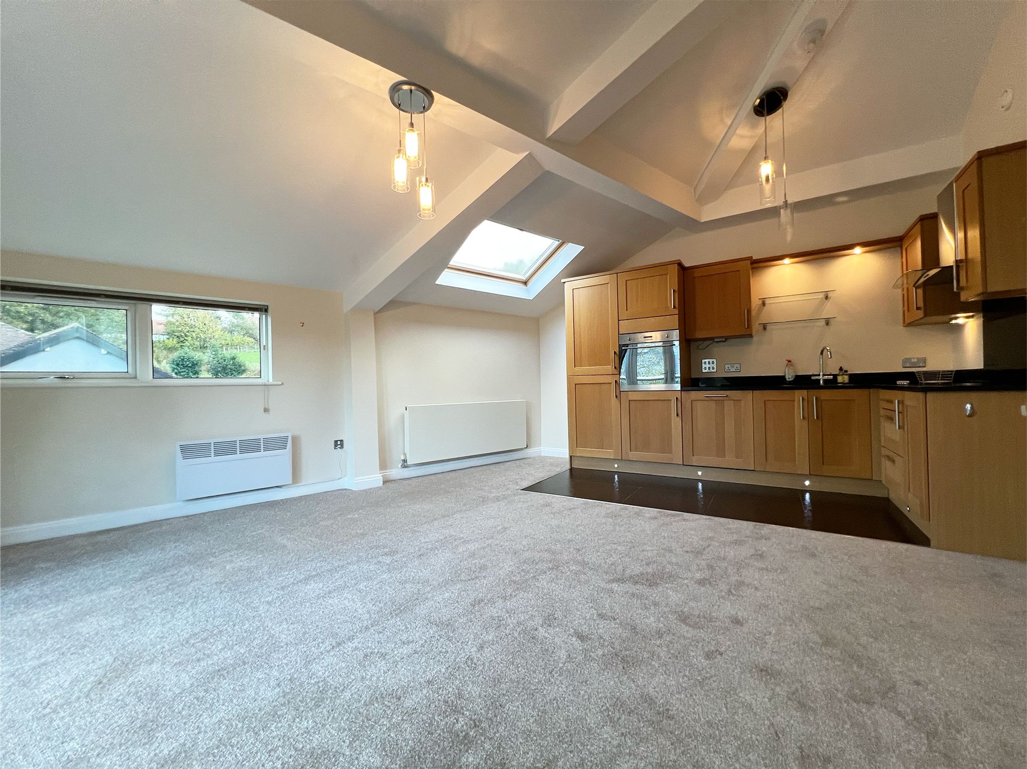 Flooded with natural light, this impressive space is enhanced by large windows and beautiful patio doors that open onto a delightful balcony, creating a seamless connection between indoors and out. The kitchen is fitted with a range of oak units, complemented by granite work surfaces for a timeless and high-quality finish. Integrated appliances include a fridge freezer, electric oven, dishwasher, and sink with mixer tap, along with a Smeg four-ring electric hob and stainless steel extractor above. Generous in size and presented in soft neutral tones with a cream carpet underfoot, the room offers ample space for a variety of lounge and dining furniture, making it as functional as it is elegant, a perfect setting for both relaxing and entertaining.