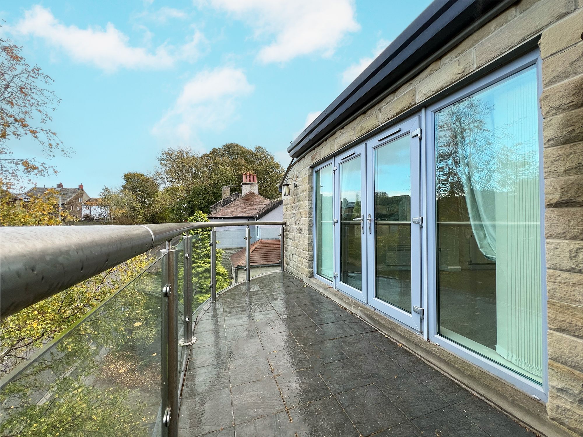 A generously sized bedroom, beautifully appointed with fitted sliding wardrobes providing excellent storage. Velux and feature windows fill the room with natural light and frame lovely views of the balcony, creating a bright and tranquil atmosphere.