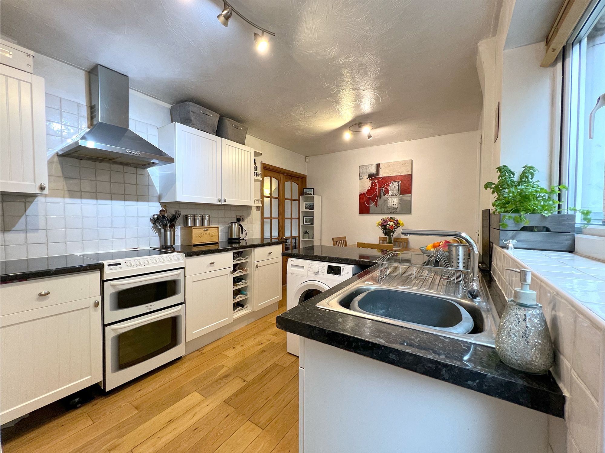 A very sociable dining kitchen, fitted with a range of classic white shaker-style units complemented by contrasting work surfaces. Integrated appliances include a stainless steel sink with mixer tap, space for a freestanding cooker and fridge freezer, along with plumbing for a washing machine. Offering ample room for a family-sized dining suite, this inviting space is ideal for both everyday living and entertaining. An external door opens directly onto the rear garden, allowing gatherings to effortlessly spill outdoors during the warmer months.