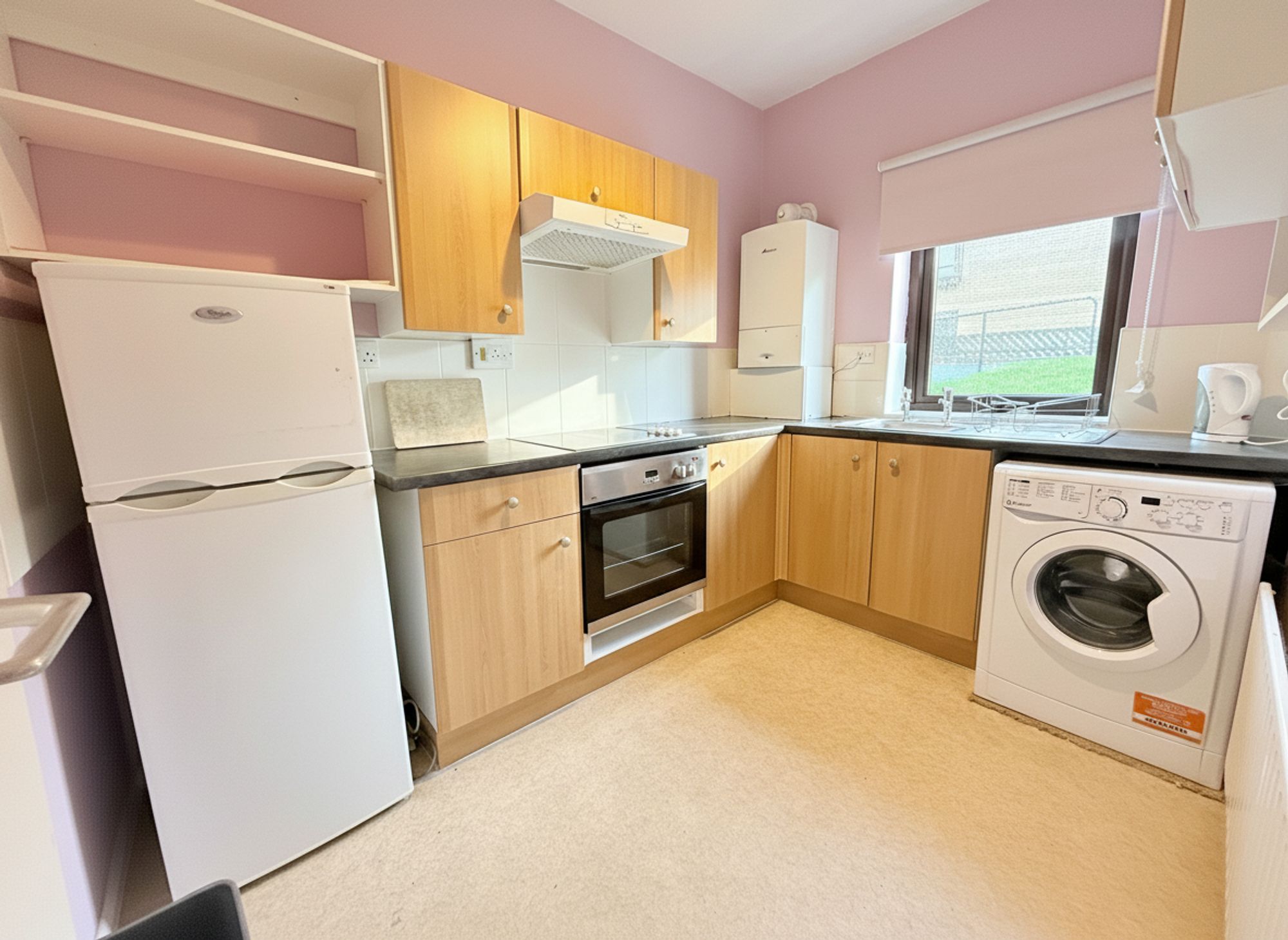 A well-proportioned kitchen situated at the front of the property, fitted with wood-effect units and contrasting worktops. The space includes a four-ring electric hob with oven, along with designated areas for a washing machine and fridge-freezer. The boiler is conveniently housed above a unit for easy access and maintenance.