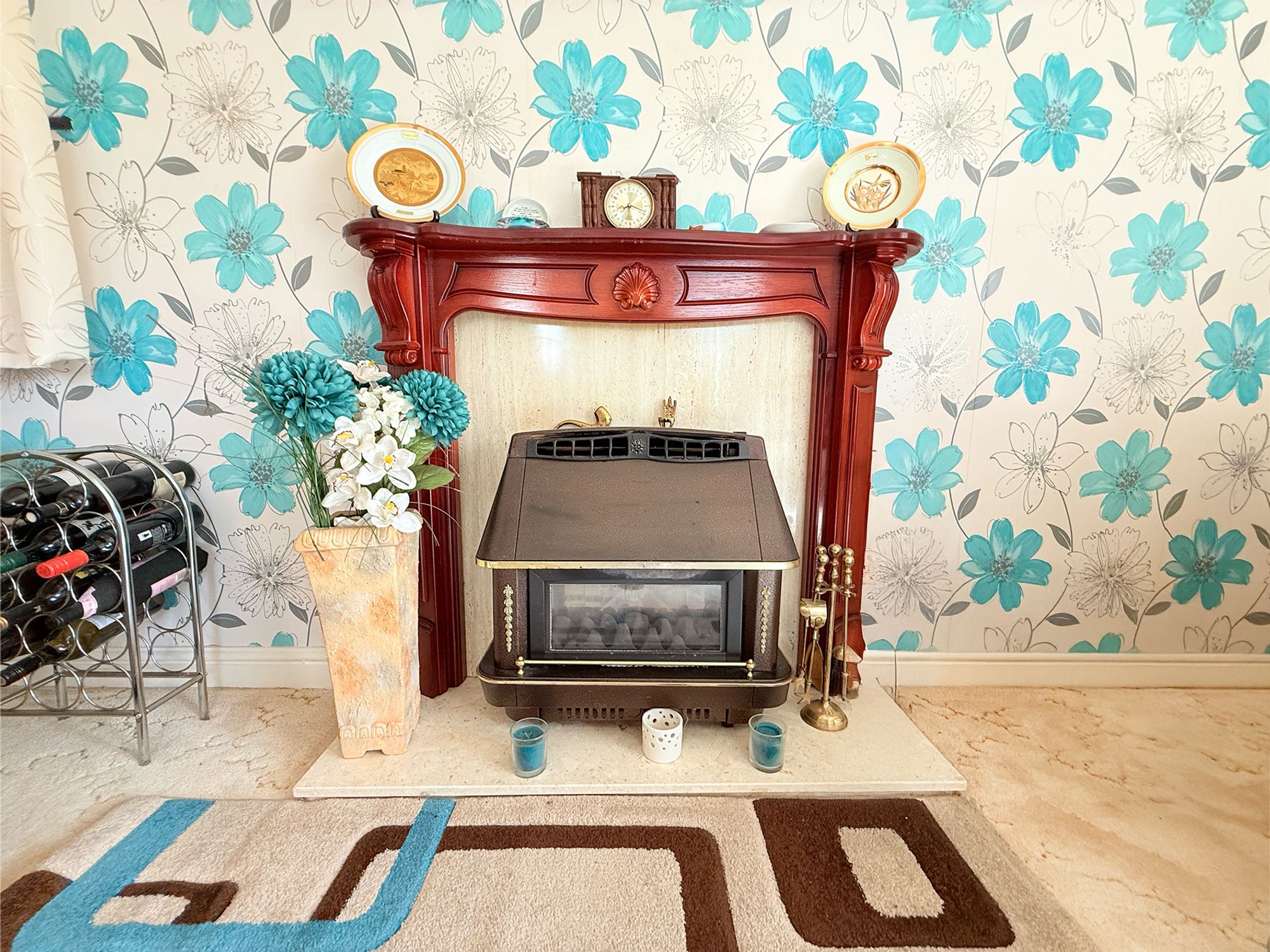 Located at the front of the property, this spacious living room is enhanced by a large bay window that fills the space with natural light. A gas fire with a wood and tiled ornamental surround creates an attractive focal point, while the generous layout provides ample room for a variety of seating arrangements.