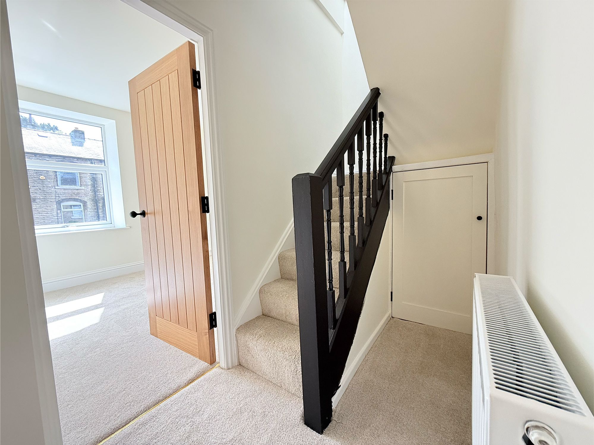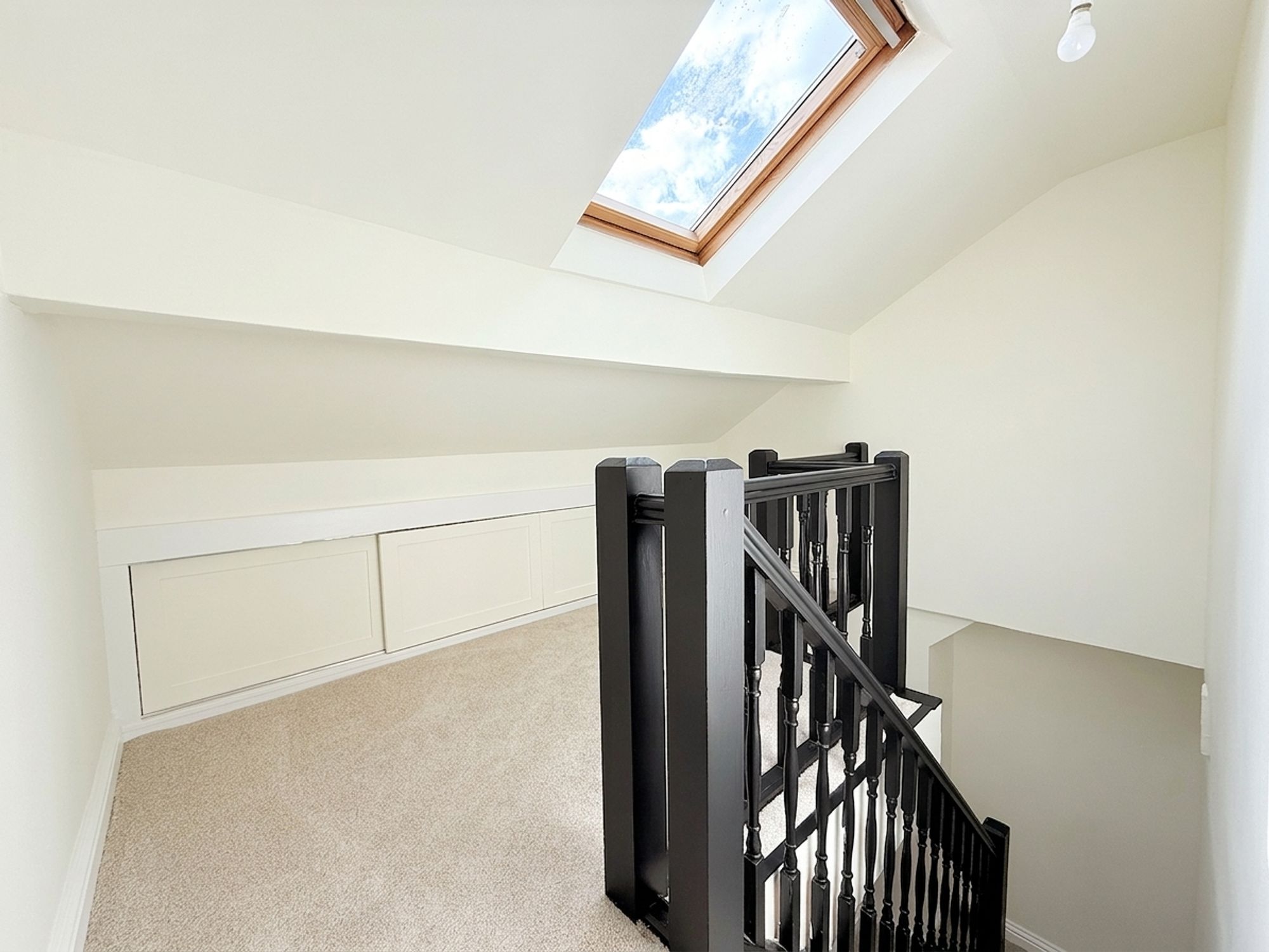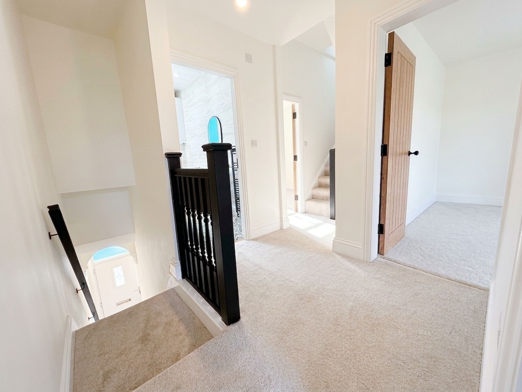 A bright and airy landing featuring a striking black banister and useful eaves storage. This versatile space is ideal for additional furniture or a cosy reading nook and provides access to Bedrooms 4 and 5.