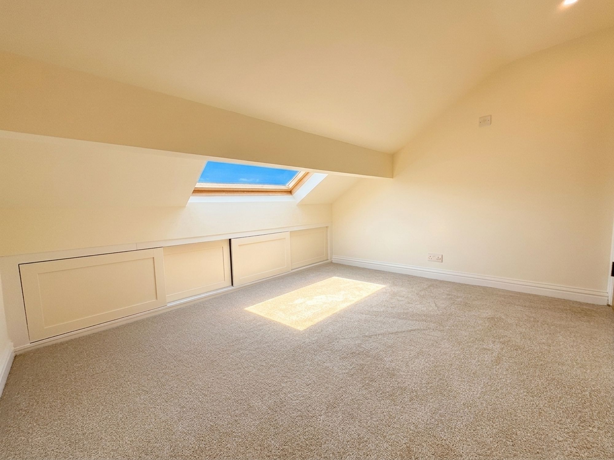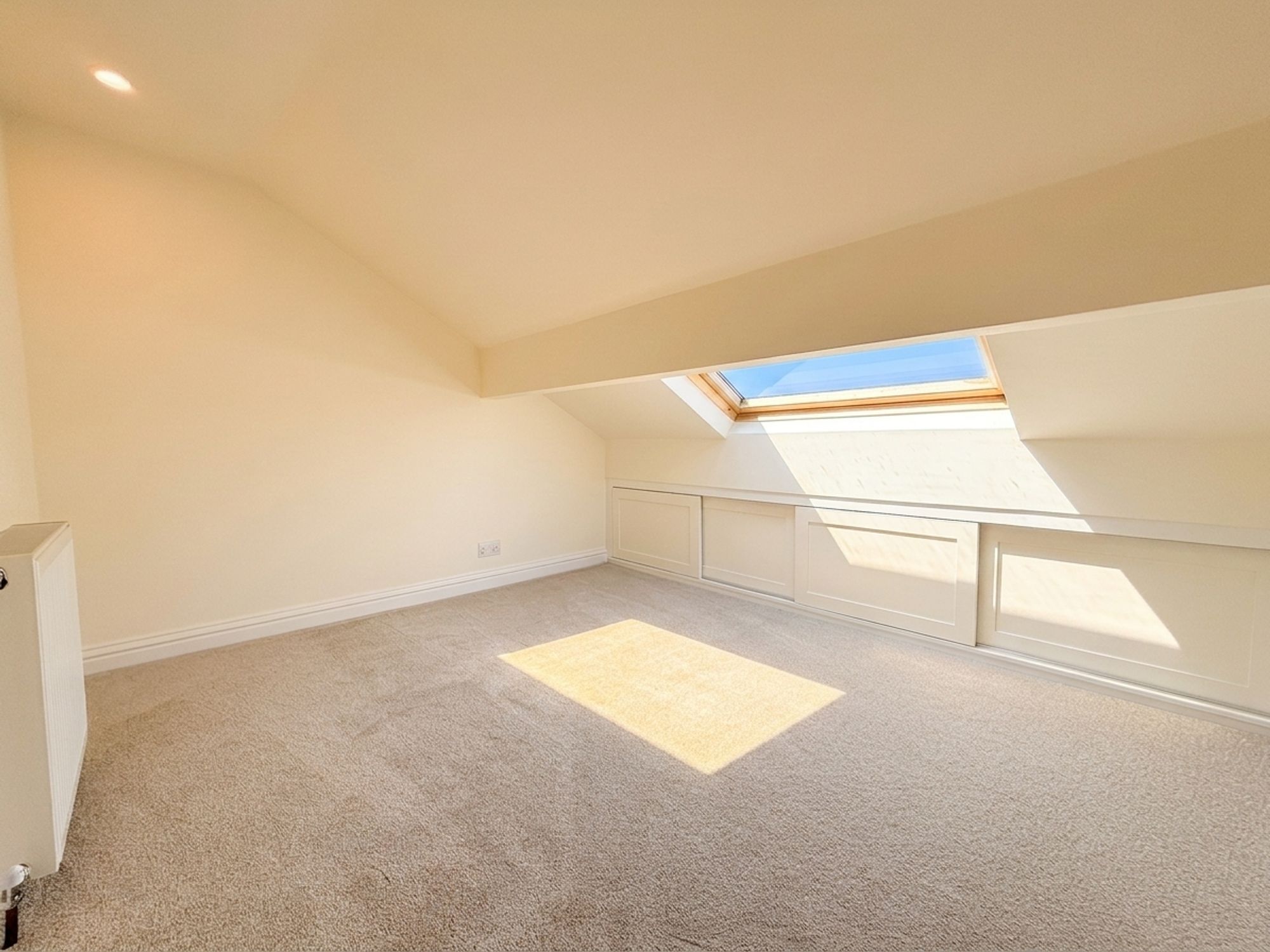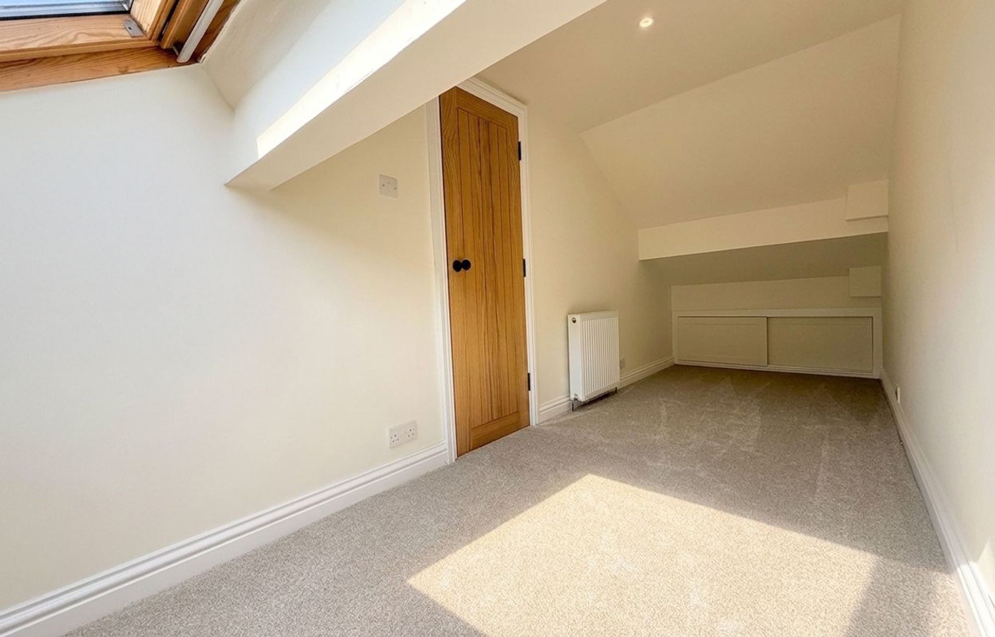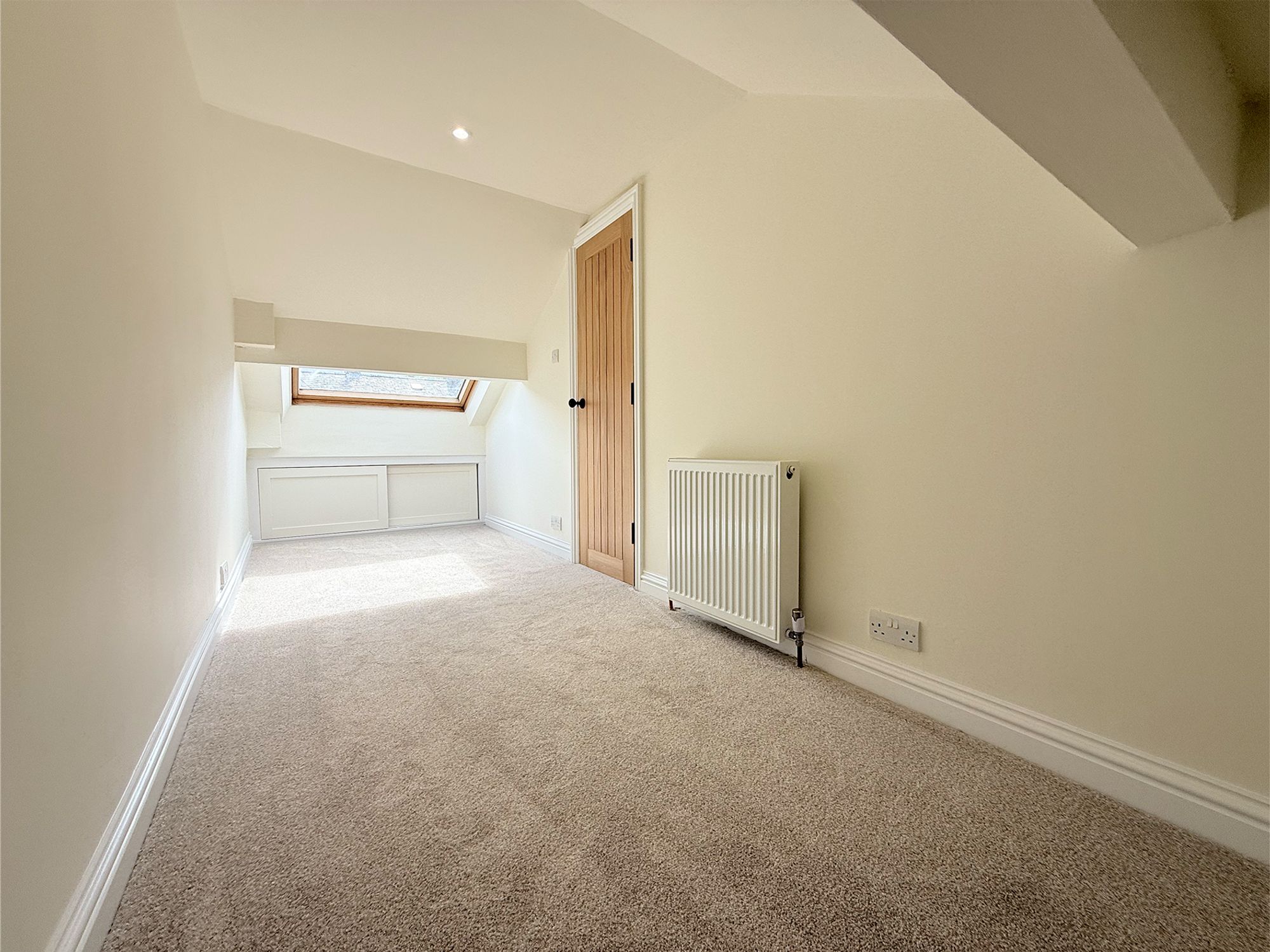 A generous second-floor bedroom with a Velux window allowing for plenty of natural light. Offers ample space for a bed and freestanding furniture, along with useful eaves storage.