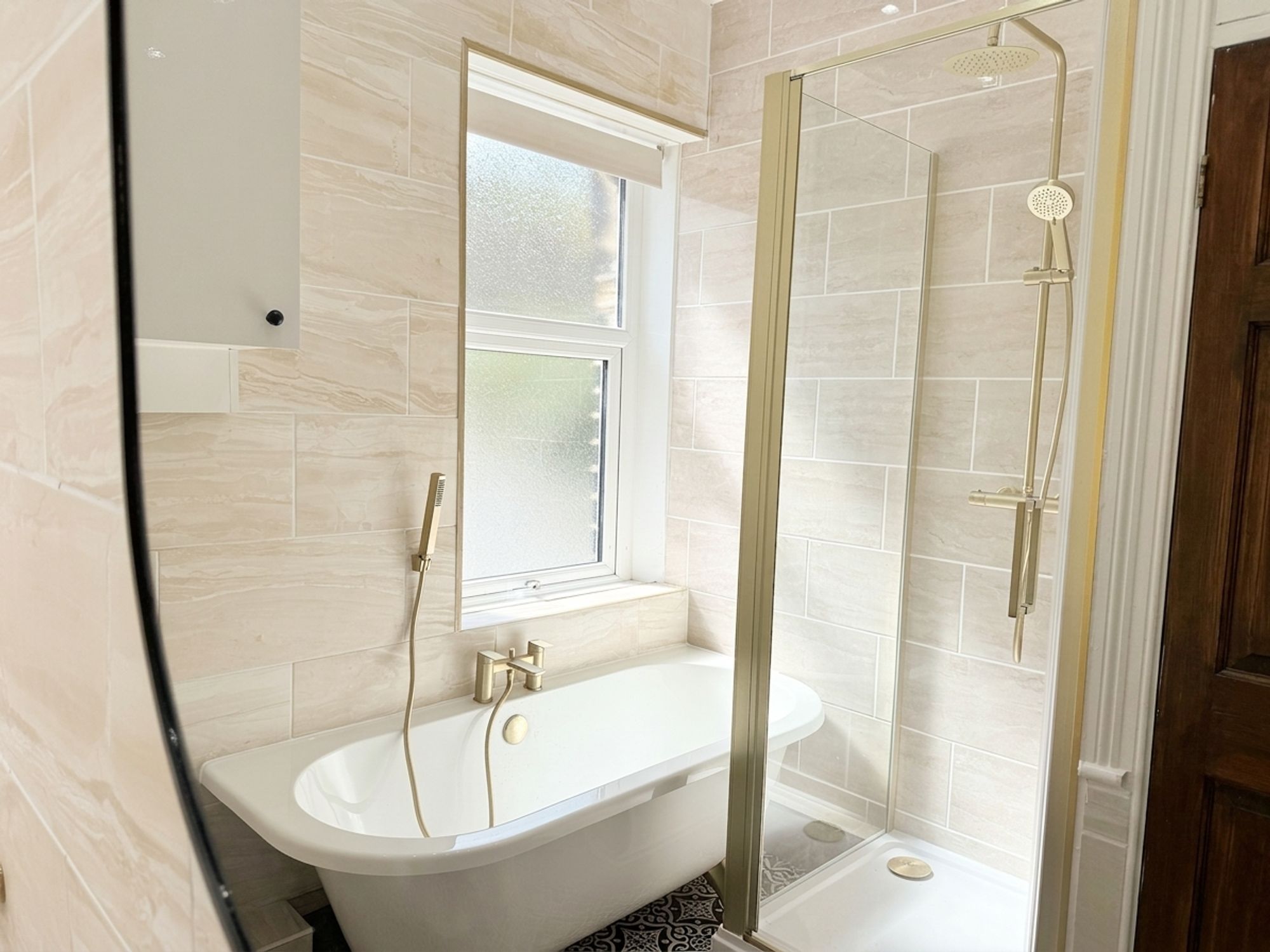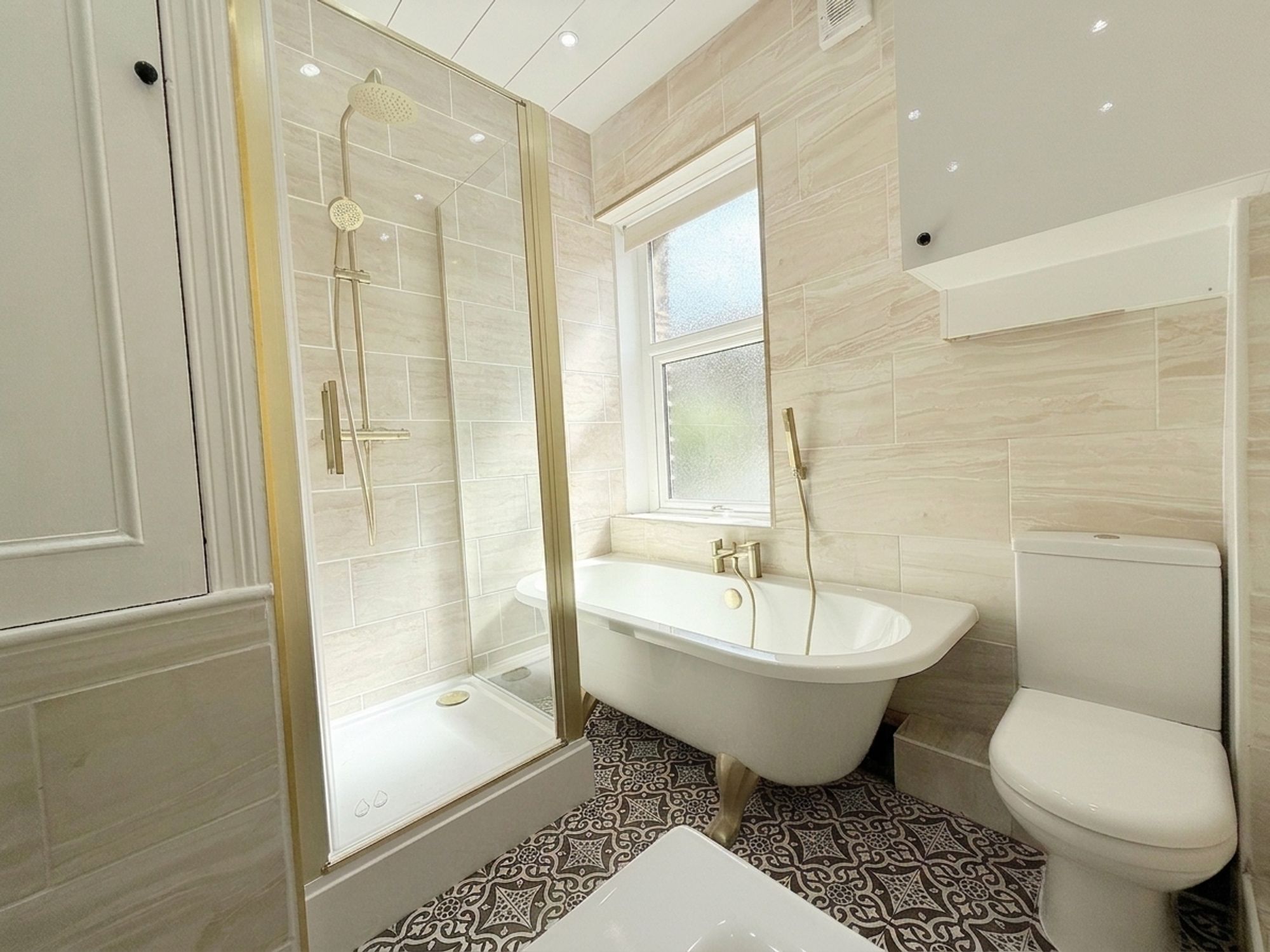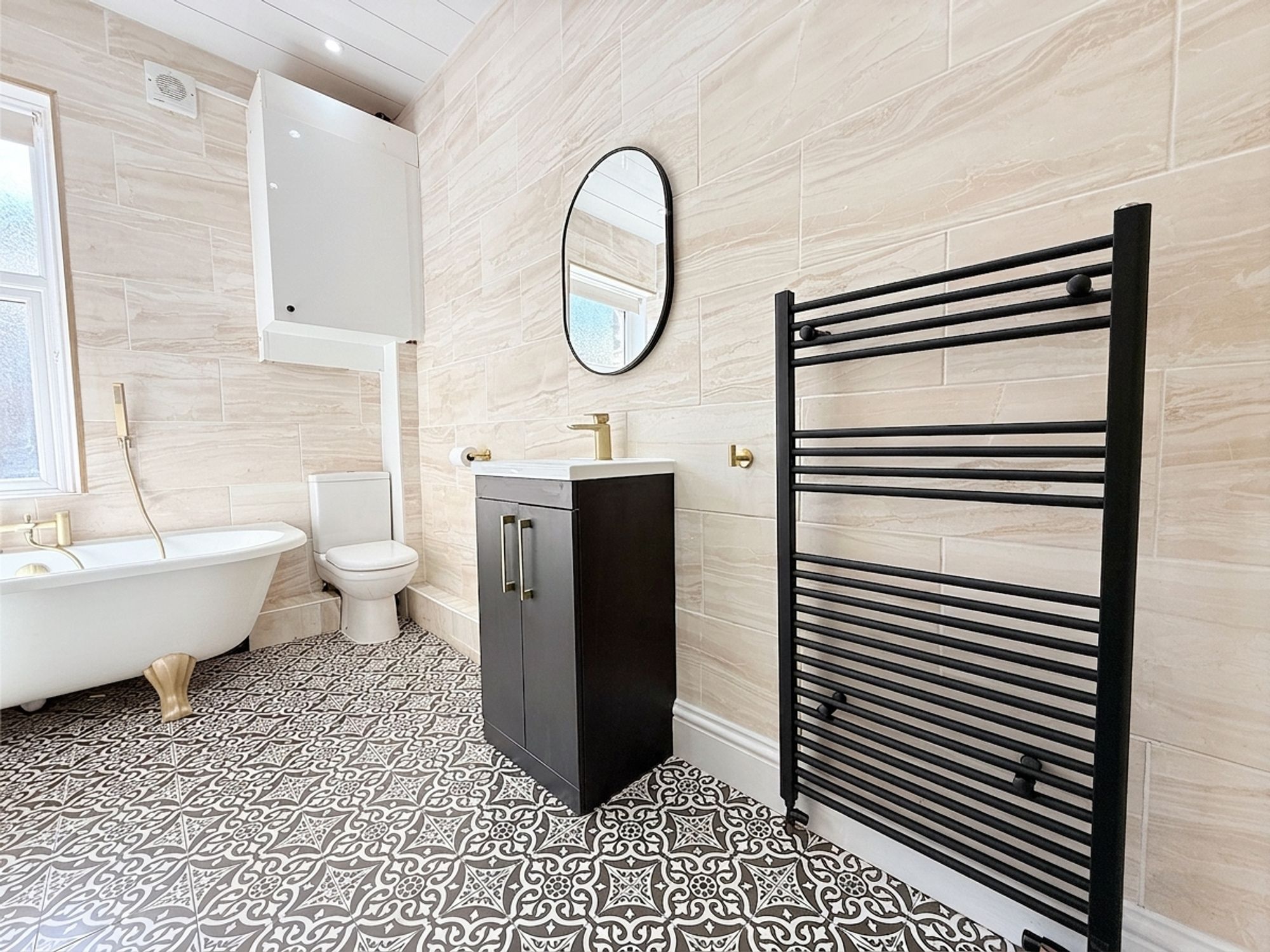 A stunning modern family bathroom fitted with a full-sized bath with brushed brass mixer tap and handheld shower attachment, along with a separate shower cubicle featuring a rainfall shower head and additional handheld attachment. There is a contemporary vanity sink unit with storage below, WC, and a striking black heated towel rail. Finished with neutral wall tiling and patterned floor tiles, the space also benefits from a built-in linen cupboard above the stair bulkhead.