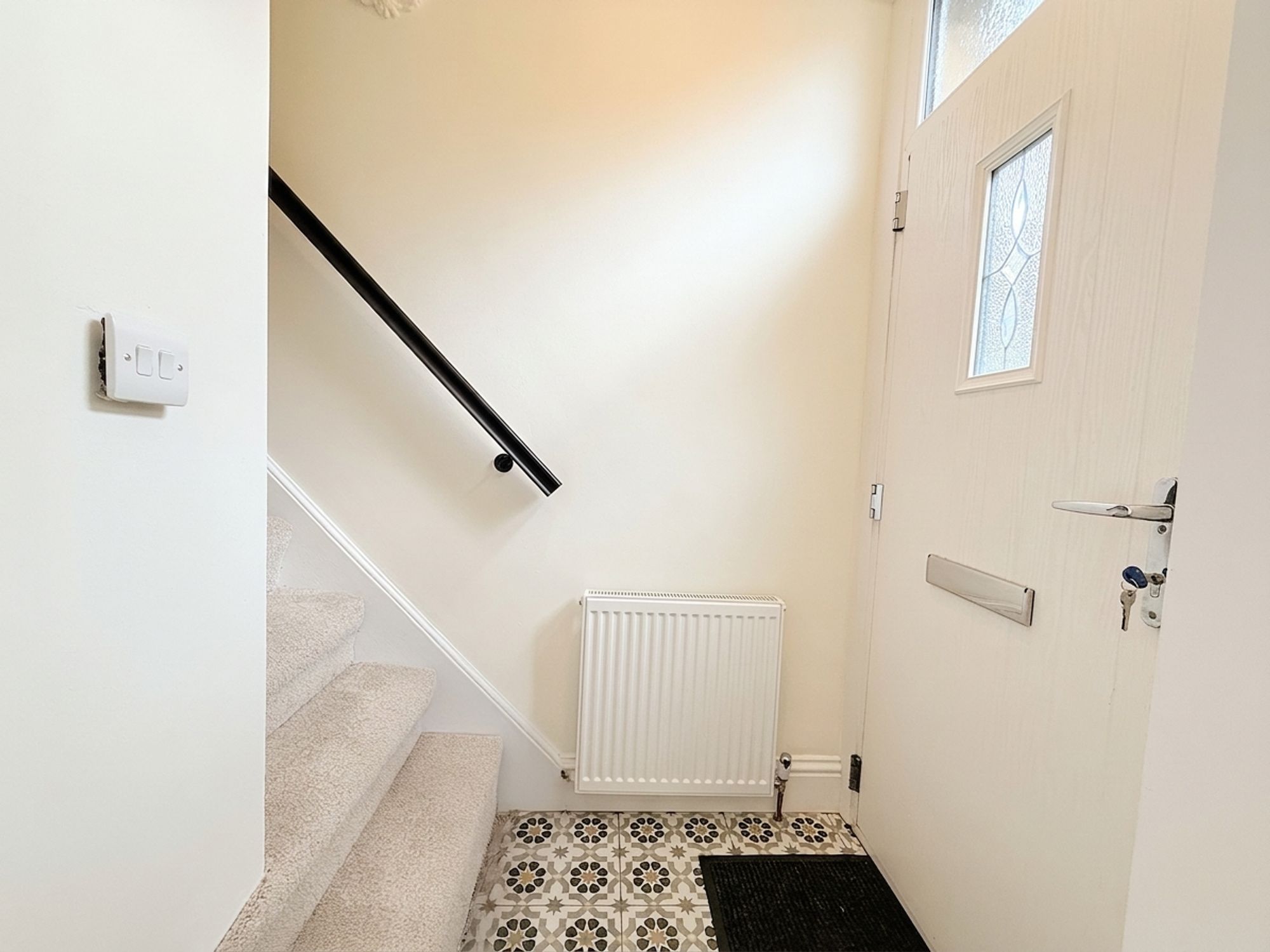 A central entrance hall providing access to the first floor and living room. Neutrally decorated with patterned tiled flooring, it offers a practical space for shoe and coat storage while creating a welcoming first impression.