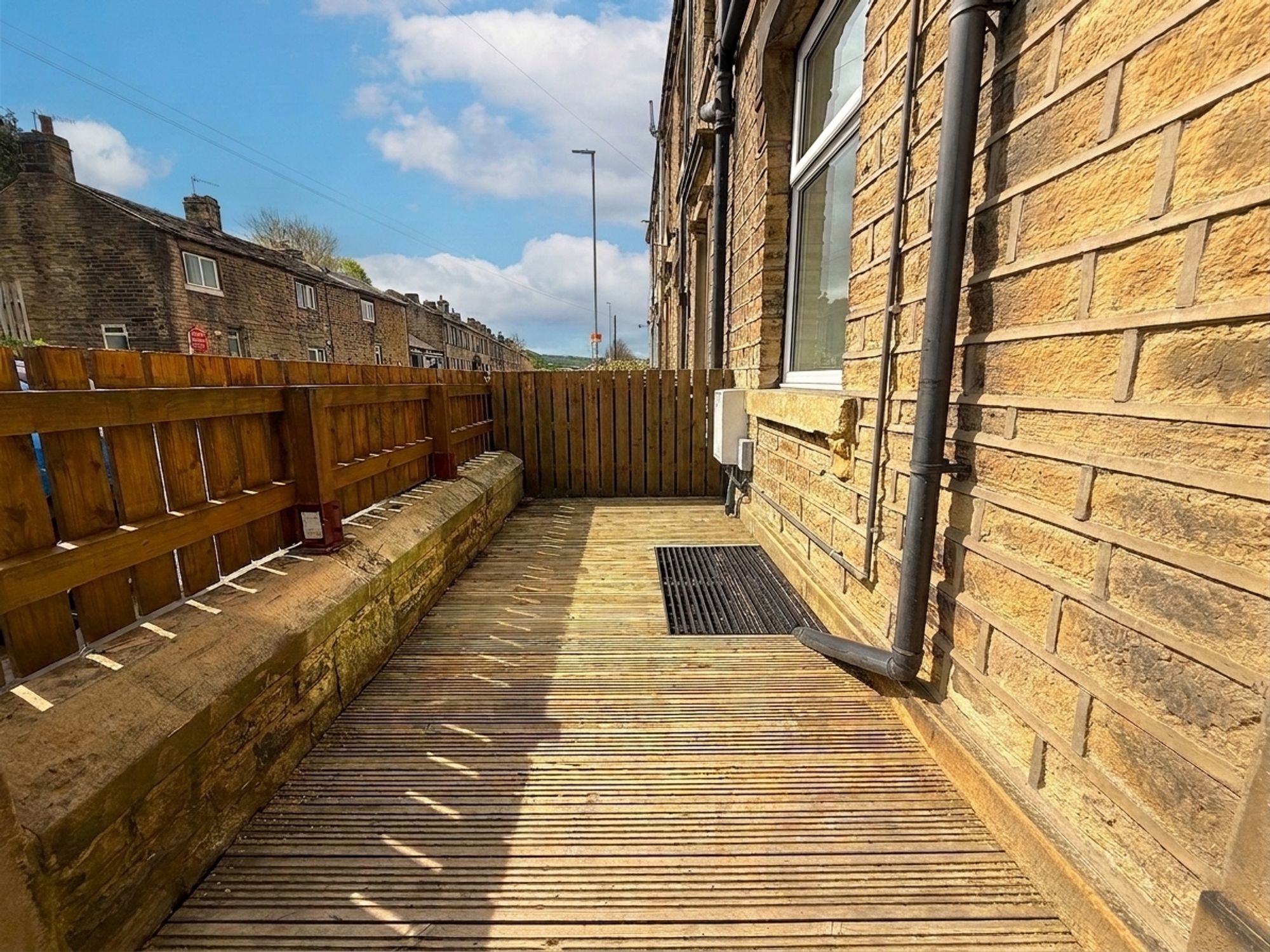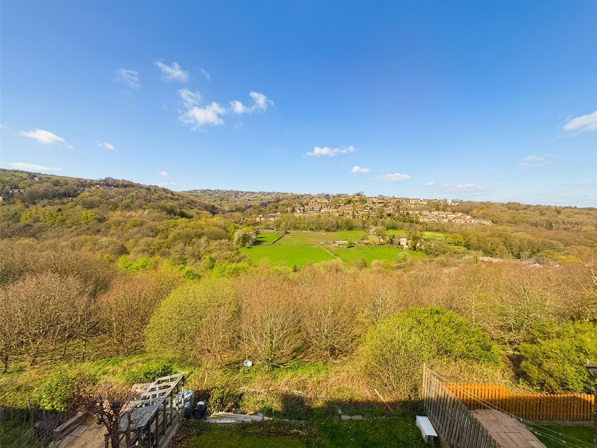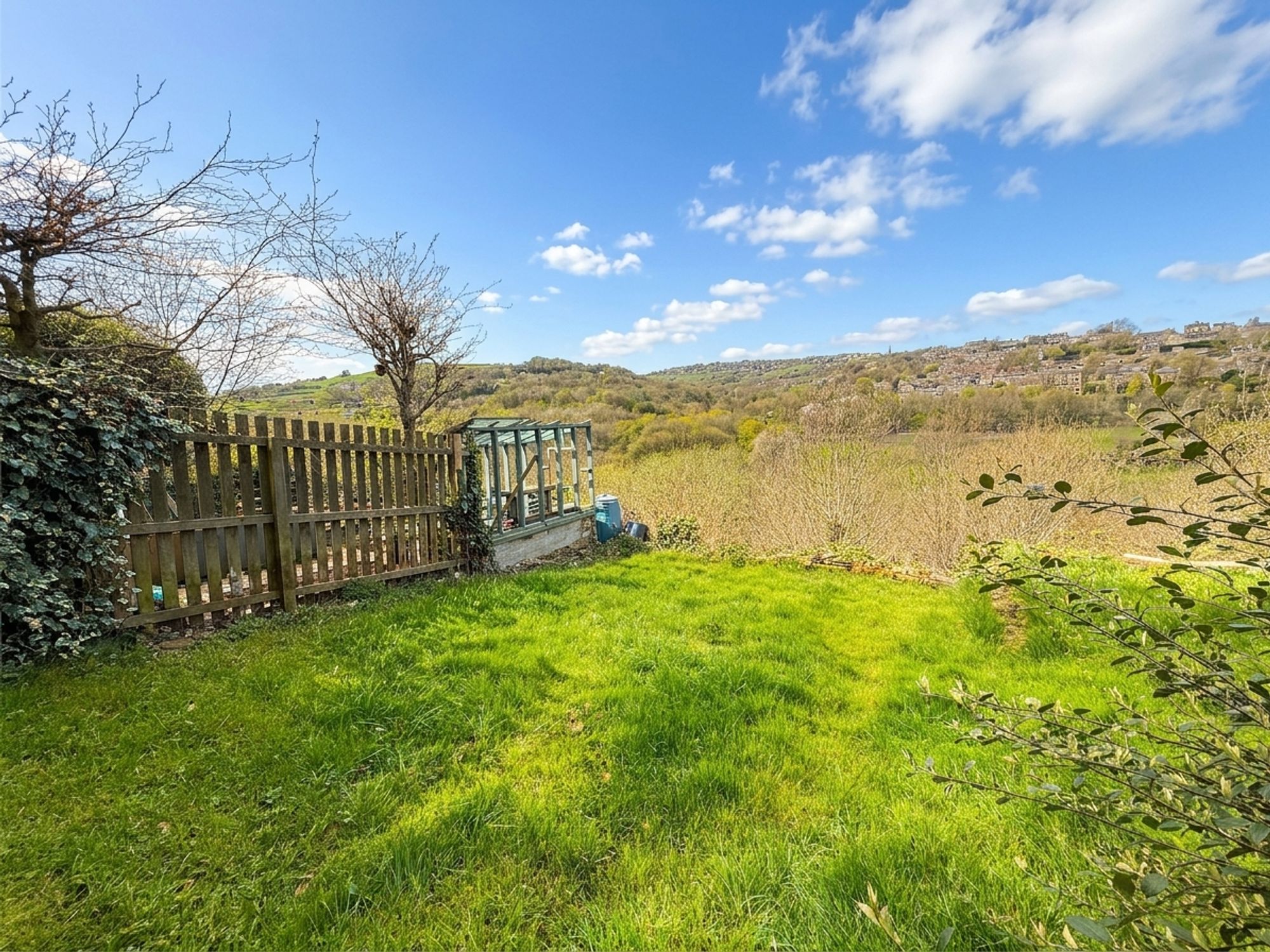 A lawned rear garden enjoying pleasant views over the surrounding area. The garden is shared with the under dwelling and accessed via a communal pathway, with neighbouring properties holding a right of way, offering a simple and enjoyable outdoor space.