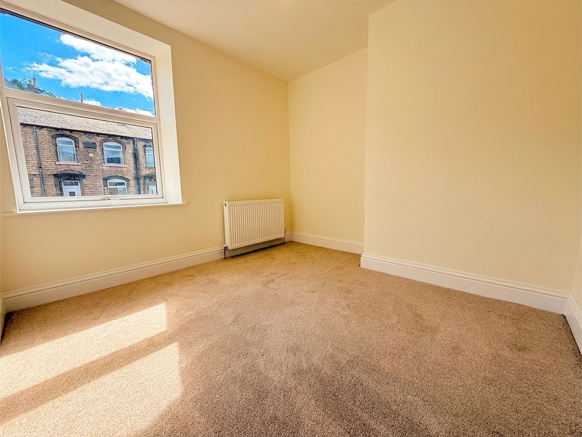 Spanning the full depth of the home, this bright and airy room is ideal as a children’s bedroom, dressing room, or study. Flooded with natural light from a Velux window, it is neutrally decorated with plush carpeting and benefits from eaves storage to both sides.