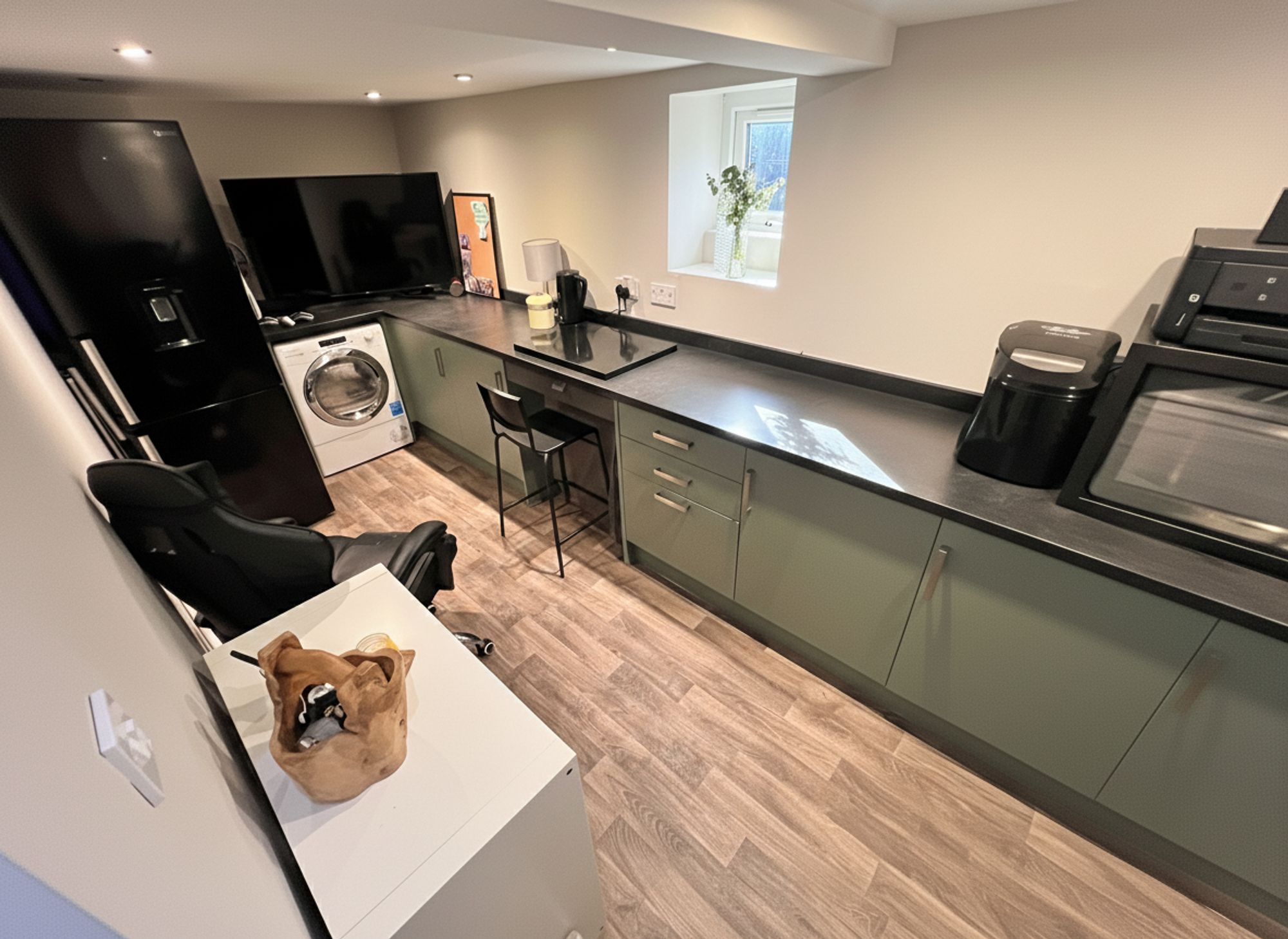 Converted by the current owners, this fantastically designed space offers excellent versatility and benefits from natural light, creating a bright and inviting environment. Ideal as a home office or creative studio it provides valuable flexible accommodation to suit a variety of needs. The room is fitted with a range of chic units, along with space for a tumble dryer and room to accommodate a large fridge freezer, combining practicality with stylish presentation.