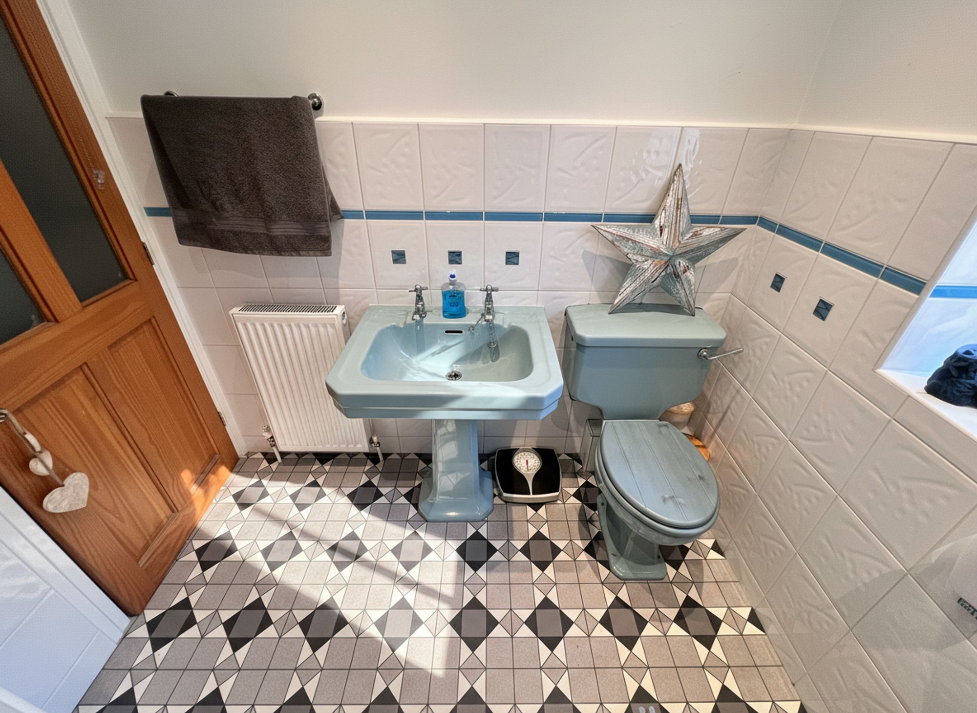 The house bathroom is fitted with a full-size bath, wash basin and low flush WC, along with a useful built-in cupboard providing excellent storage for everyday essentials. The walls are partially tiled, complemented by attractive feature lino flooring creating a stylish finish.
