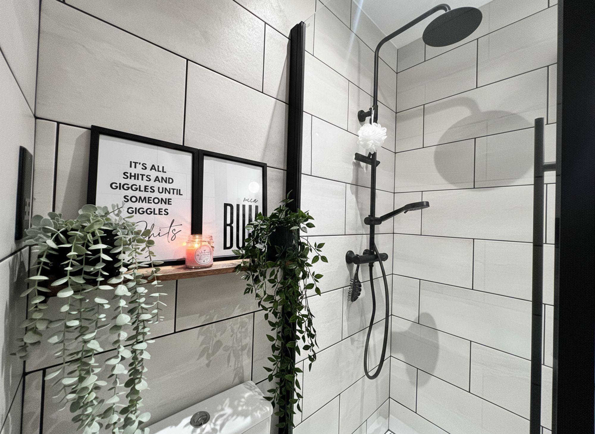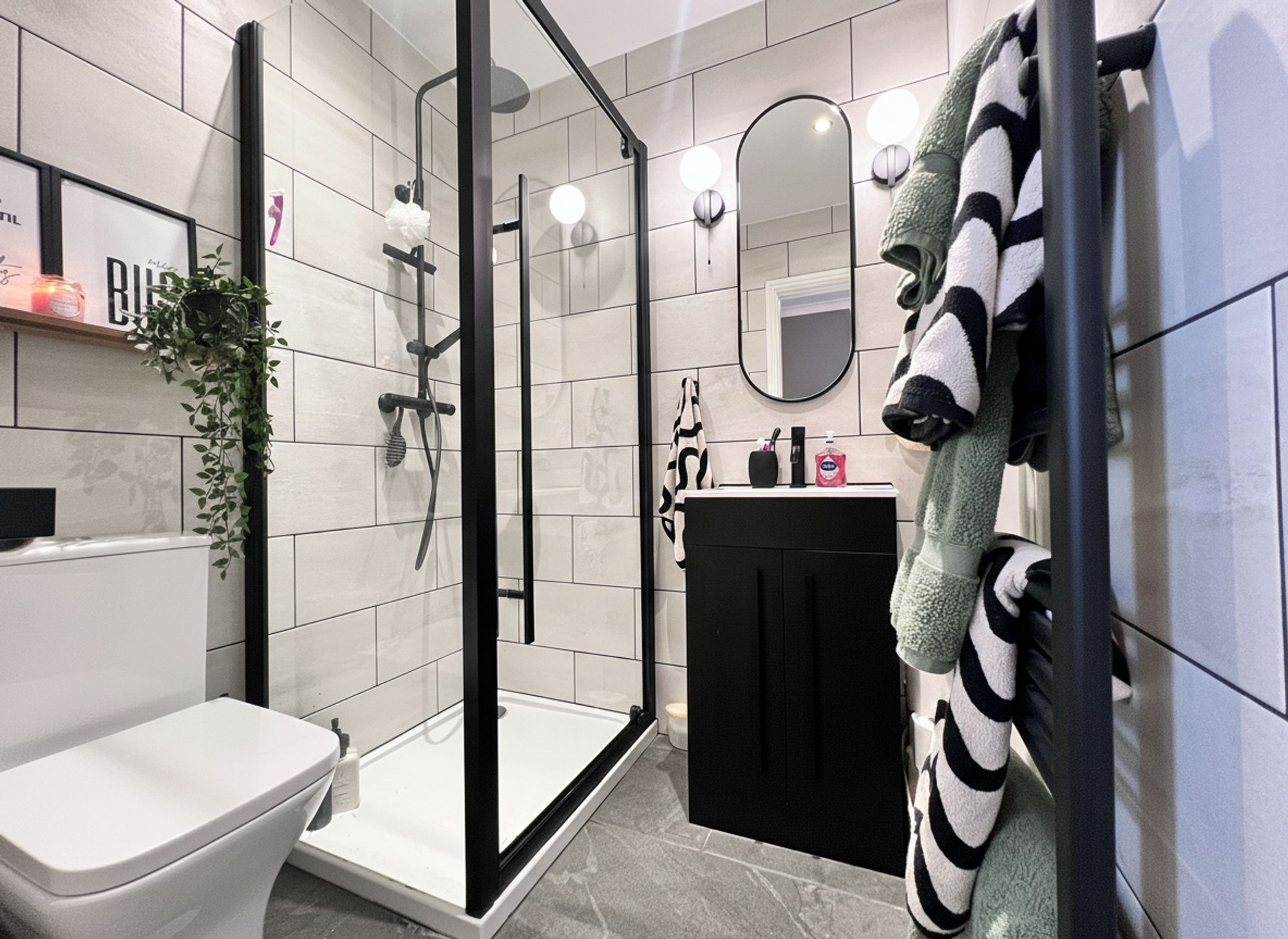Epitomising modern interior design, the indulgent en-suite showcases striking black accents that create a sleek, on-trend aesthetic. The suite comprises a walk-in shower cubicle with rainhead shower and separate handheld attachment, low flush WC, and a wash basin set within a contemporary vanity unit, complemented by a black heated towel rail. The walls are finished with large light grey tiles, beautifully contrasted by coordinating floor tiles resulting in a stylish and cohesive finish.
