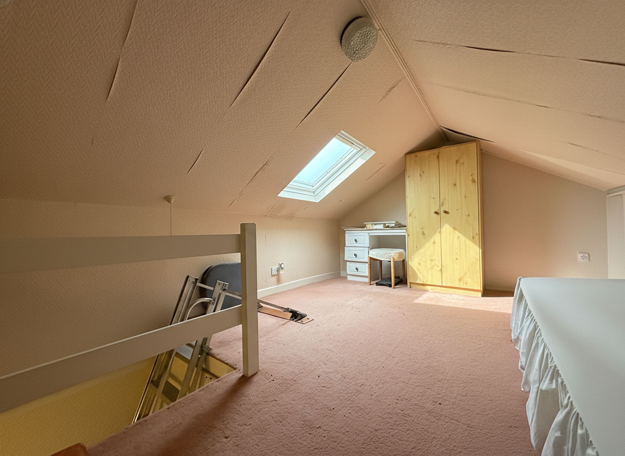 A spacious loft room currently used as a bedroom, although not converted to current building regulations. The space has been utilised as a generous double bedroom with ample room for additional freestanding furniture. There is potential to add a dormer and staircase, subject to the necessary consents, to create a principal suite and already benefits from a Velux window allowing natural light. The room also provides access to an additional storage room.