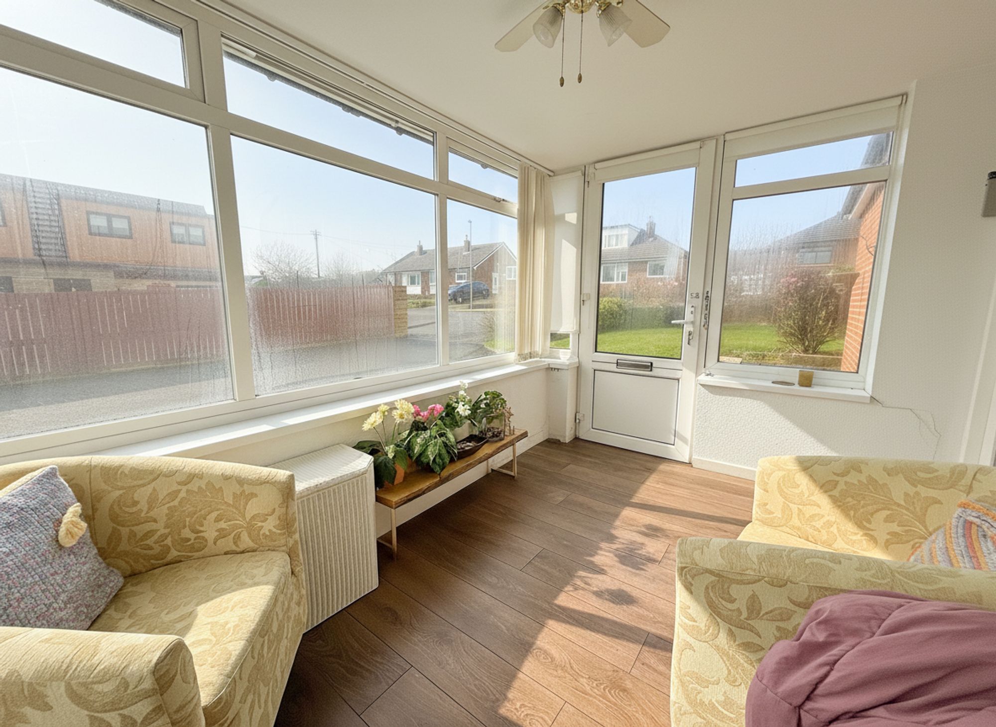 A bright and airy conservatory currently used as the entrance to the property. Featuring triple-aspect windows, the space is flooded with natural light and is neutrally decorated with wood-effect laminate flooring. The conservatory provides a pleasant spot for additional seating or could alternatively be used as a dedicated dining area.