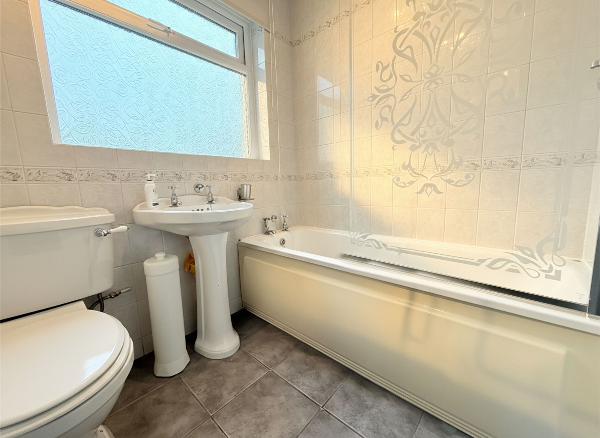 A spacious family bathroom fitted with a full-sized bath featuring a chrome mixer tap and an additional shower with a glass screen. The suite also comprises a pedestal wash hand basin with chrome mixer tap and a WC. The room is finished with soft-toned tiling to the walls and floors, complemented by a mid-height decorative border.