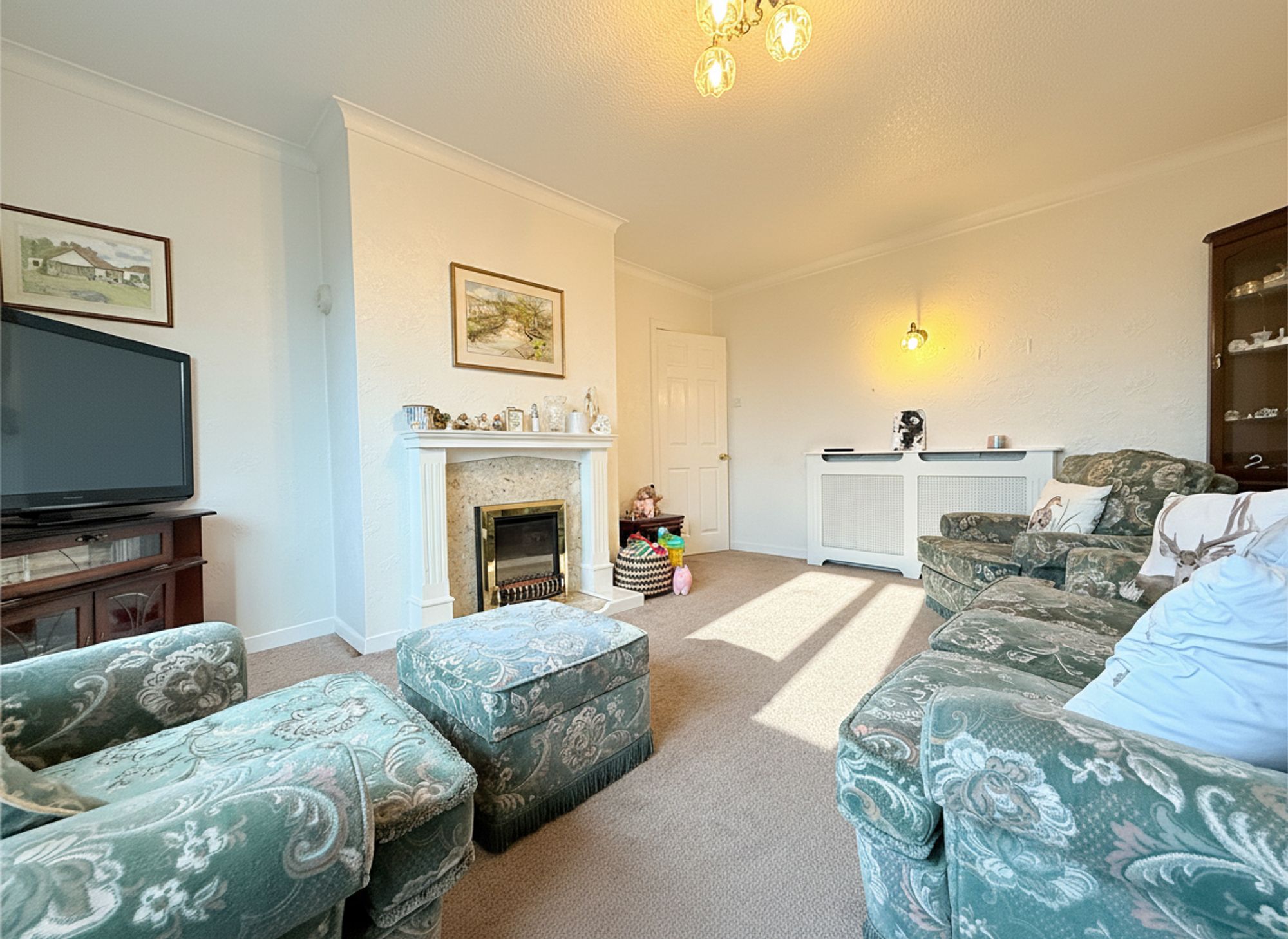 A spacious living room enjoying views over the rear garden. The room offers ample space for a variety of family seating arrangements and is neutrally decorated with matching carpets. The focal point of the room is a gas fire set within a wooden surround.