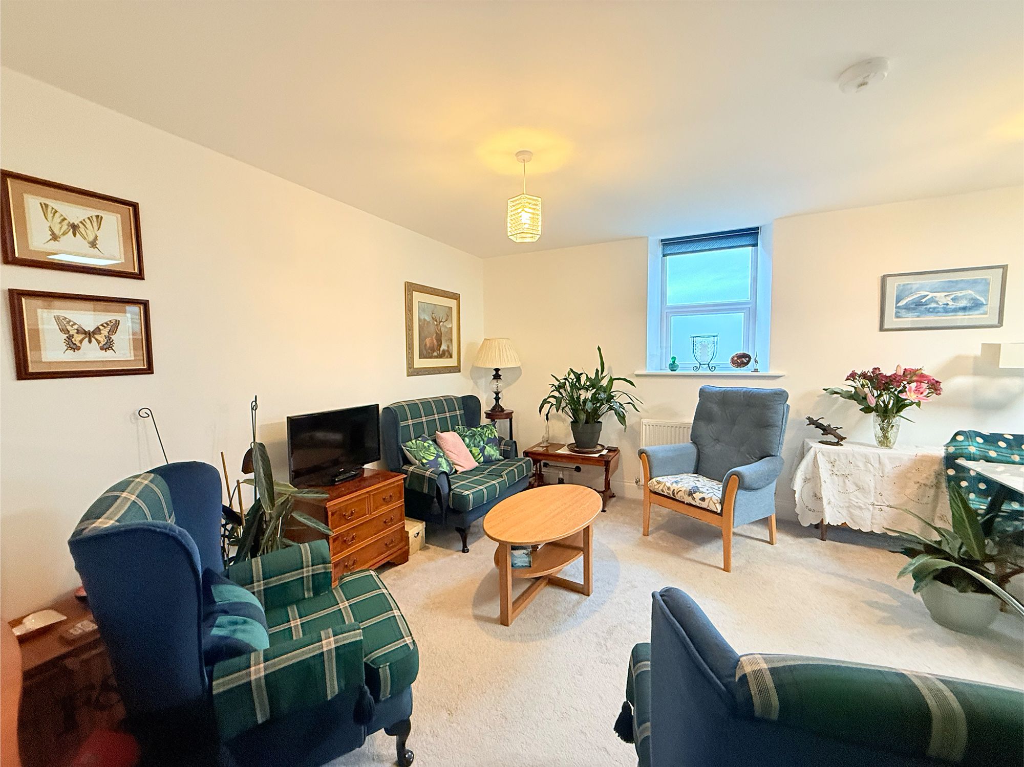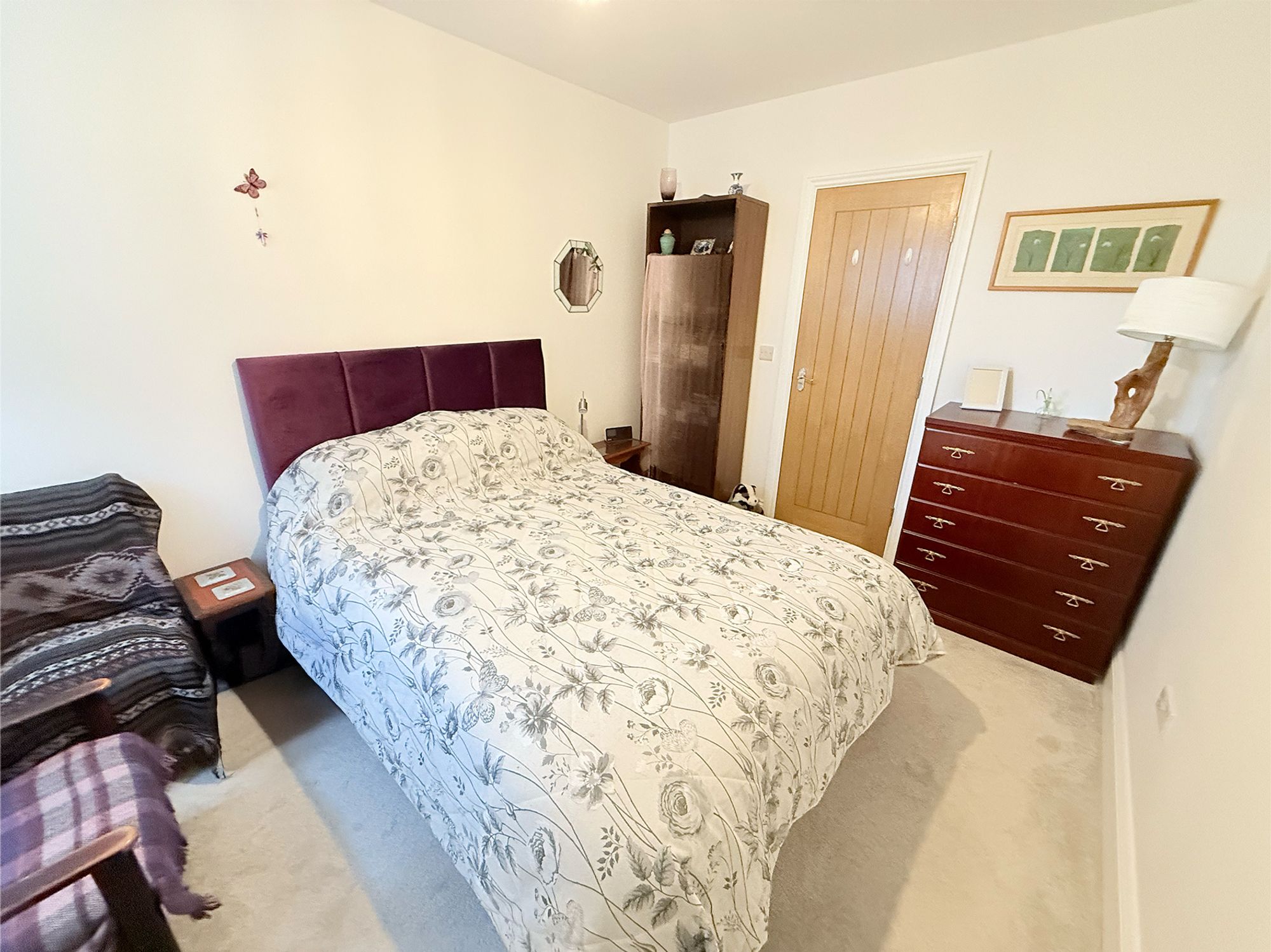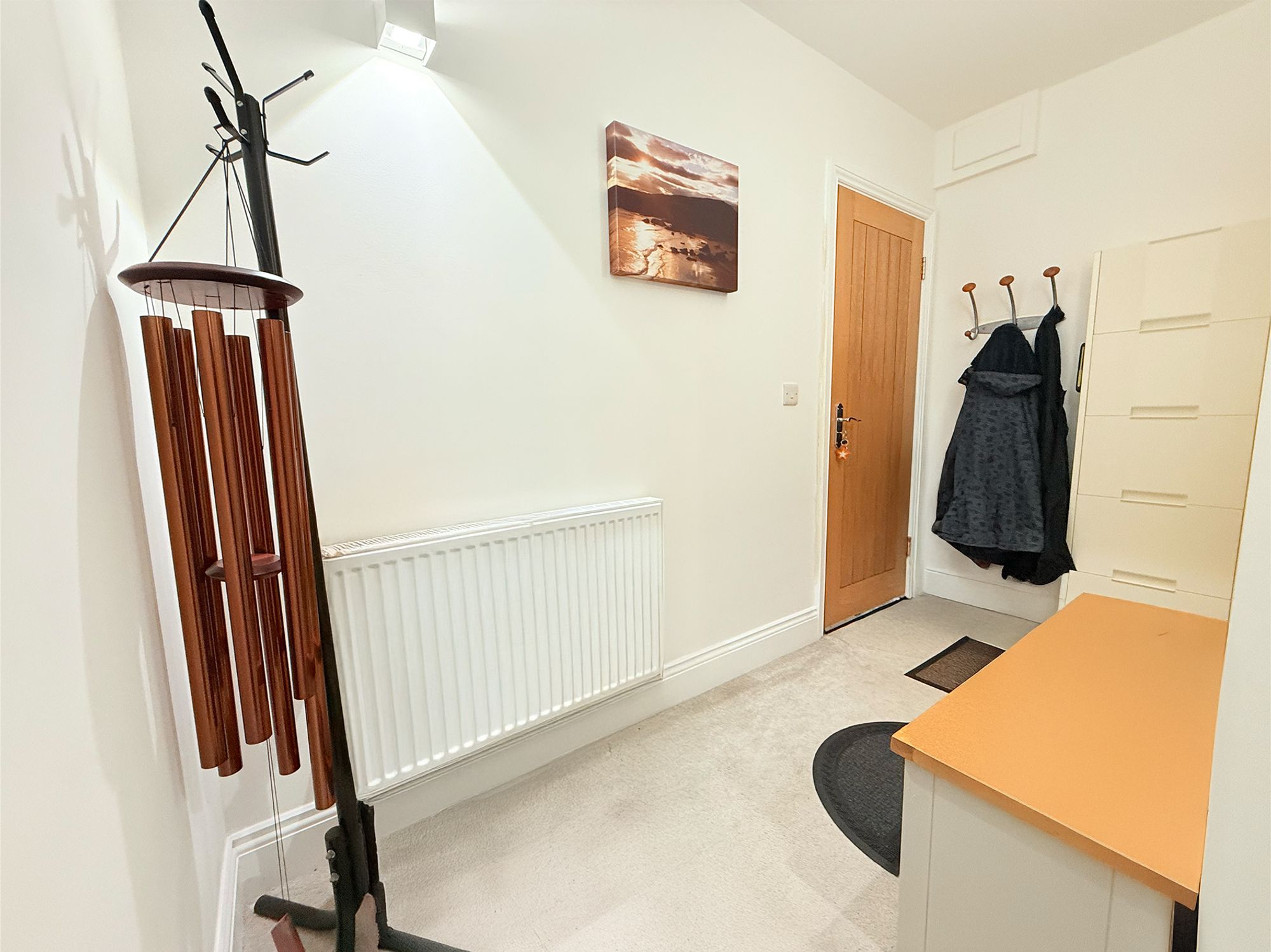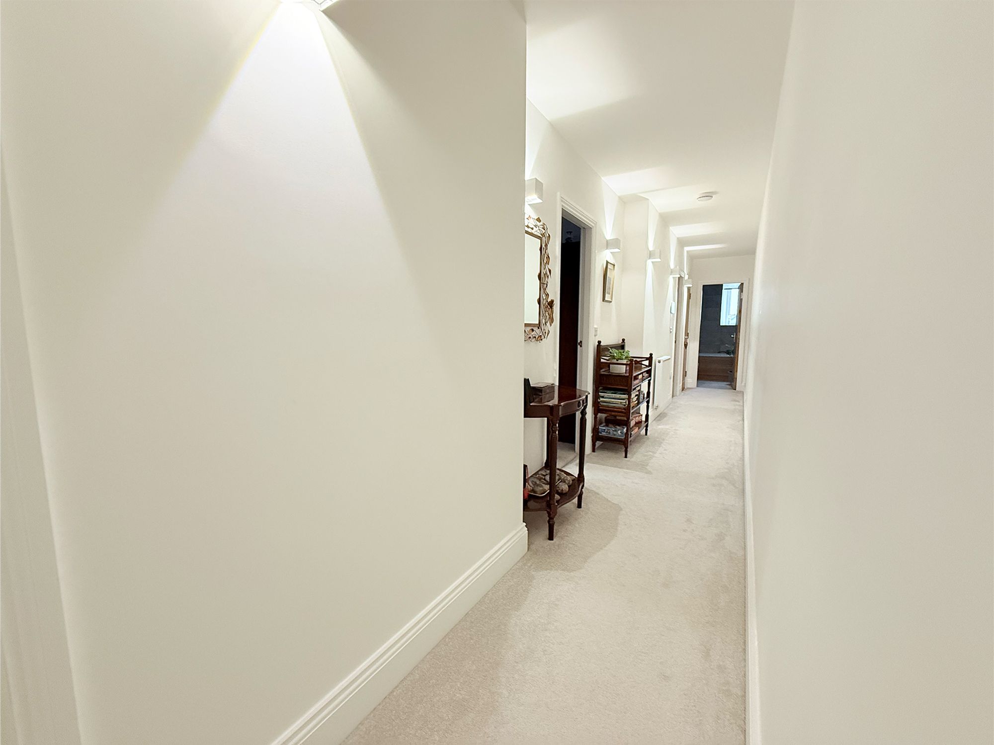 A central hallway providing access to Bedrooms One and Two, the living kitchen and the bathroom. The space also benefits from a useful additional storage cupboard and continues the neutral décor and plush carpeting from the entrance, creating a cohesive flow throughout.