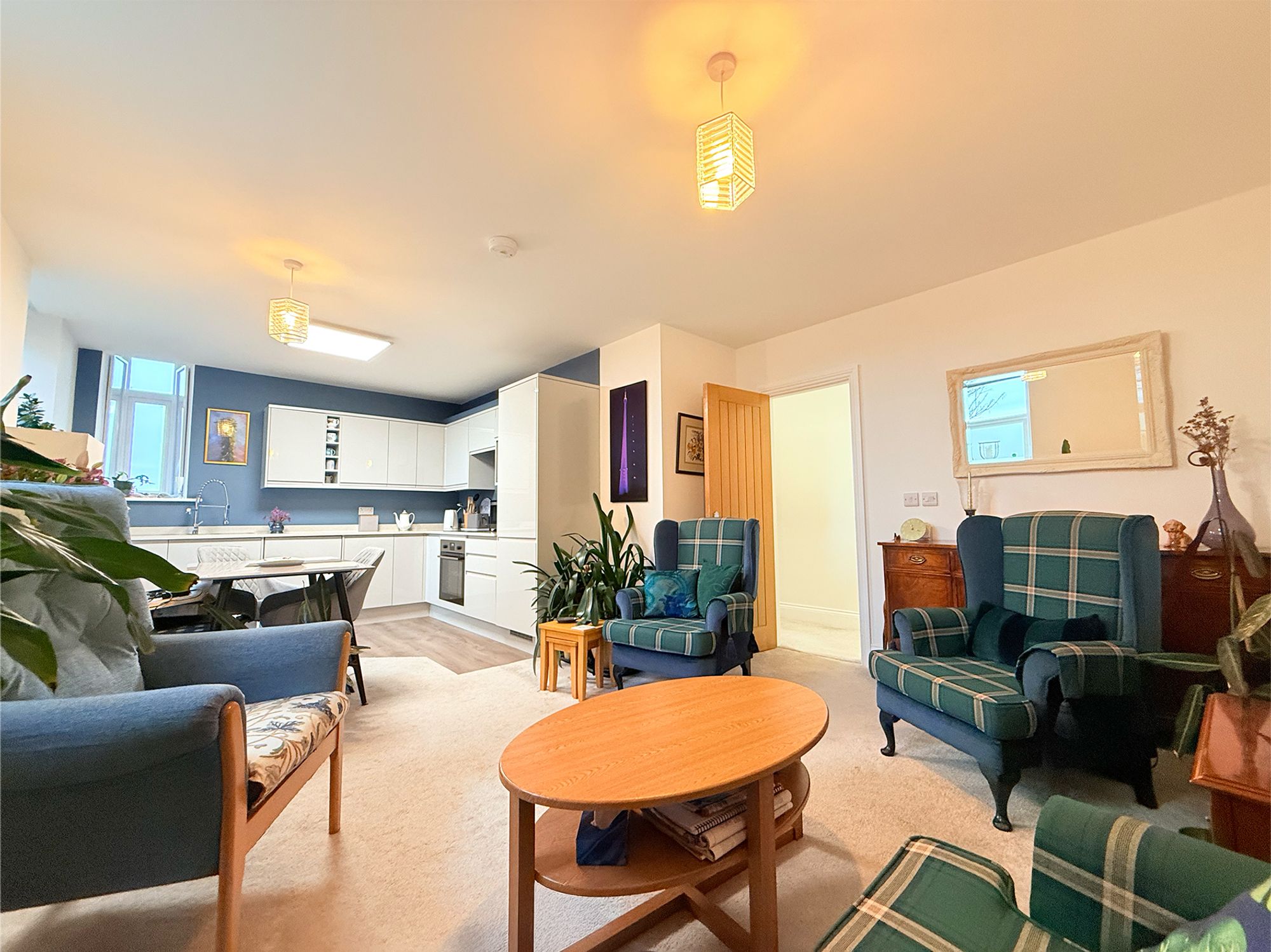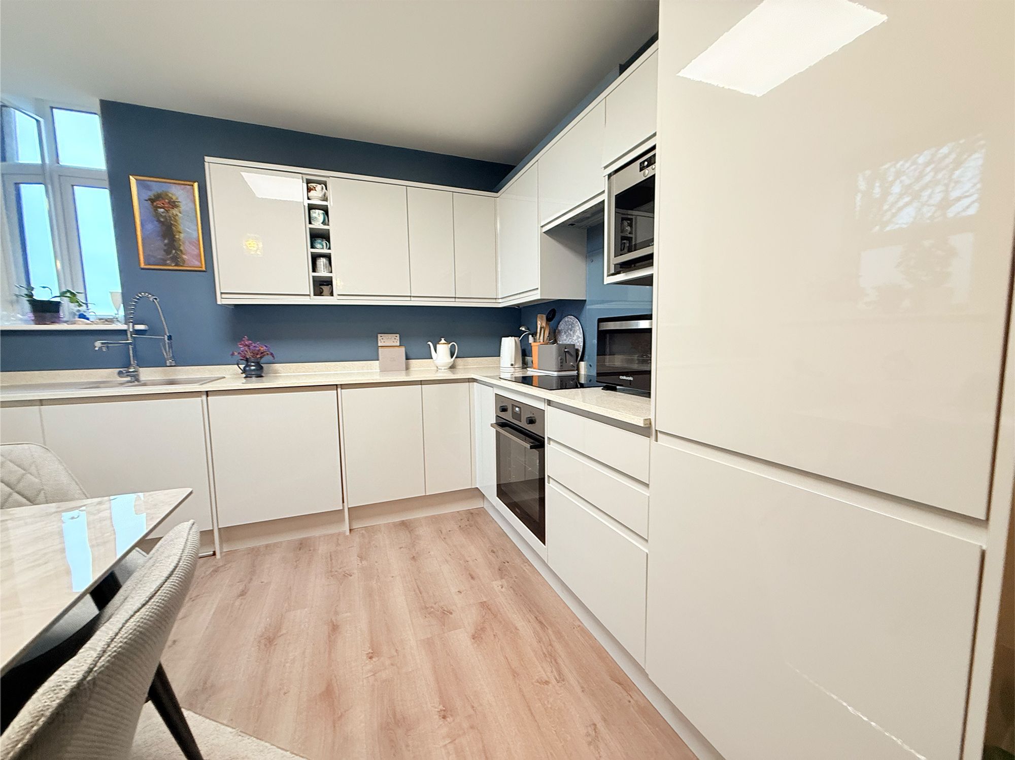 A spacious open plan kitchen living space, fitted with sleek kitchen cabinetry and complementing worktops, finished with wood-effect laminate flooring. The kitchen is well equipped with an electric oven and four-ring electric hob, integrated fridge/freezer and dishwasher, plus a Hotpoint washer/dryer, and a kitchen sink with chrome mixer tap. The room is flooded with natural light thanks to dual-aspect windows, enjoying picturesque views towards the Emley Moor Mast. Decorated in neutral tones, the generous living area offers ample space for a full-sized family dining suite and a variety of seating arrangements, creating an ideal hub for modern family life and entertaining.