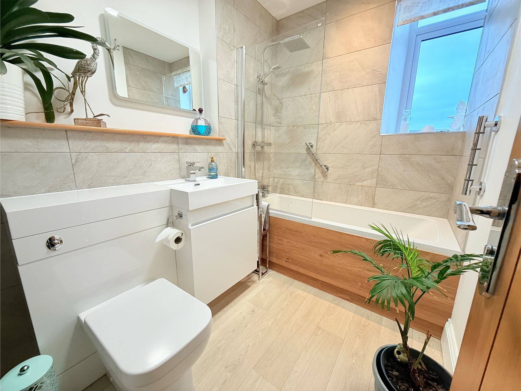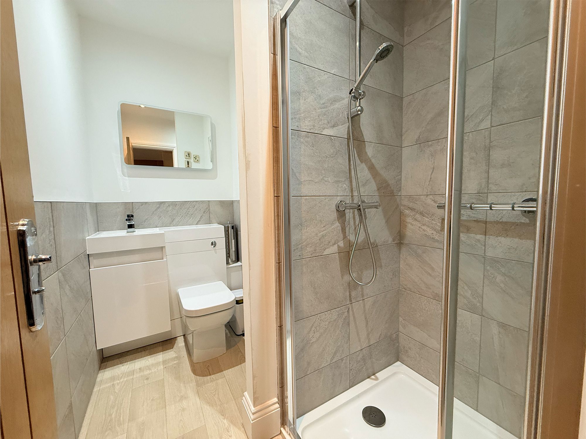 A modern and sleek en-suite, privately accessed from the principal bedroom. It features a vanity sink unit with inset wash basin and chrome mixer tap, WC, and a shower with handheld attachment. Further benefits include a heated towel rail, neutral tiling and wood-effect laminate flooring for a smart, contemporary finish.