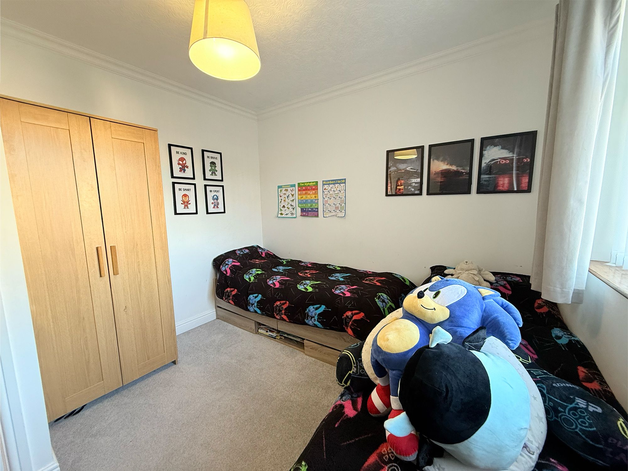 Continuing the neutral décor from the entrance hall, the landing provides access to all bedrooms and the family bathroom. A handy built-in storage cupboard offers ideal space for linens and household essentials. The loft is accessed via a convenient hatch with drop-down ladder and is fully boarded, providing useful additional storage.