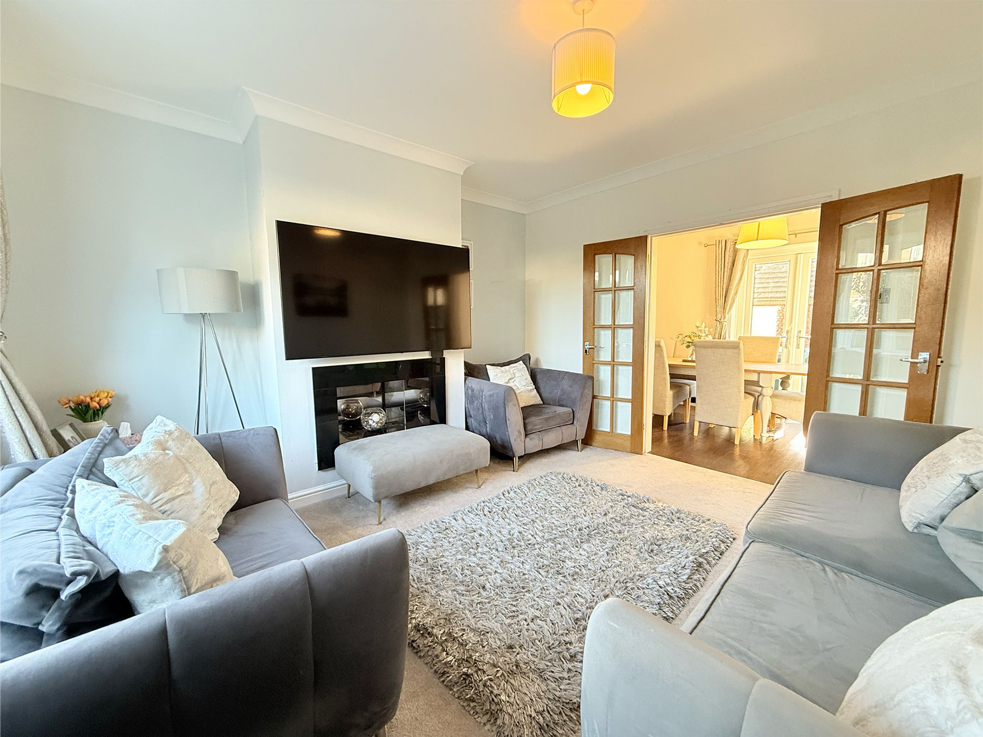 Situated to the front of the property, this welcoming and generously sized family living room is filled with natural light thanks to its dual-aspect windows, including a charming bay window. Glass doors open into the open-plan kitchen diner, creating a lovely flow for everyday living and entertaining. Finished in soft neutral tones with plush carpeting underfoot, the room offers plenty of space for comfortable family seating. The chimney breast features a sleek, modern gas fire (currently capped off), adding a cosy focal point to the room.