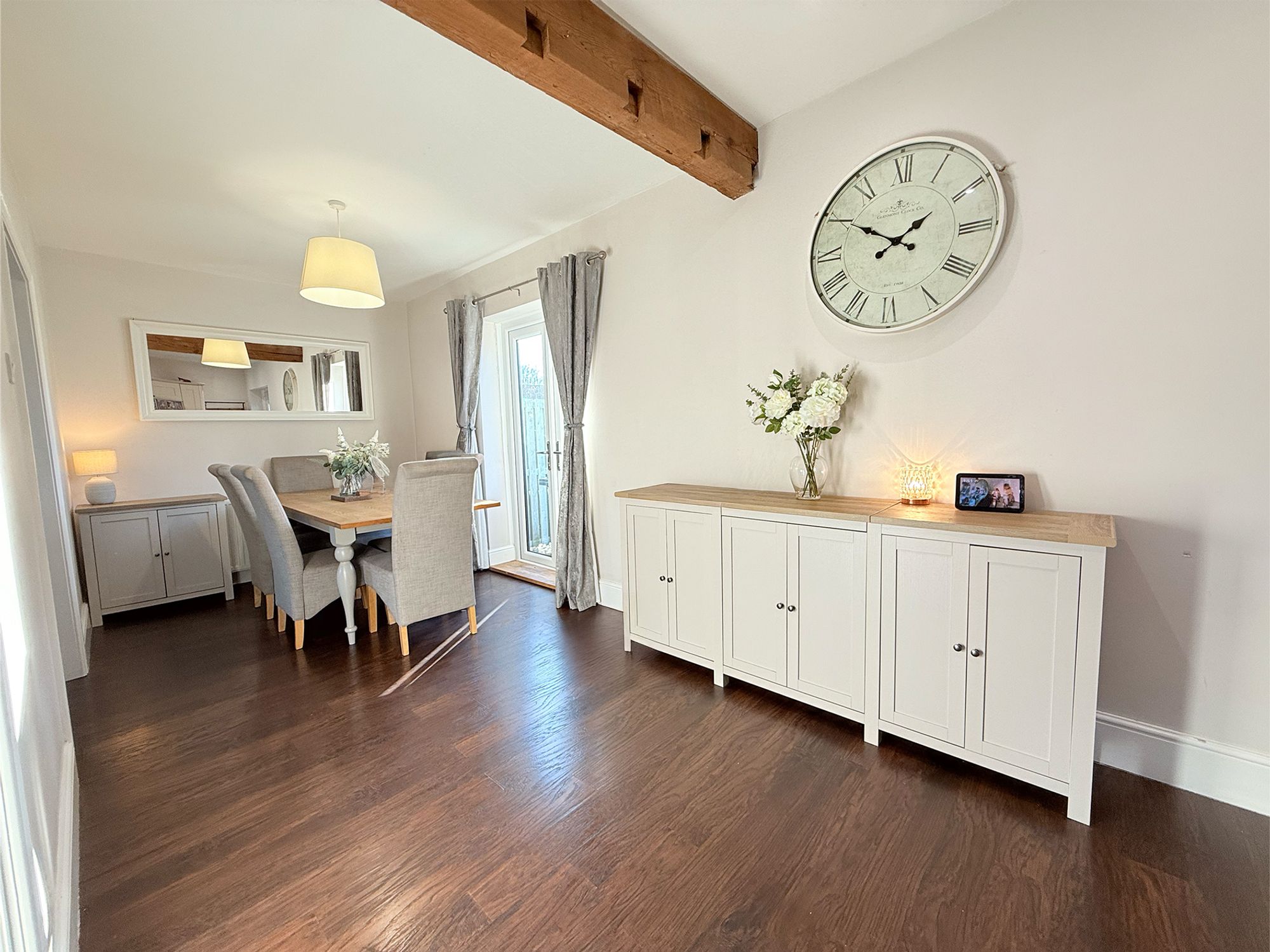 This impressive kitchen diner spans the full depth of the property and forms the true heart of the home. Fitted with classic shaker-style units, granite worktops, and wood-effect laminate flooring, the space blends character with modern practicality. The kitchen is well equipped with an integrated dishwasher, a freestanding gas range cooker with seven-ring hob, and a dedicated space for an American-style fridge freezer. A farmhouse sink with chrome mixer tap sits neatly within the worktops, while stunning exposed wooden beams add warmth and charm throughout.