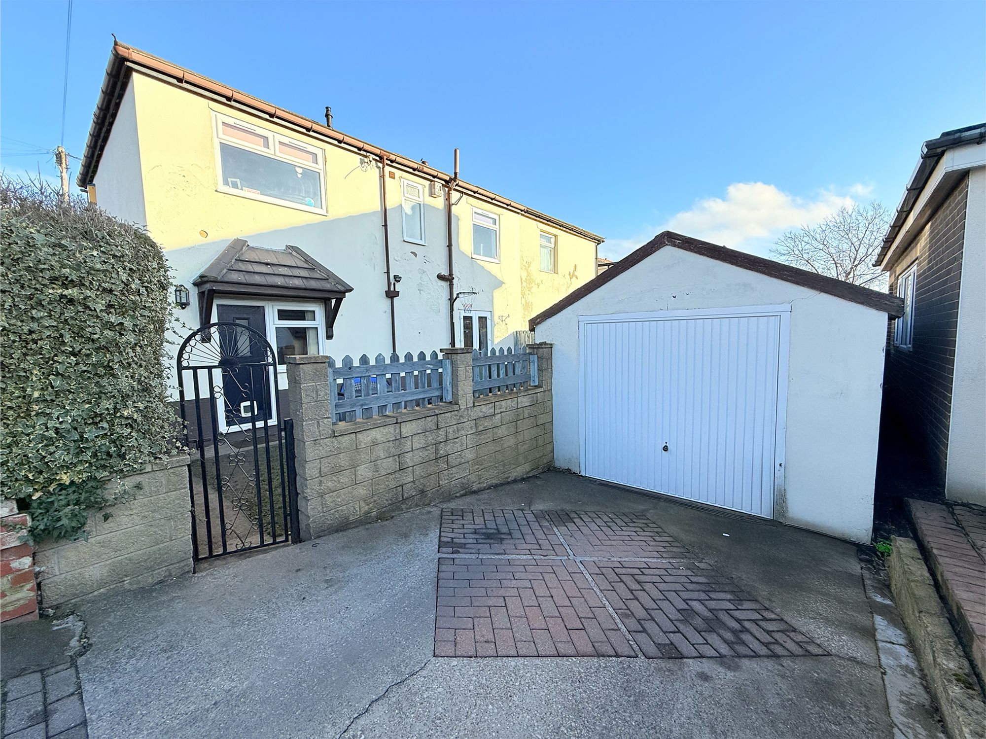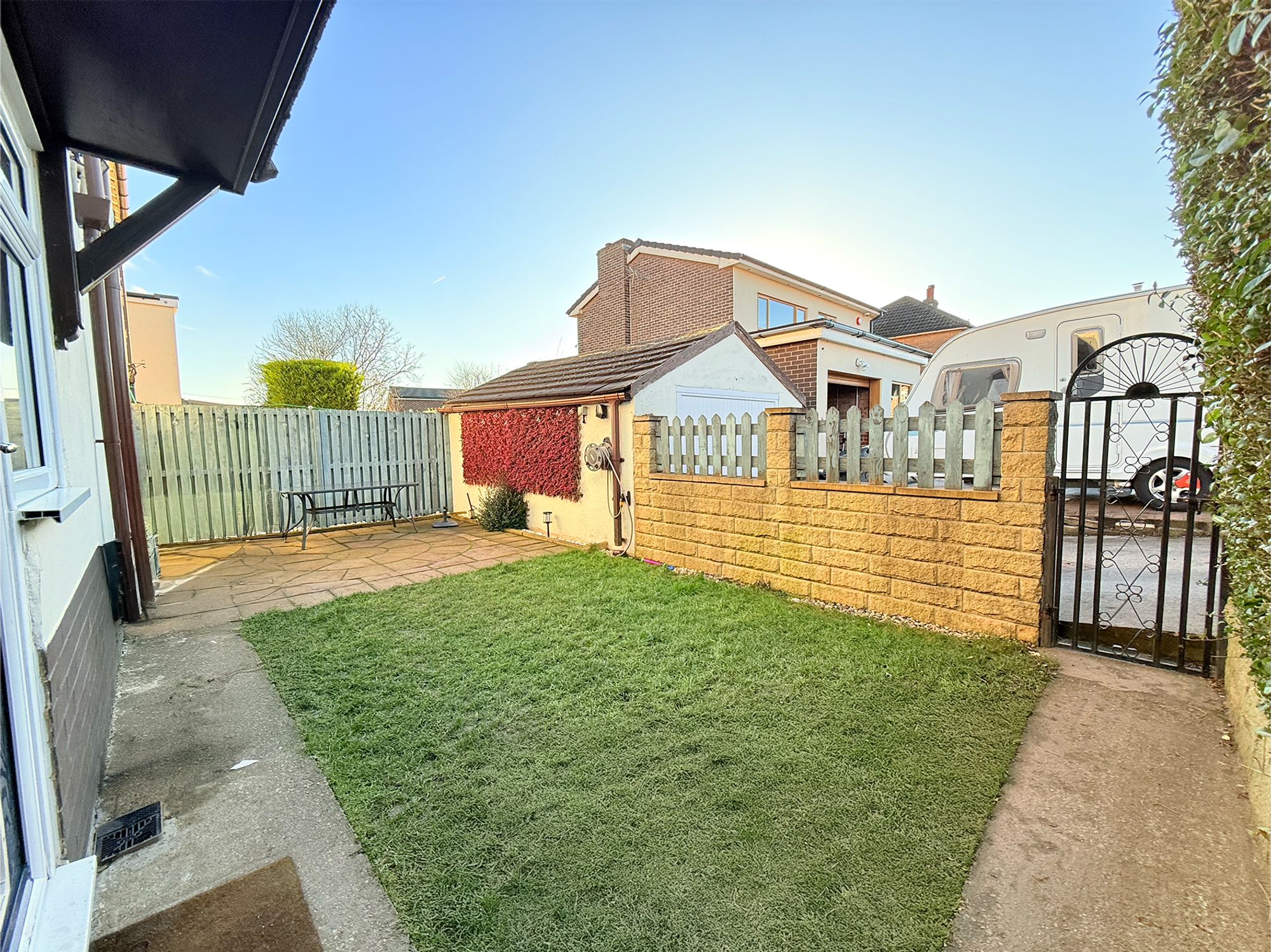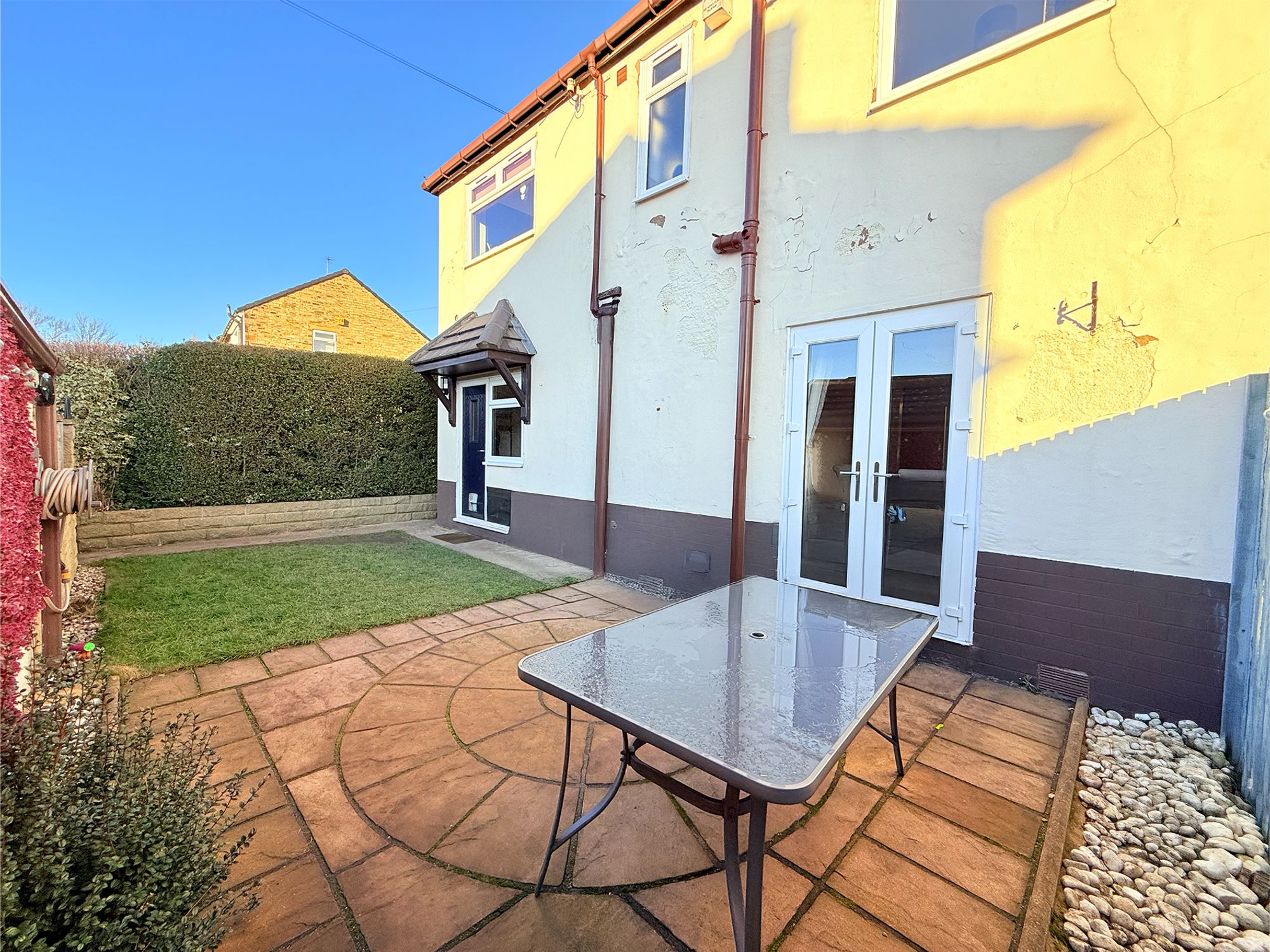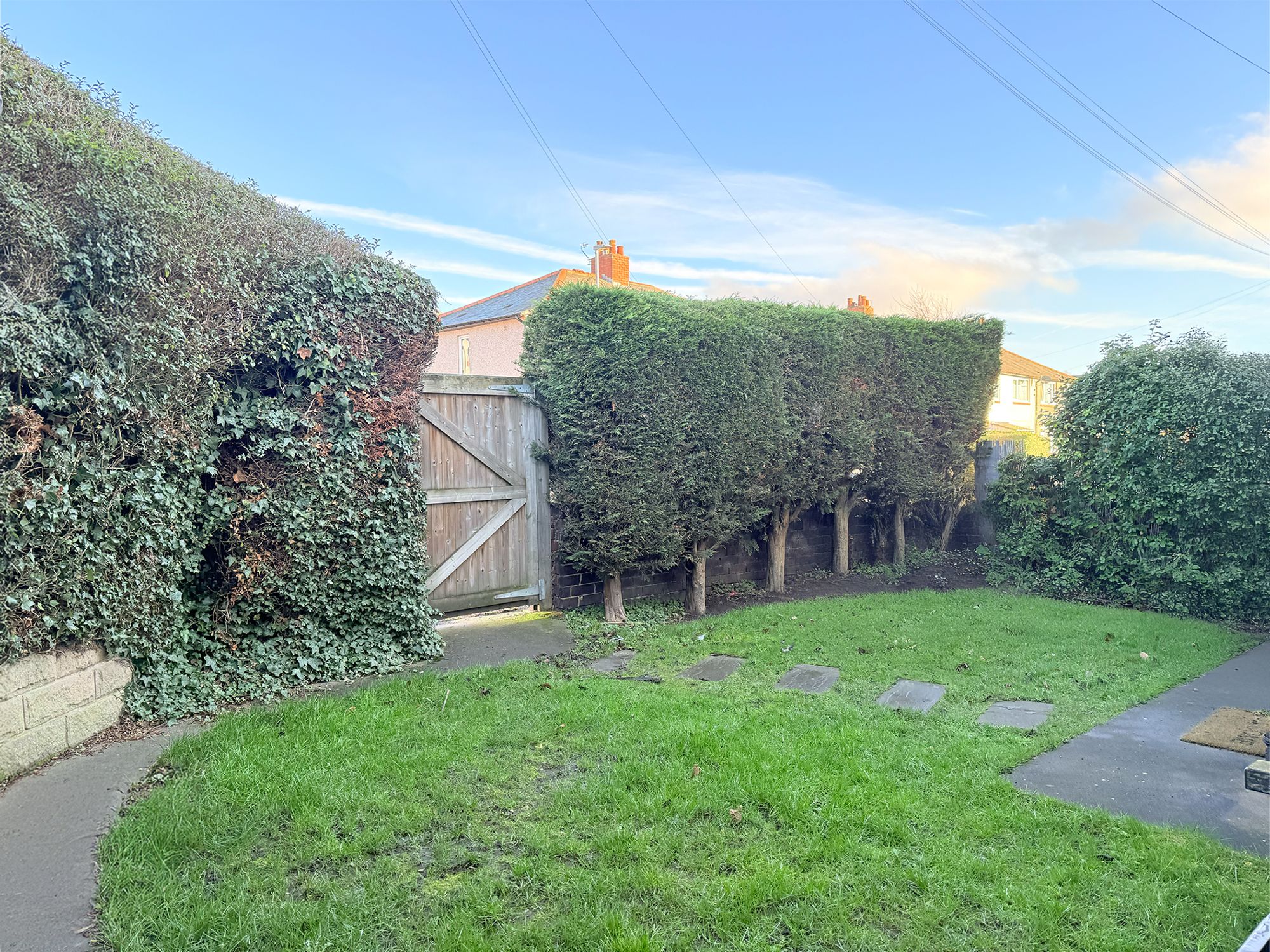 The rear garden is mainly laid to lawn and flows seamlessly onto a stone-flagged patio area, bordered by pebbled plant beds, an ideal space for outdoor dining and relaxation. A pathway down the side of the house leads to a private front garden, enclosed by conifer hedging and fencing. This area features a grassed lawn with stone-paved walkways leading to the front door. Both the front and rear gardens are fully enclosed, making them ideal for children and pets.