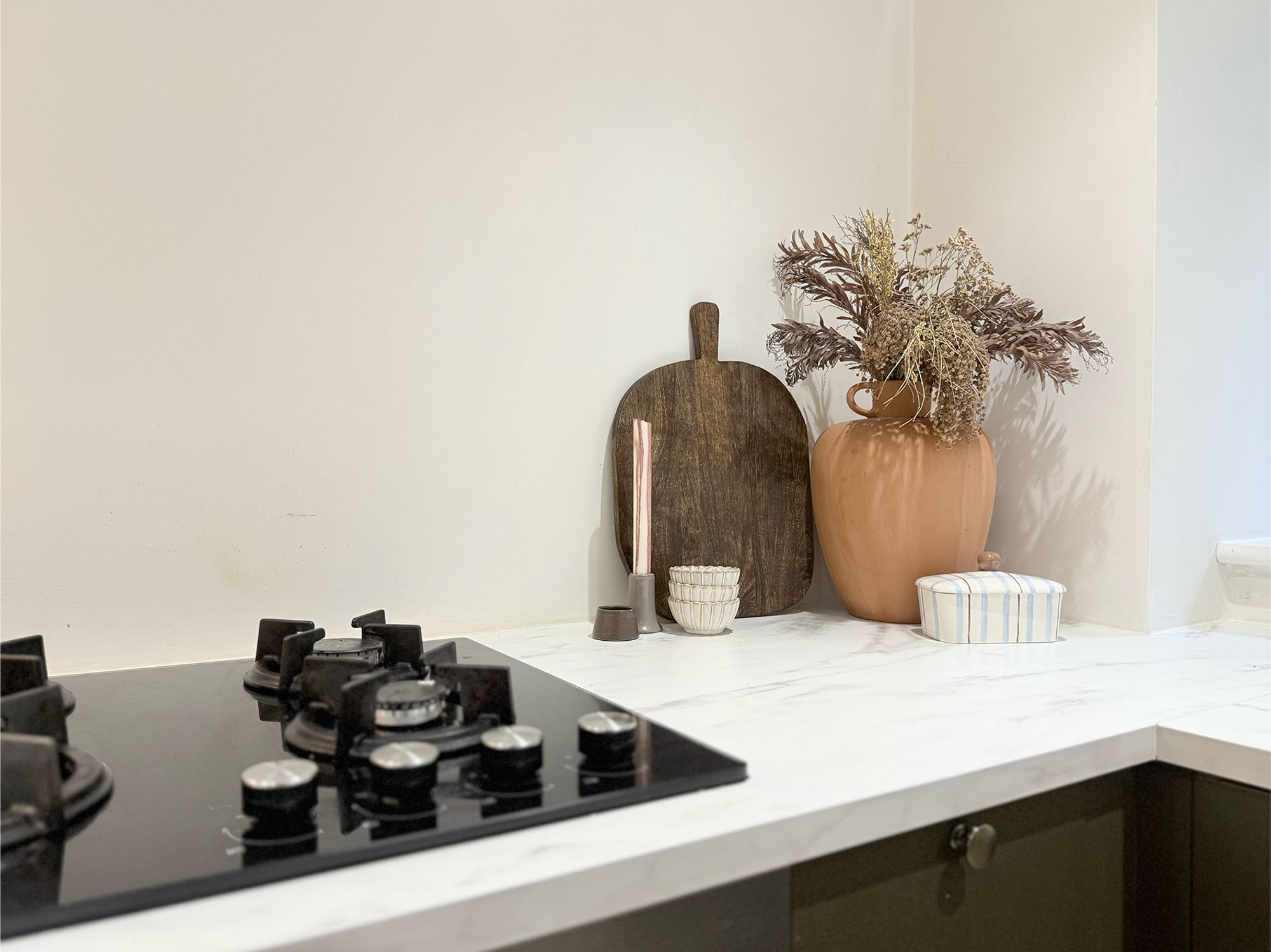 Located to the rear of the property, this sleek modern kitchen offers a stylish yet practical space for everyday living. Finished with contemporary base units topped with elegant marble-effect worktops, the kitchen is both functional and inviting. Features include a kitchen sink with an eye-catching gold mixer tap, an electric oven, a four-ring gas hob, and integrated appliances including a fridge and dishwasher, creating a clean and streamlined finish ideal for modern family life.