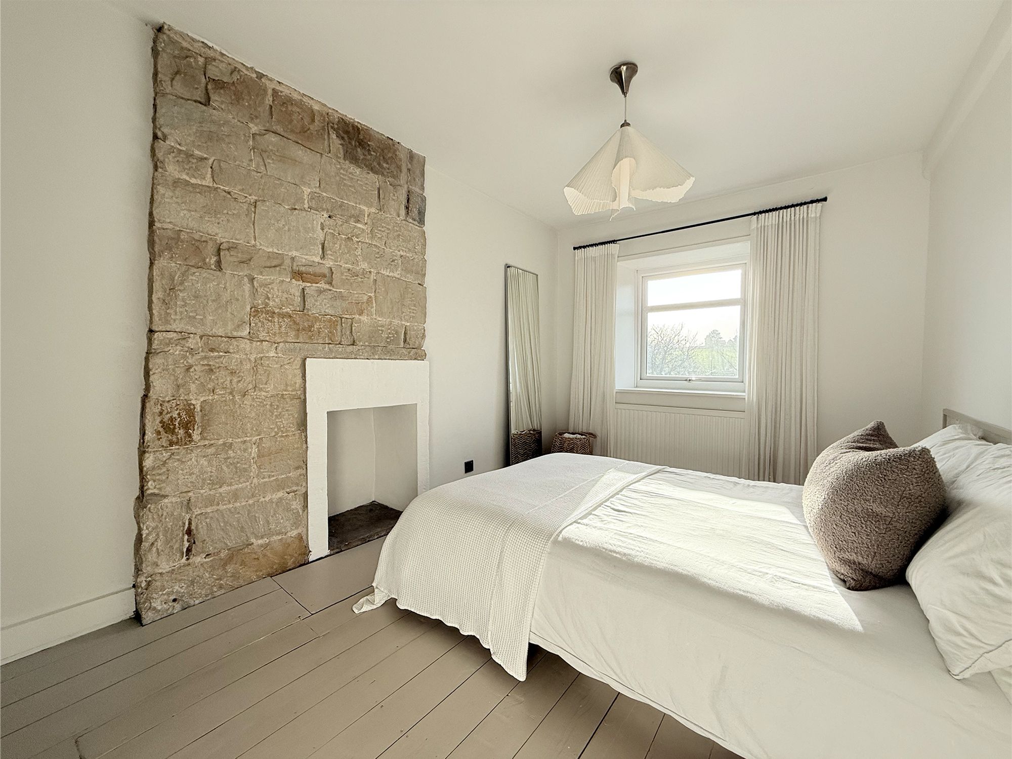 A spacious principal bedroom located at the front of the property, beautifully presented and full of character. The room features an exposed stone decorative fireplace and painted wooden flooring, creating a warm and inviting atmosphere. Neutrally decorated throughout, it further benefits from floor-to-ceiling built-in wardrobes and a bespoke built-in feature headboard, offering both style and excellent storage.