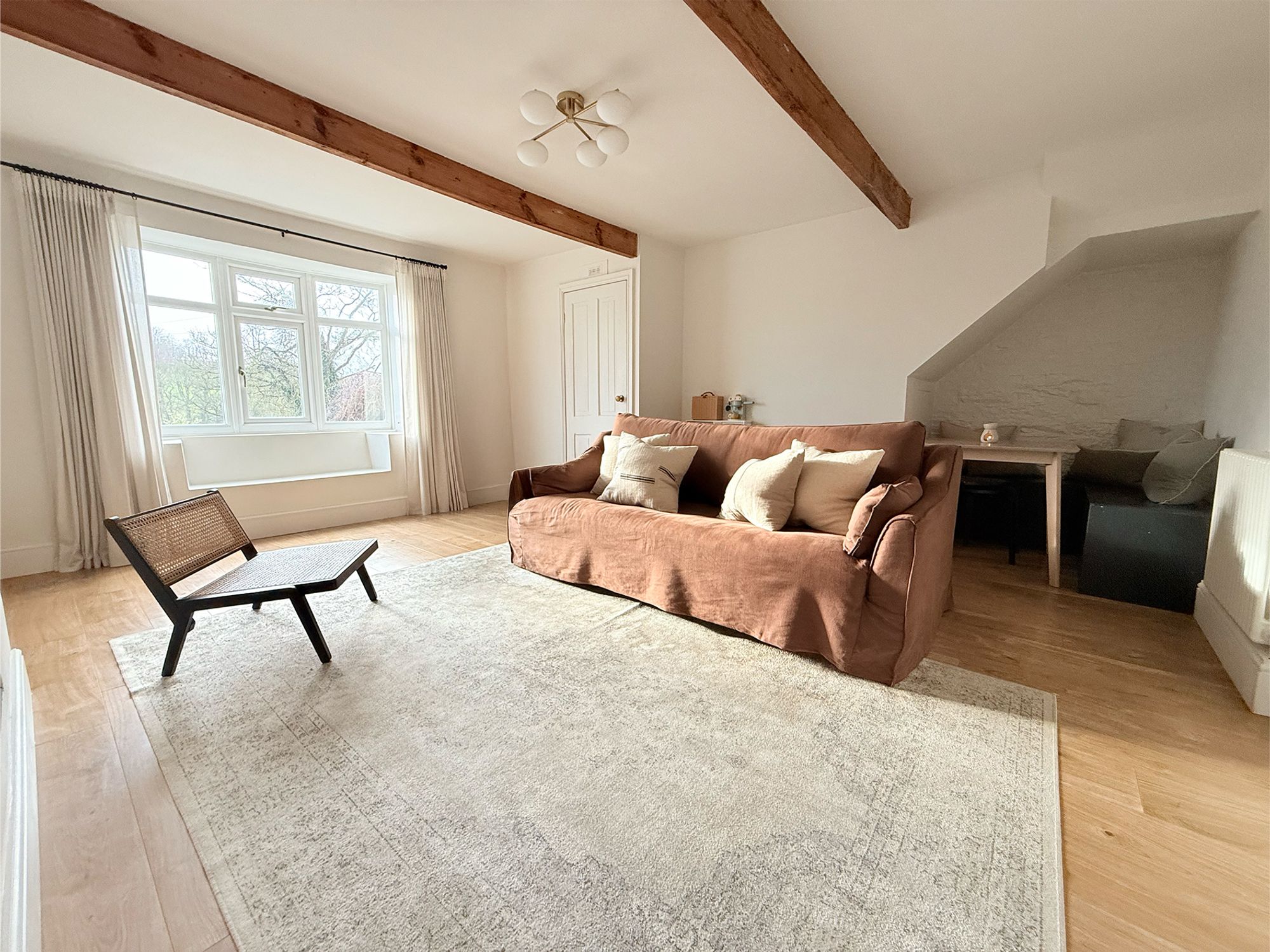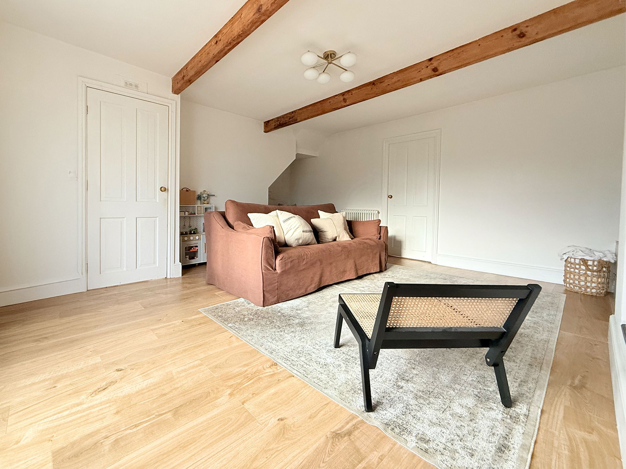An exceptionally spacious and inviting living area, finished in the same wood-effect laminate flooring as the entrance hall to create a seamless flow through the home. The room is neutrally styled and filled with natural light from the bay window, beneath which a charming built-in seating area provides the perfect spot to relax. Exposed wooden ceiling beams add warmth and character, while the decorative chimney breast forms an attractive focal point with a built-in storage unit positioned to one side. Beneath the stairs, an open dining nook with exposed stone wall detailing creates a cosy and versatile space, further enhanced by practical under-stairs storage, making this room ideal for both everyday family living and entertaining.