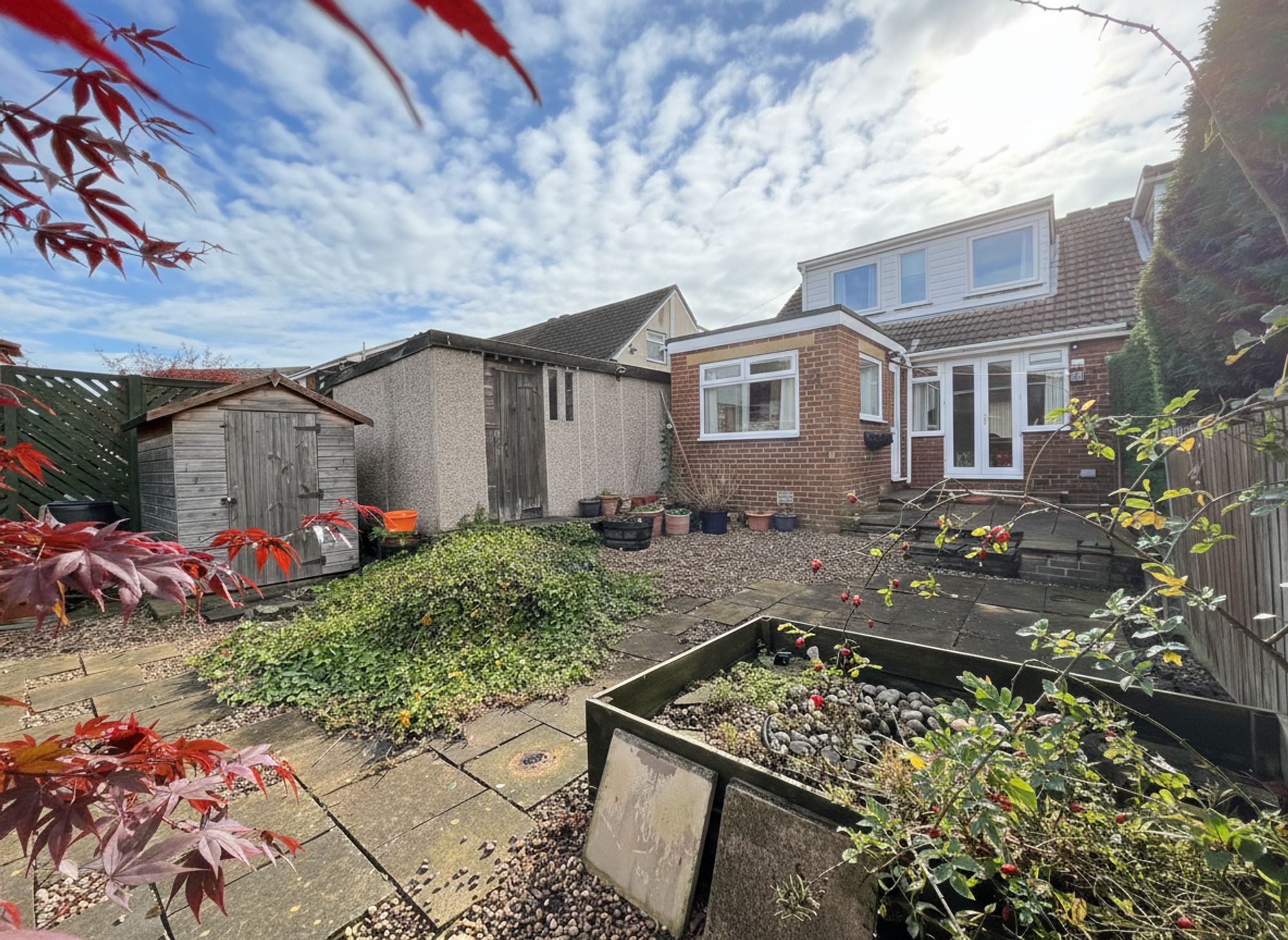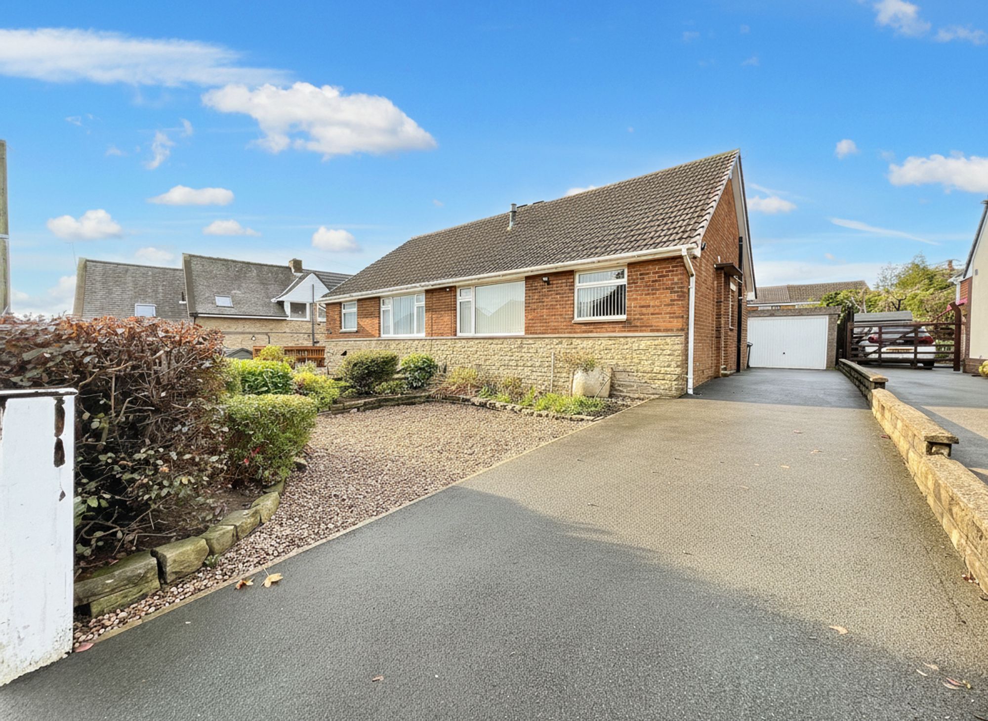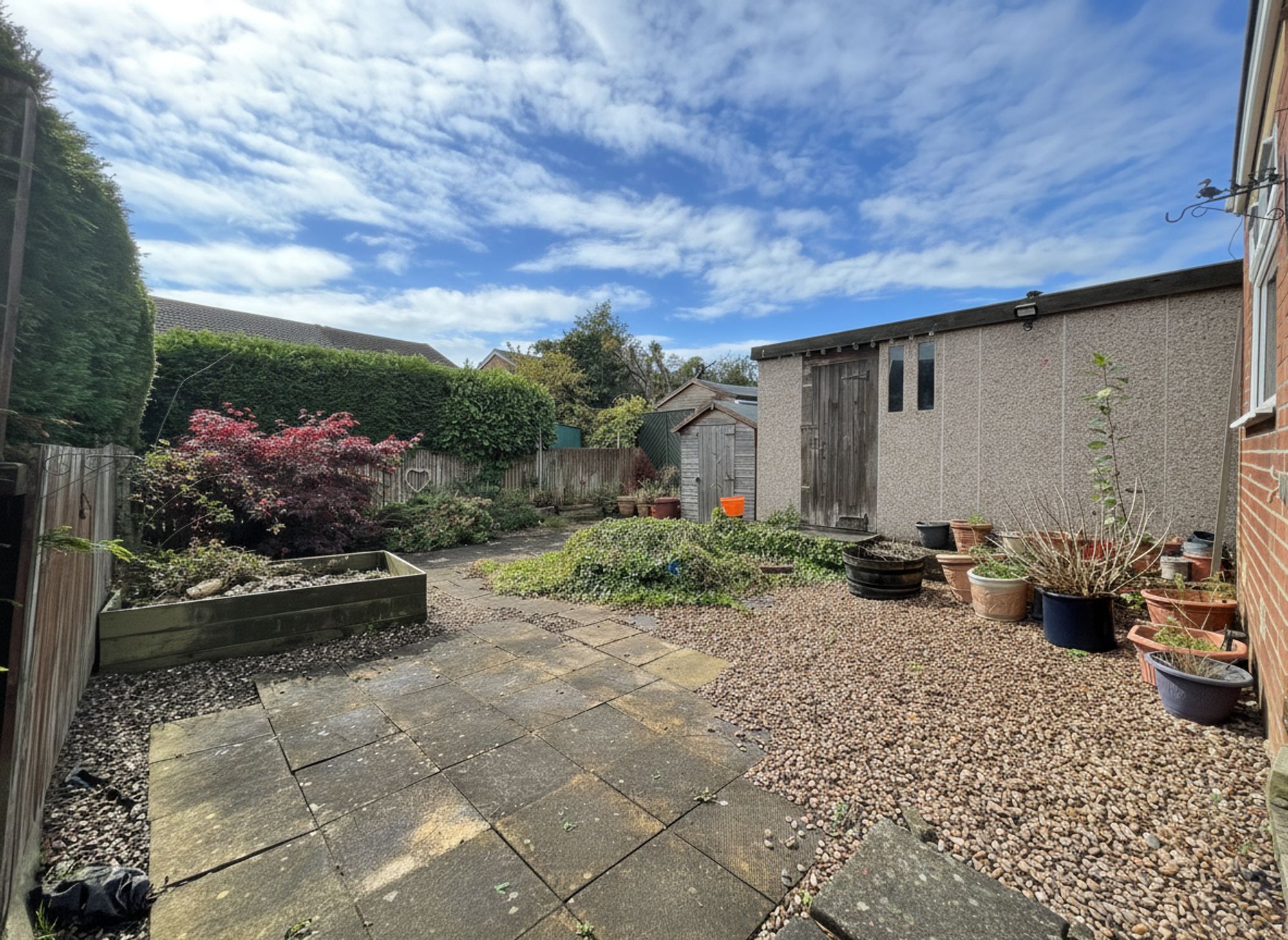 To the front of the property is a large tarmac driveway providing off-road parking for multiple vehicles, leading to the detached single garage. Beside the driveway, an attractive pebbled front garden is neatly trimmed with well-maintained plants and shrubs, adding to the home’s kerb appeal. The rear garden is fully enclosed and enjoys an exceptionally private outlook, courtesy of mature hedging. Designed for low maintenance, it features a combination of flagged patio and pebbled areas, perfect for outdoor dining and relaxation. The garden also includes a large storage shed and a charming wildlife pond, creating a peaceful and inviting outdoor retreat.