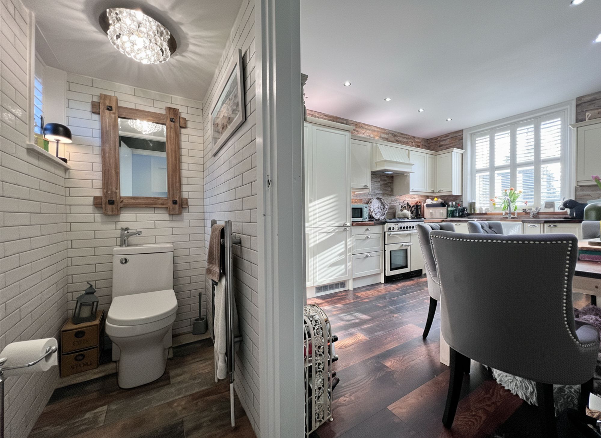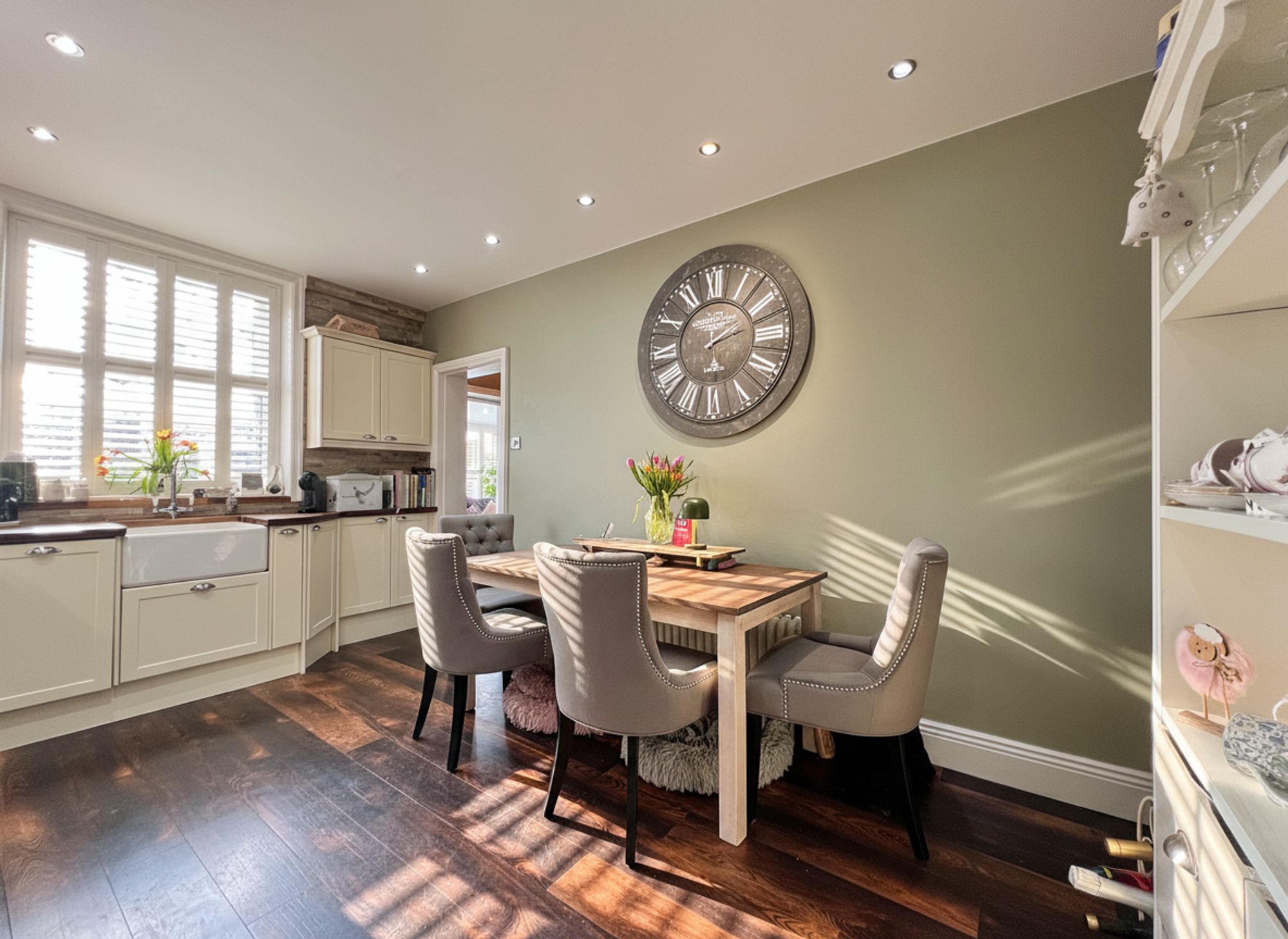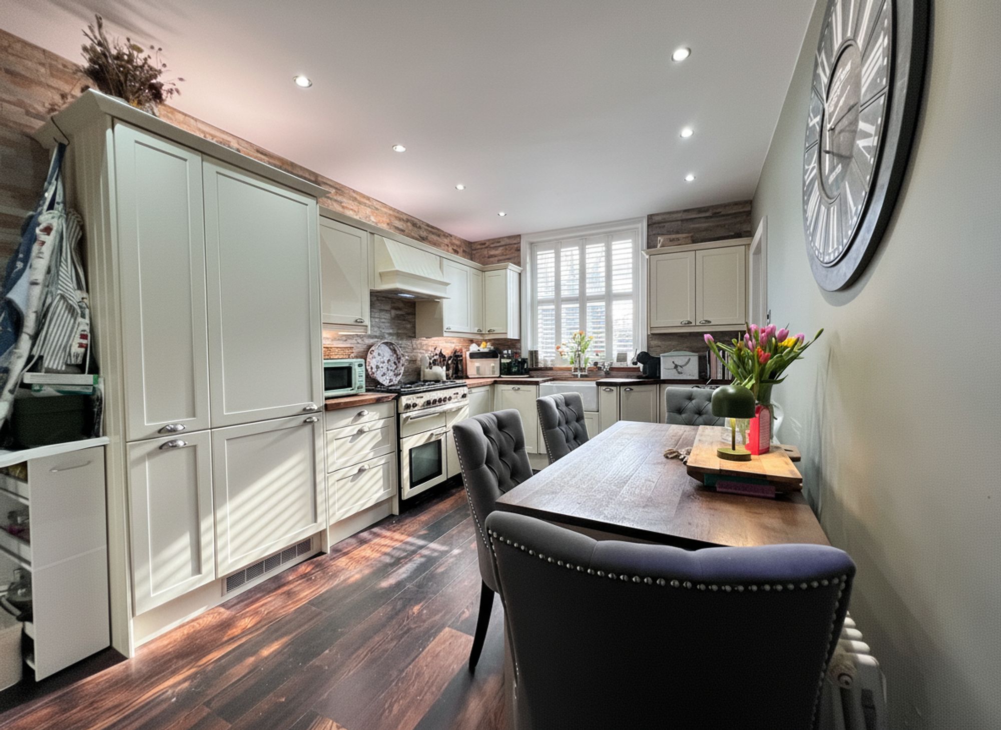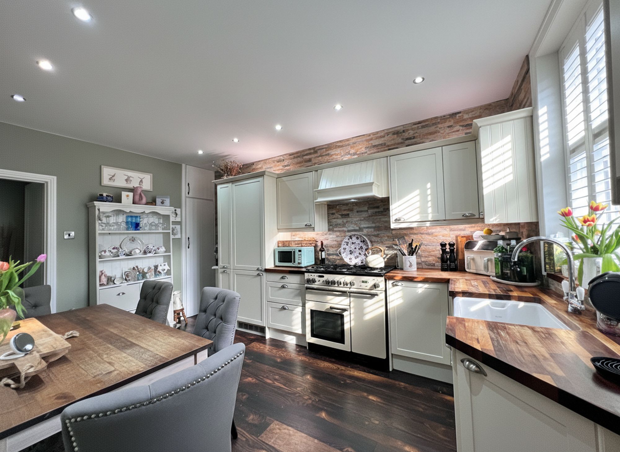 A classic country-style kitchen, beautifully appointed with a range of timeless cream shaker units paired with solid wood work surfaces, creating a warm and inviting heart of the home. Integrated appliances include a fridge freezer and slimline dishwasher, while a traditional Belfast sink with mixer tap enhances the characterful aesthetic. The current vendor will be leaving the range cooker, perfectly complementing the country theme. Cleverly designed doors reveal additional hidden storage, and the room offers ample space to accommodate a family-sized dining suite, making it both practical and wonderfully sociable.