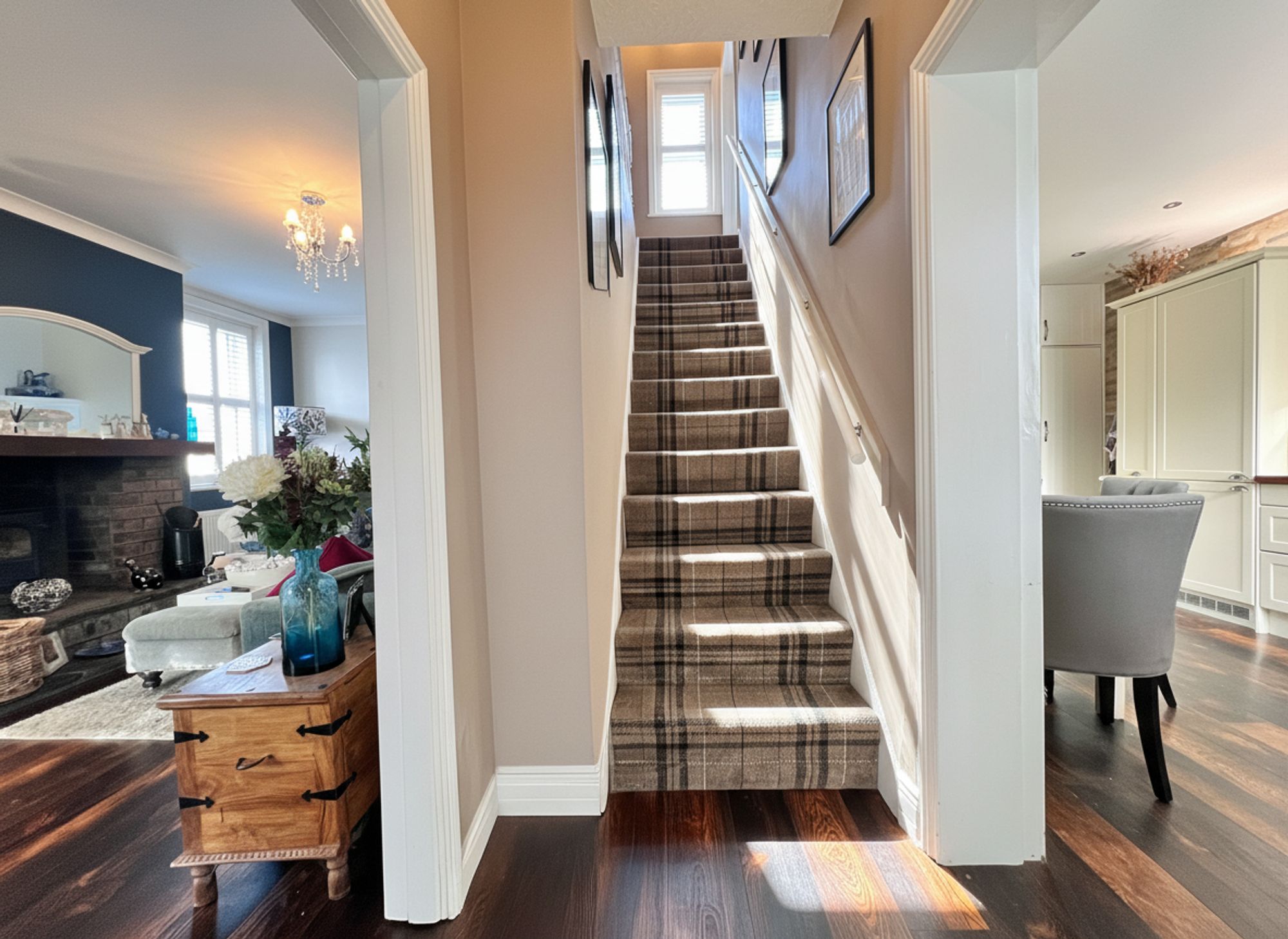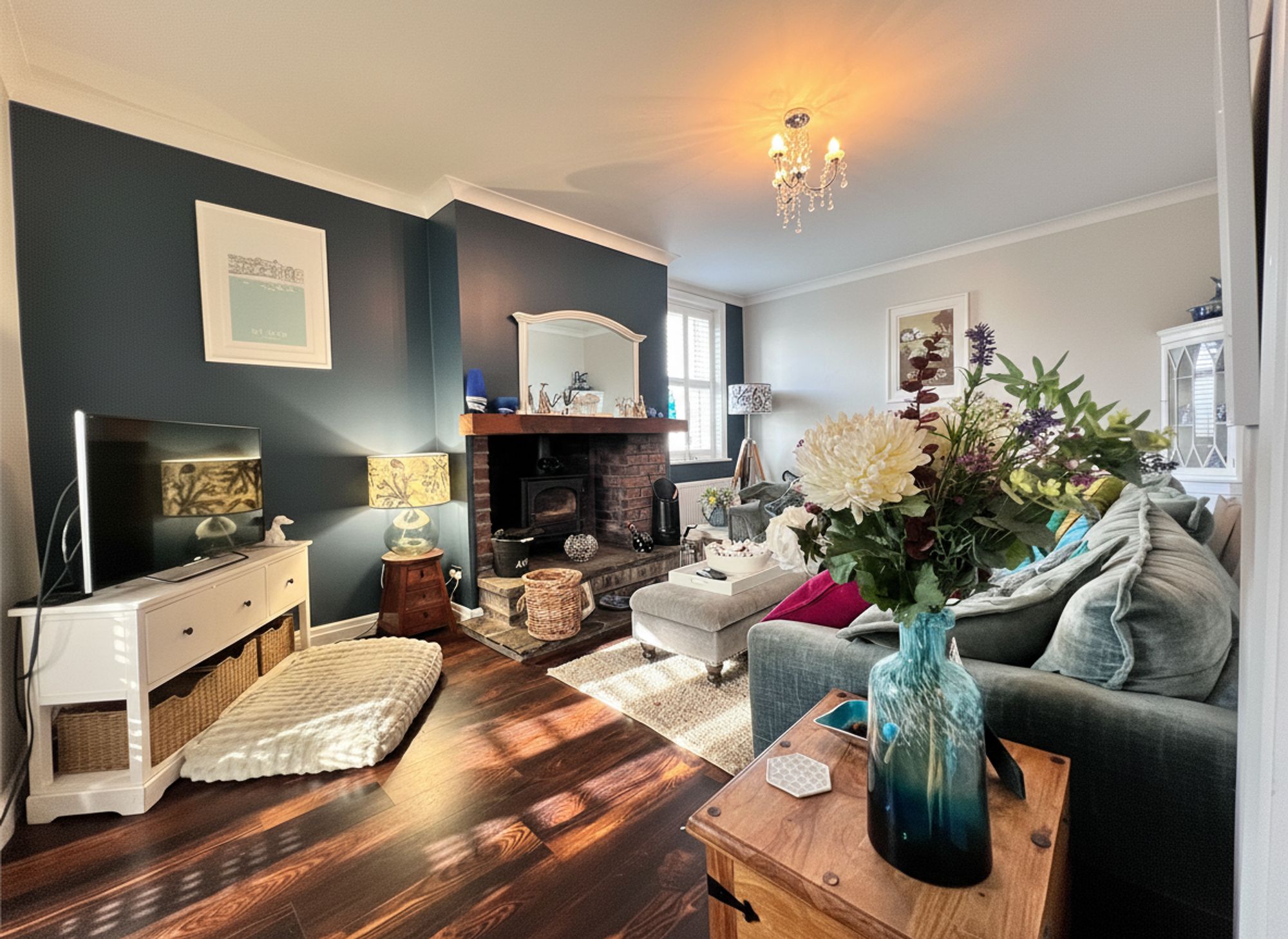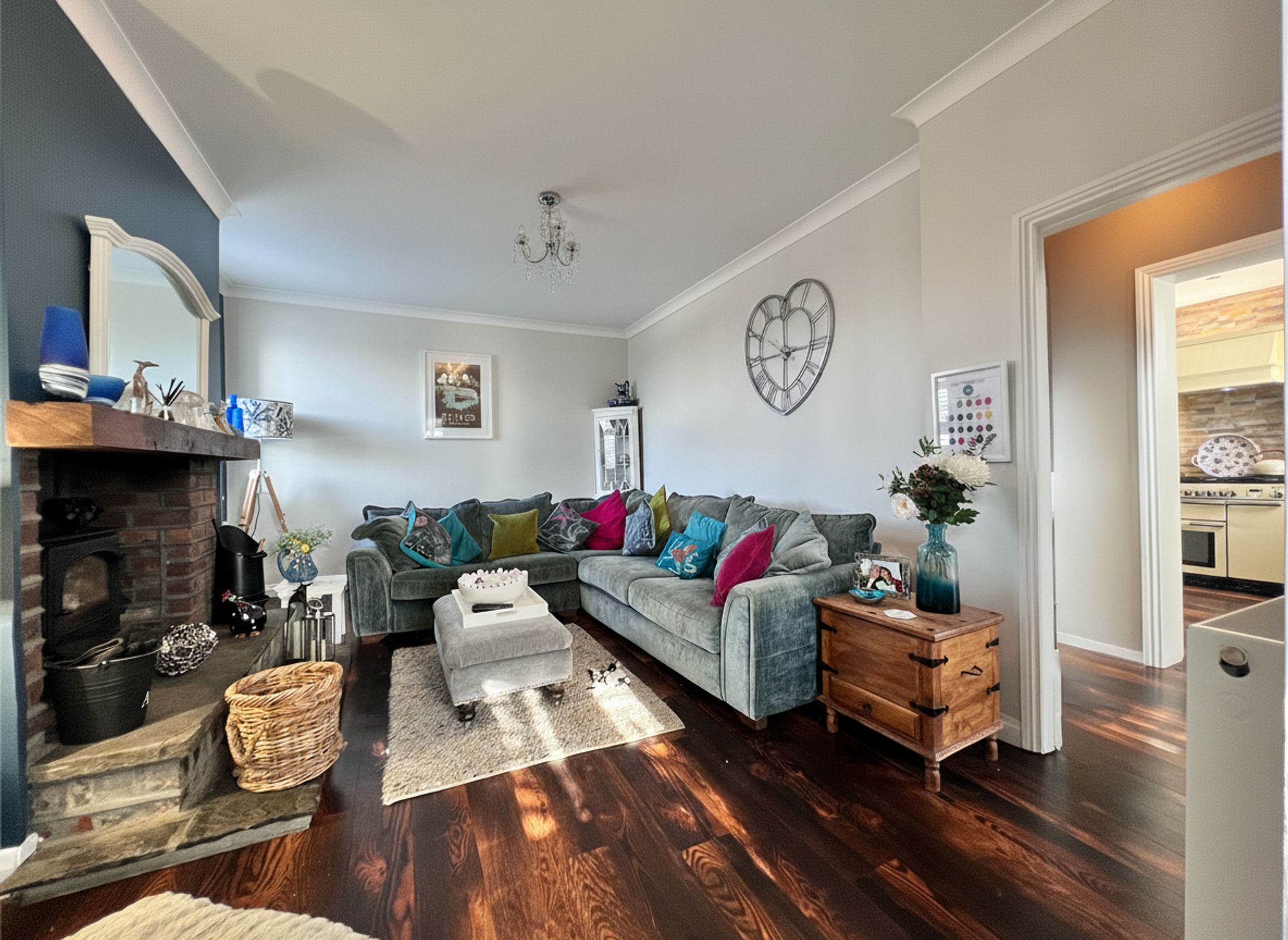 A beautifully styled and recently redecorated lounge, enhanced by the continuation of elegant LVT flooring that flows seamlessly throughout the ground floor, creating a cohesive and contemporary finish. The striking focal point of the room is a multi-fuel inglenook stove, housed within an impressive exposed stone and brick fireplace, delivering both warmth and character while forming a stunning centrepiece to this inviting living space.